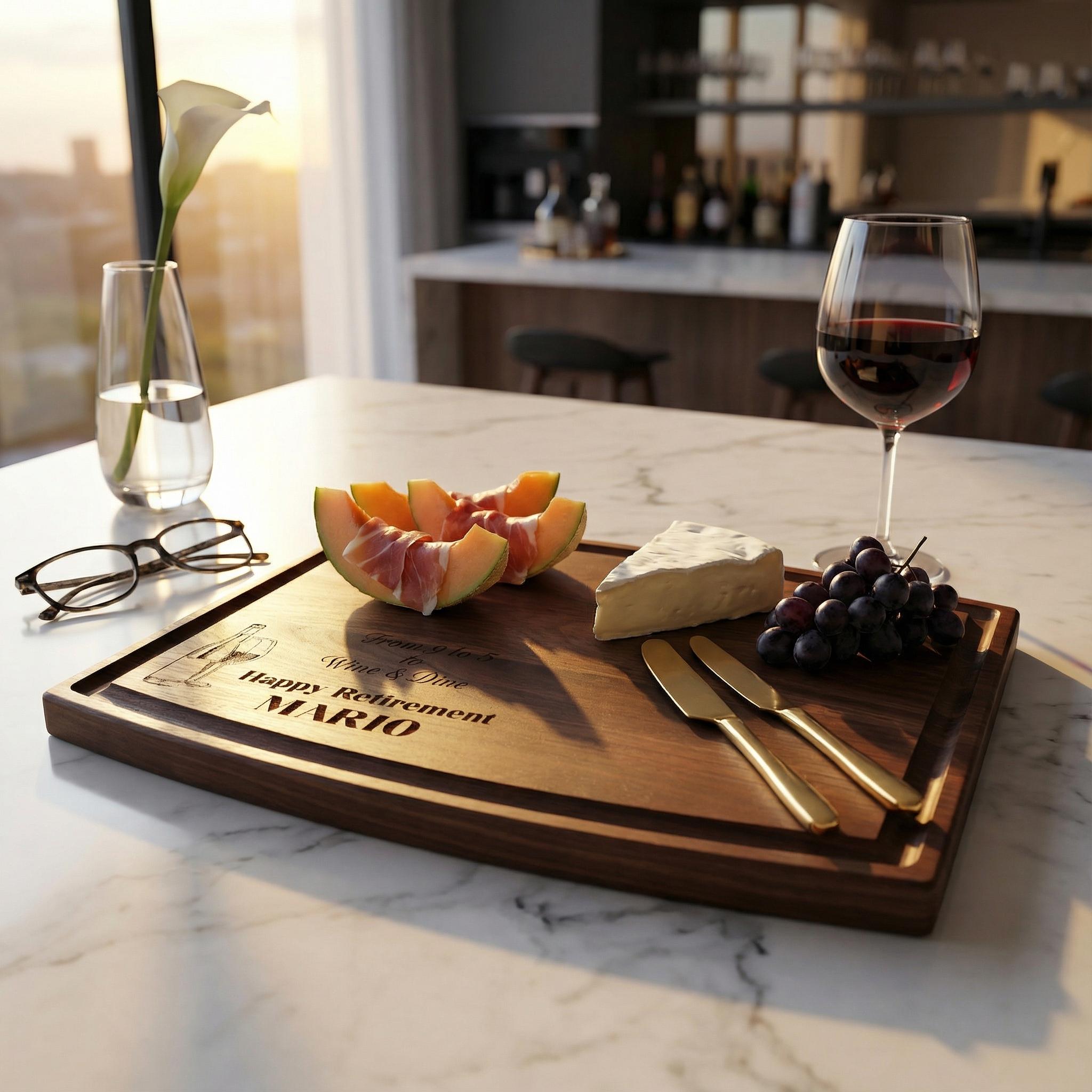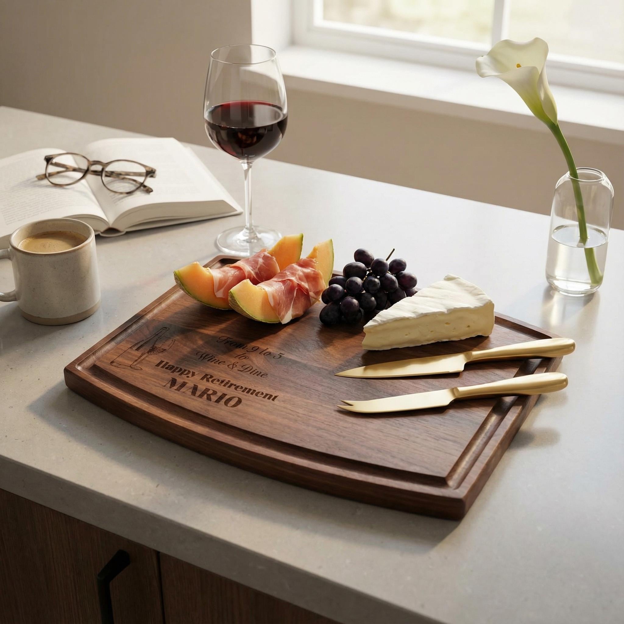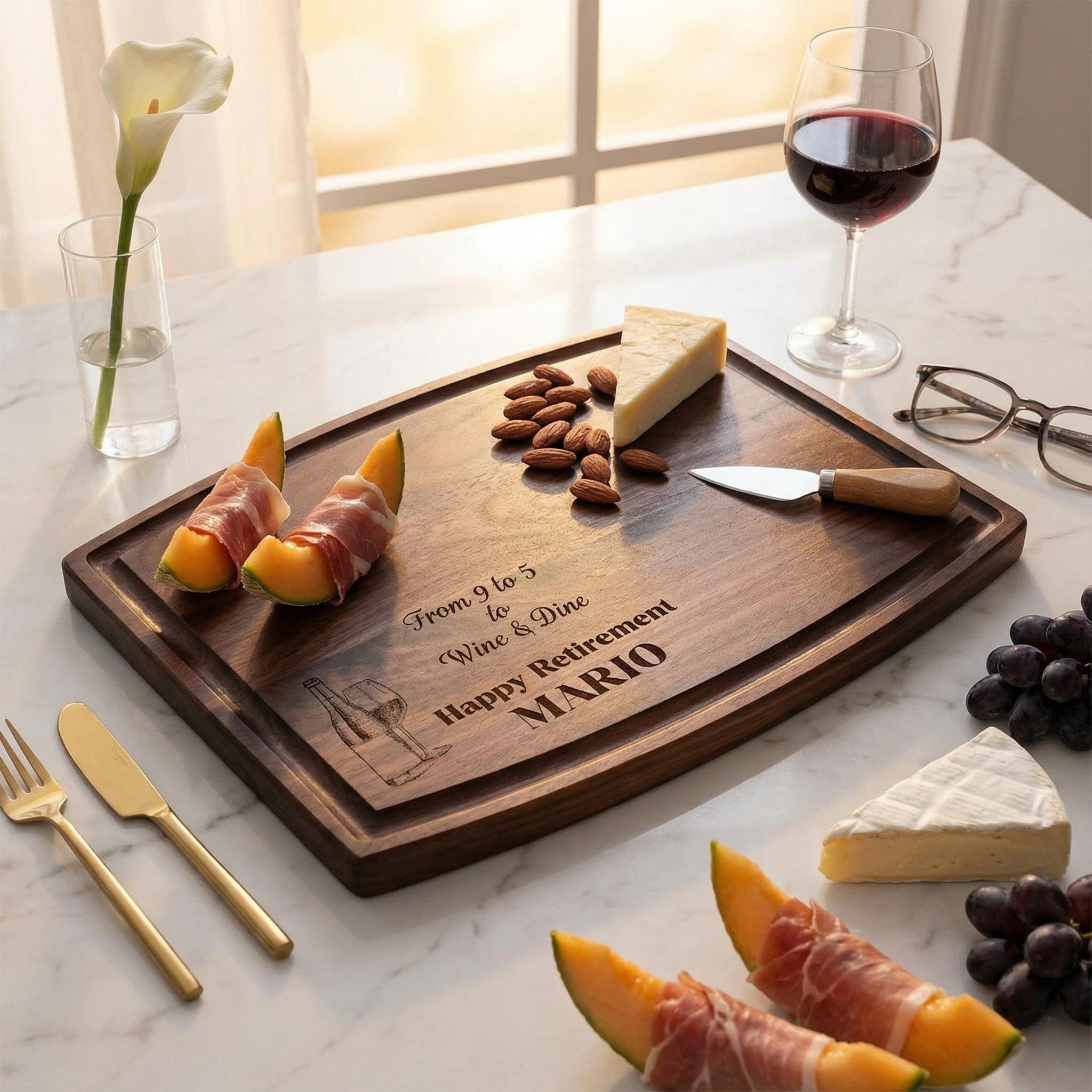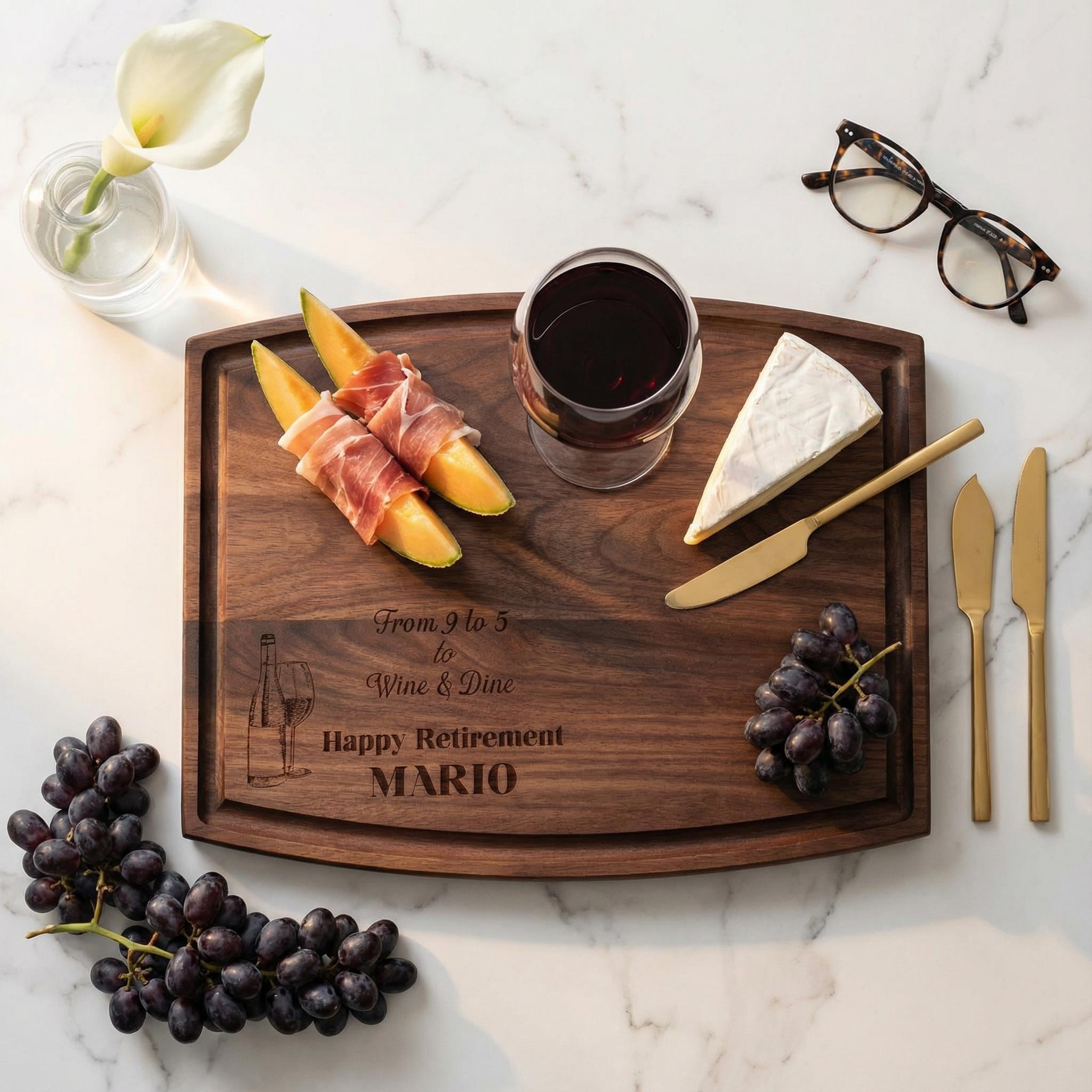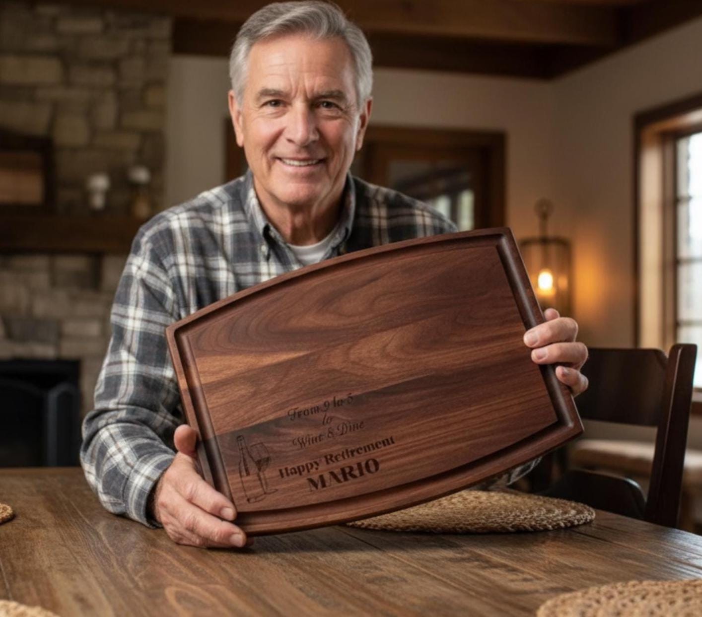 More than just a cutting tool—this personalized board serves as both a functional kitchen essential and a decorative piece, perfect for the newly retired to use for future gatherings.