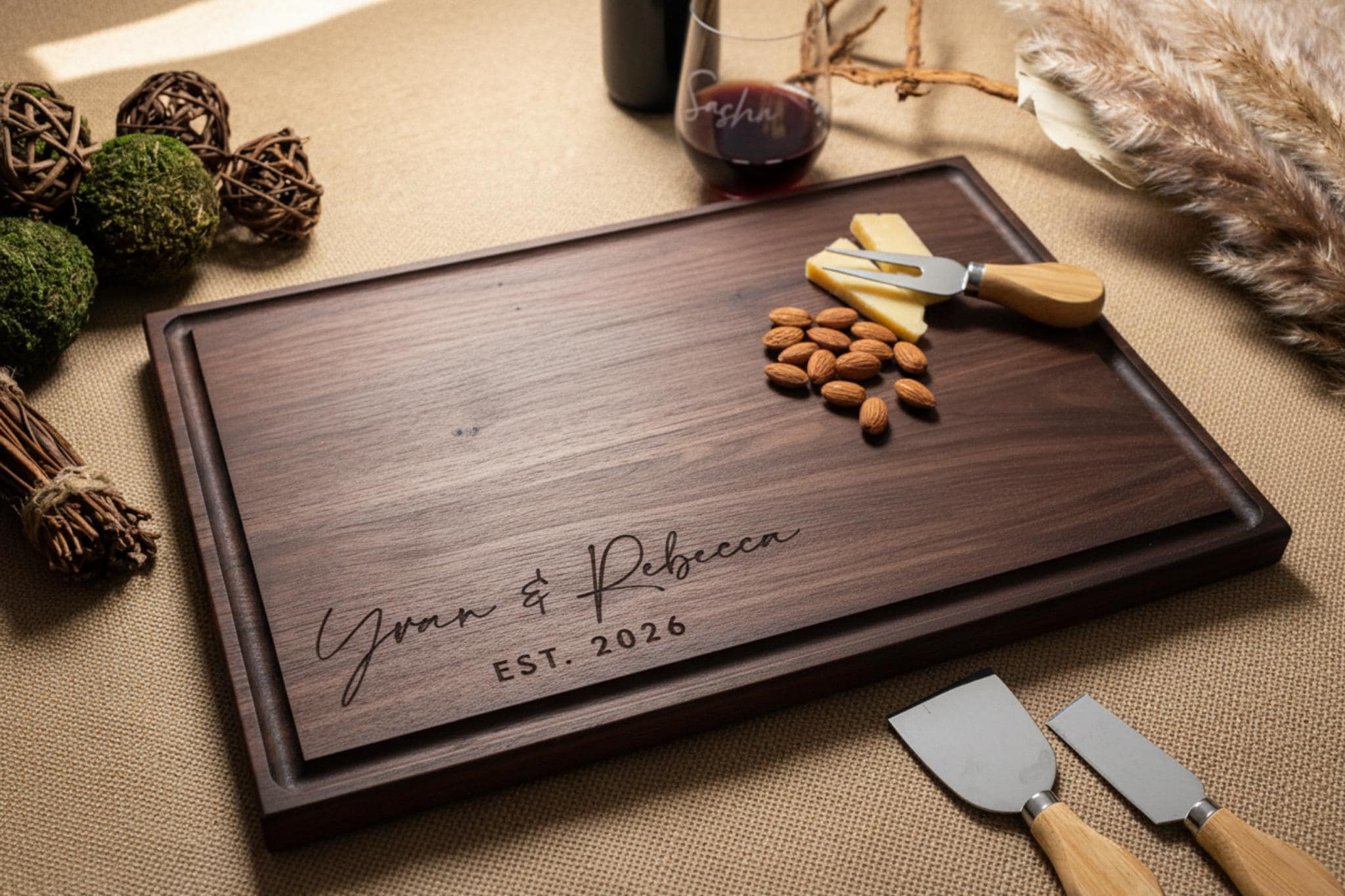 Beautiful laser engraved personalization with the couple’s names and a special date, creating a lasting memento of their unique love story.