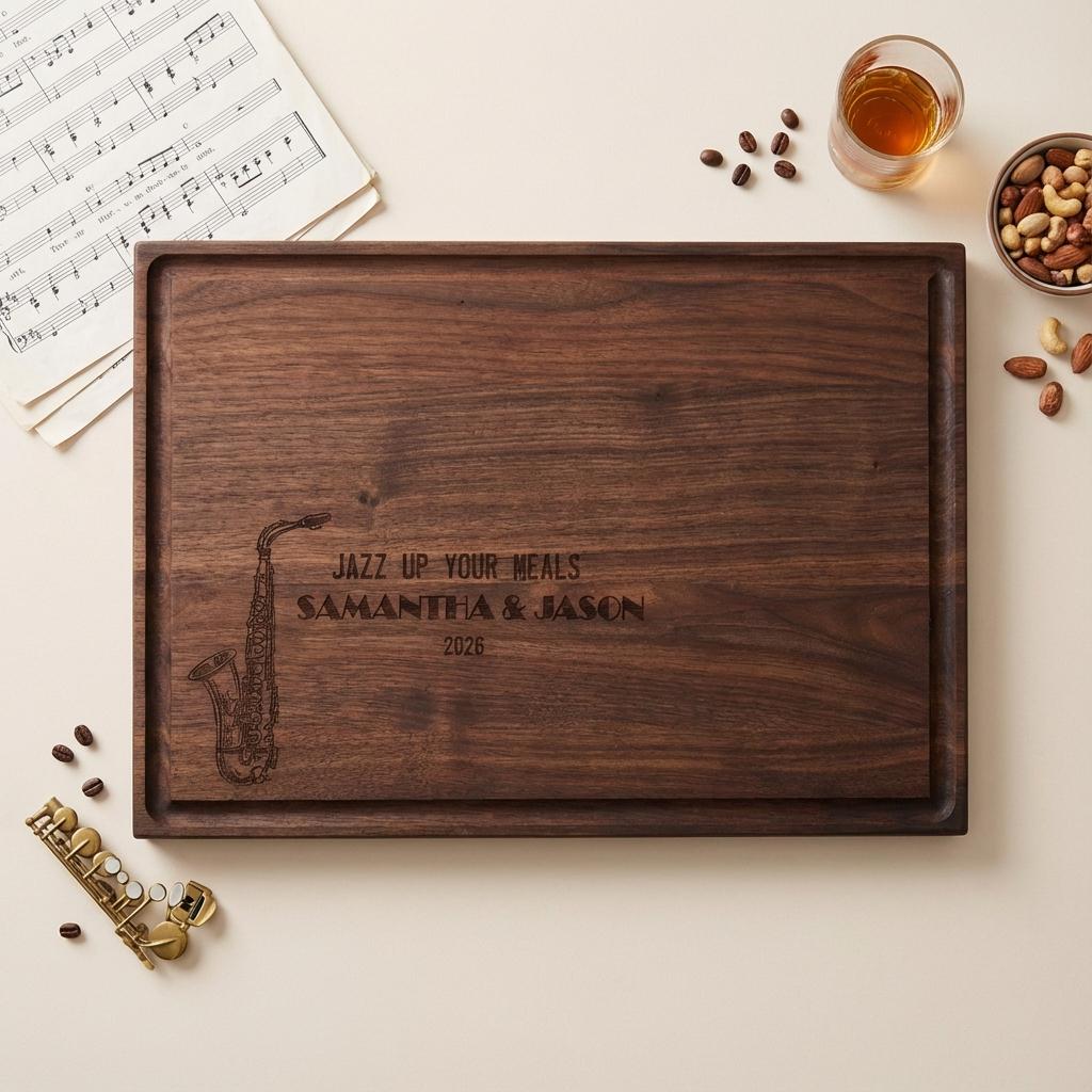 Add some rhythm to their kitchen with this personalized cutting board. Featuring the clever 'Jazz Up Your Meals' engraving and a deep juice groove, this walnut charcuterie board is the ultimate jazz lover gift or saxophone player present