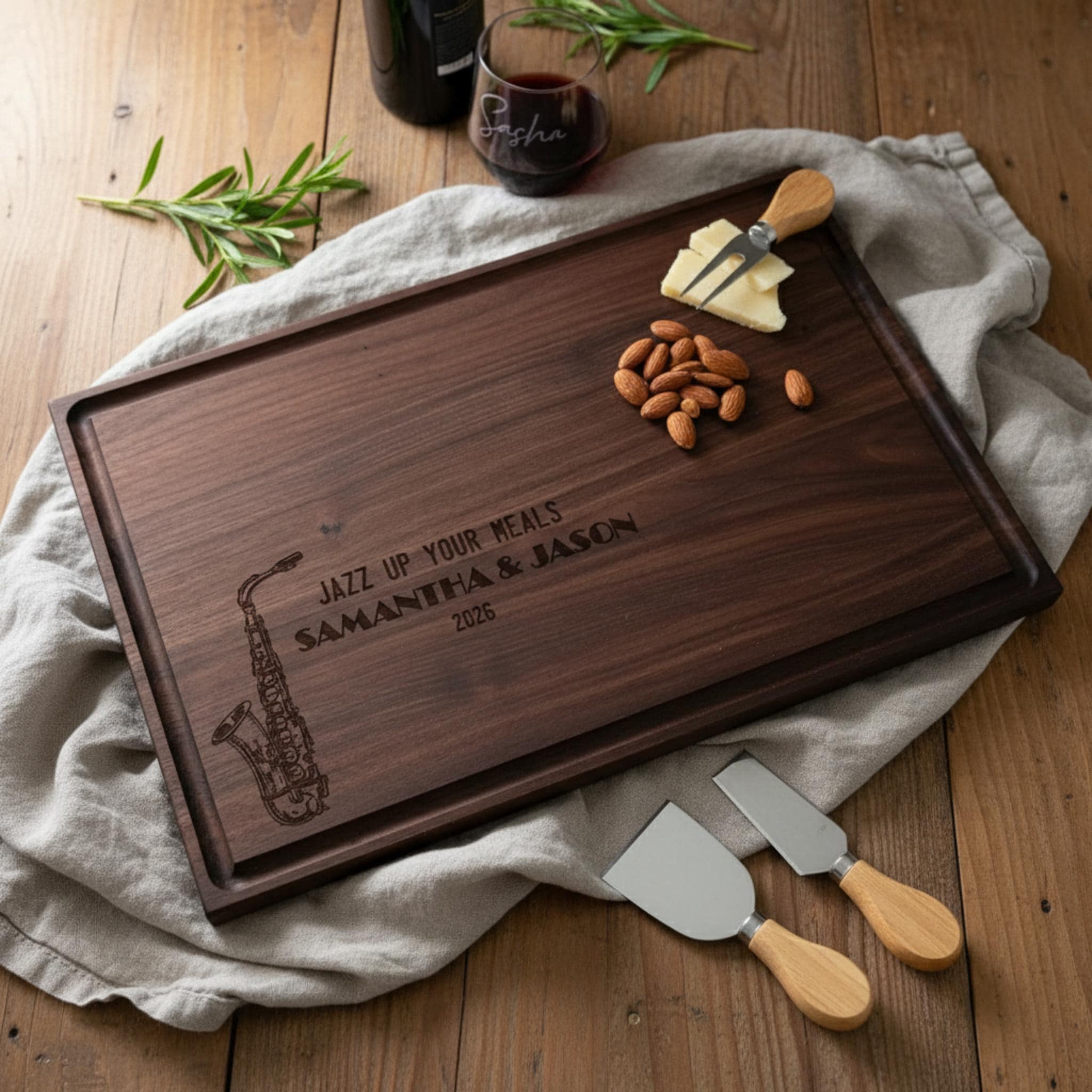 Personalized Cutting Board, Jazz: Custom Engraved Charcuterie Board, Saxophone Theme, Couples Gift, Housewarming Gift, Engagement Gift