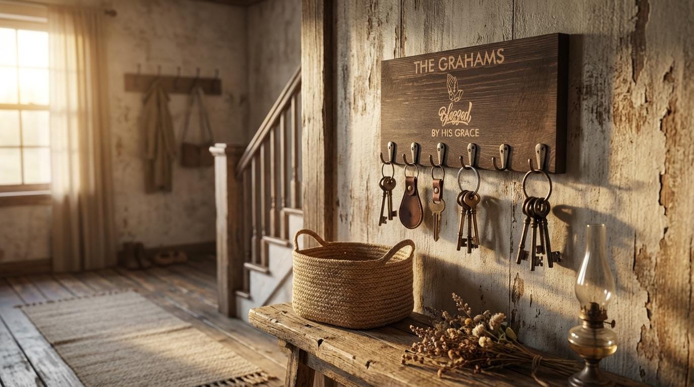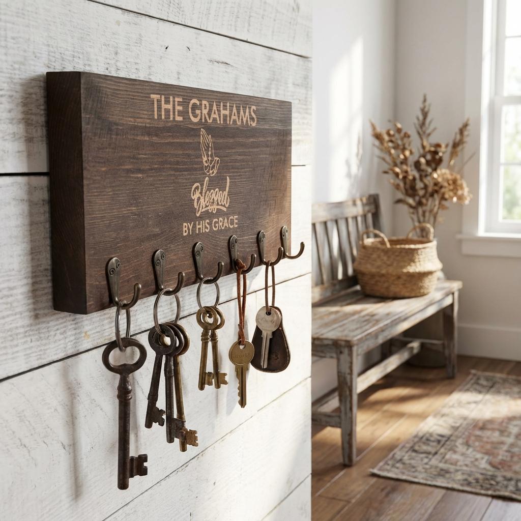 Enhance your home’s entrance with a key holder that gracefully merges rustic charm, spiritual inspiration, and personalized elegance. Order yours today, and let your entryway share a story of faith, blessings, and welcome!
