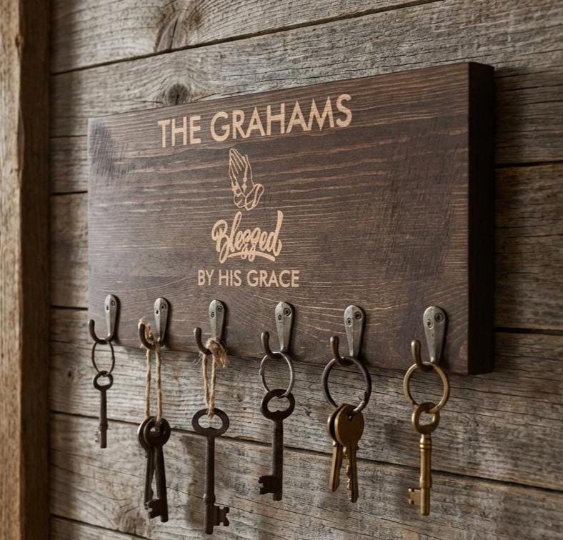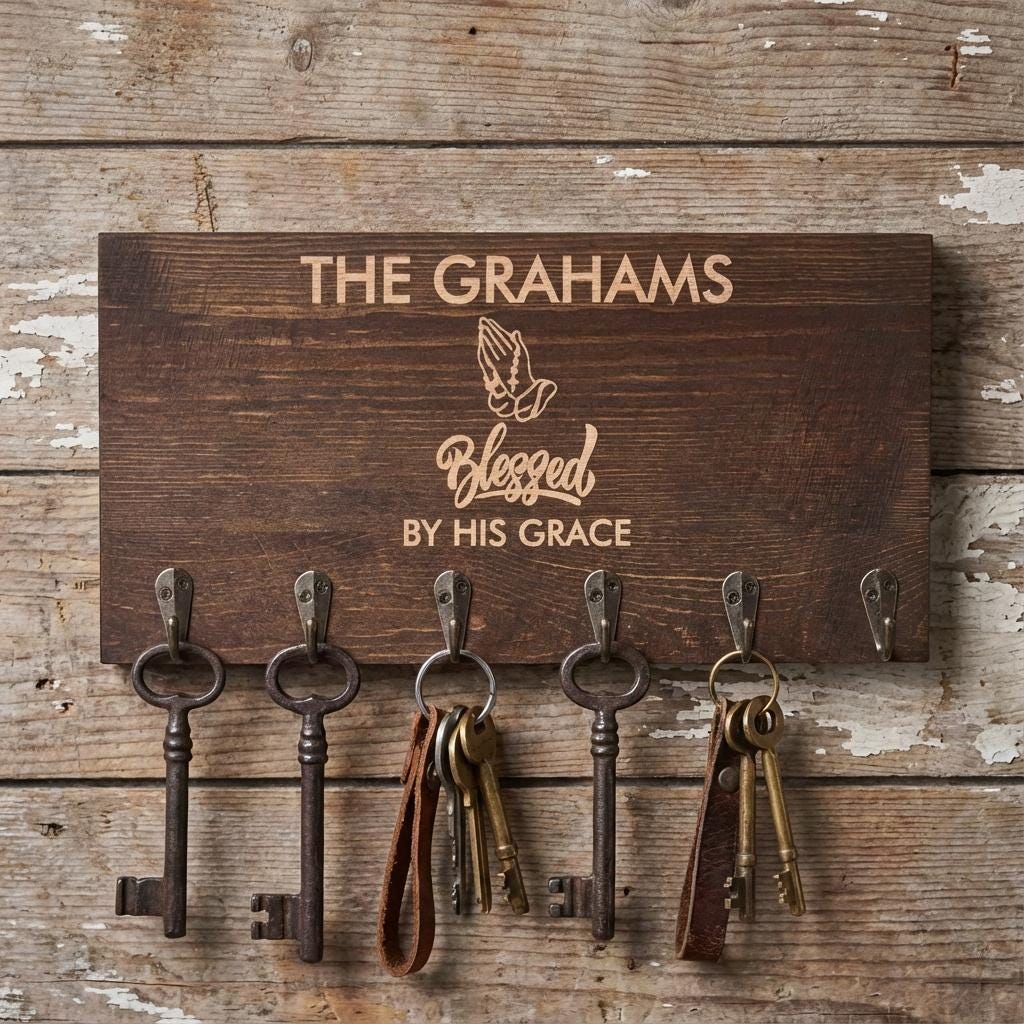 Christian Home Decor | Personalized Key Holder for Wall & "Blessed By His Grace" Housewarming Gift