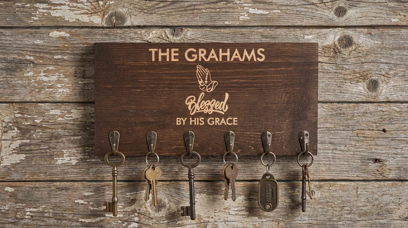 Bless their new home with this personalized Christian key holder. Featuring the inspiring 'Blessed by His Grace' engraving and a rustic wood finish, this entryway key rack is the ultimate religious housewarming gift or wedding present for couples.