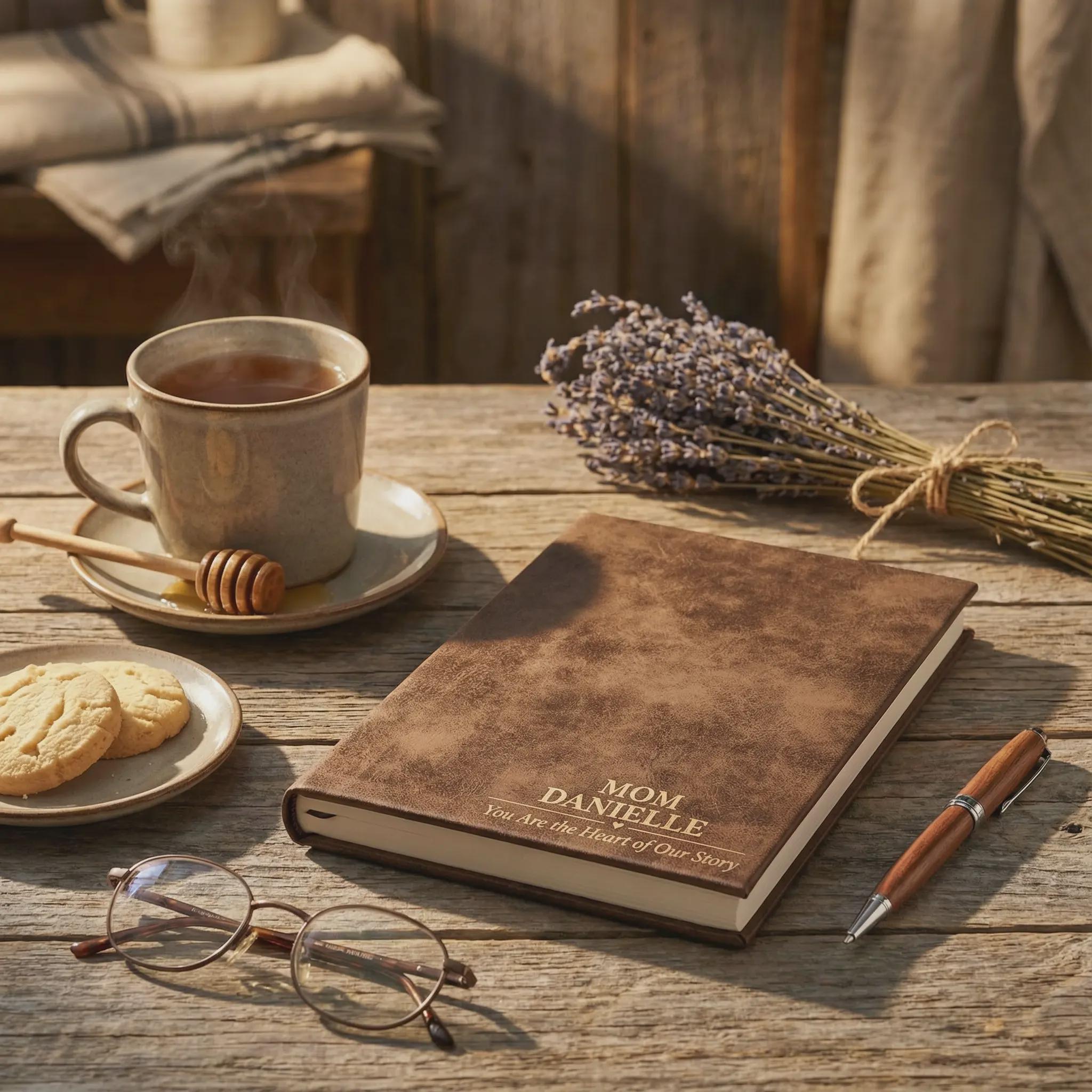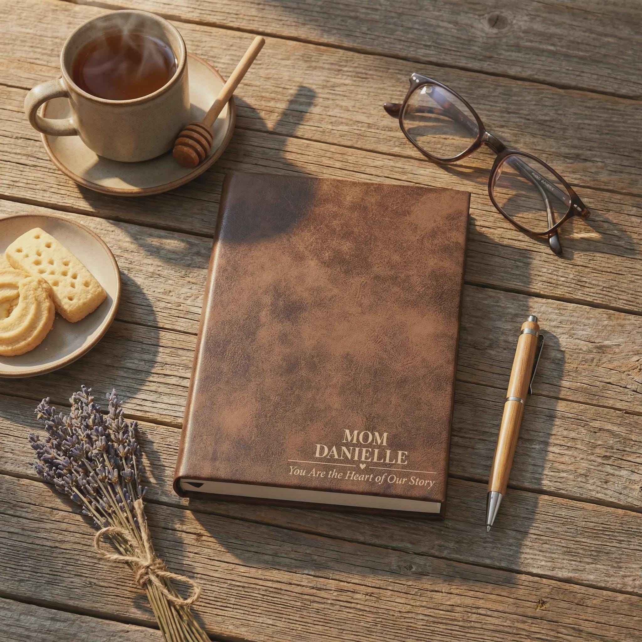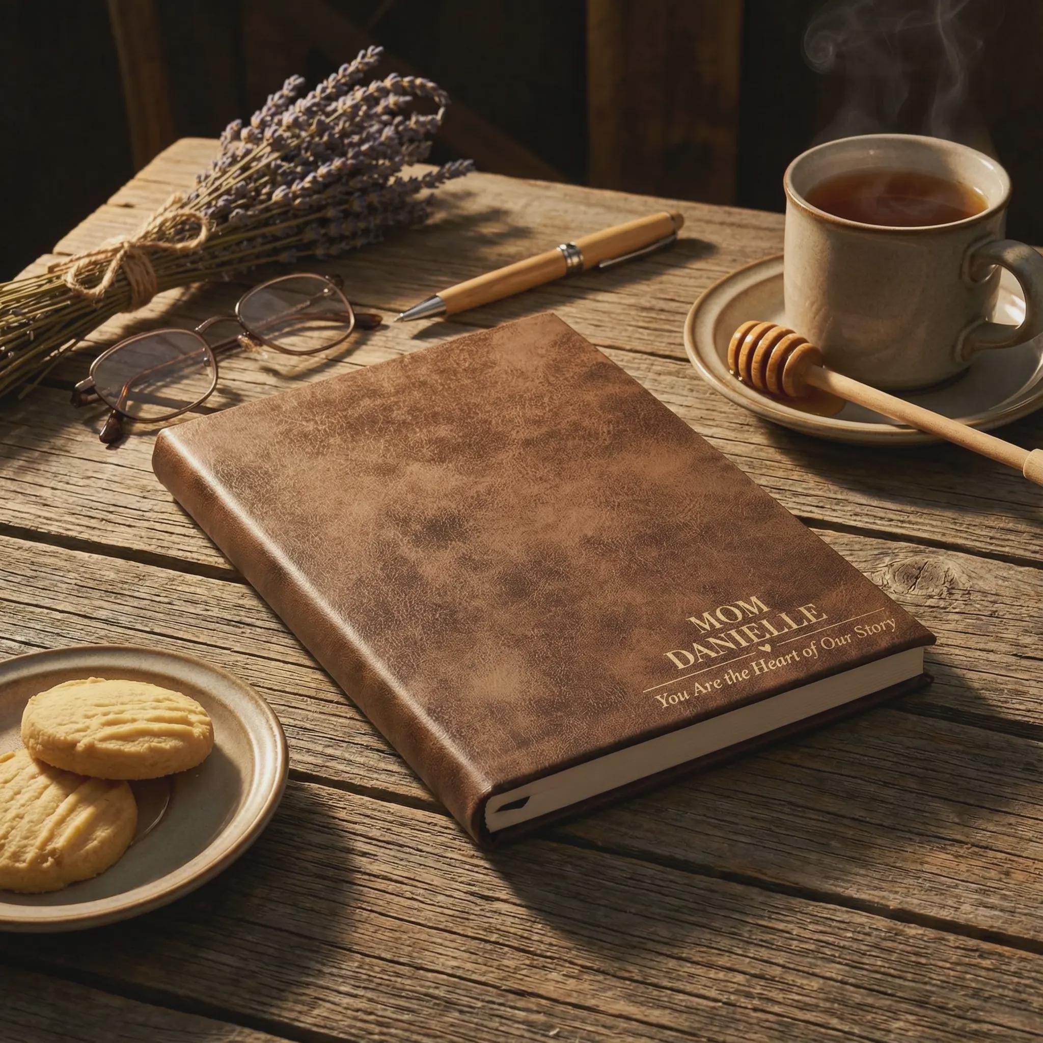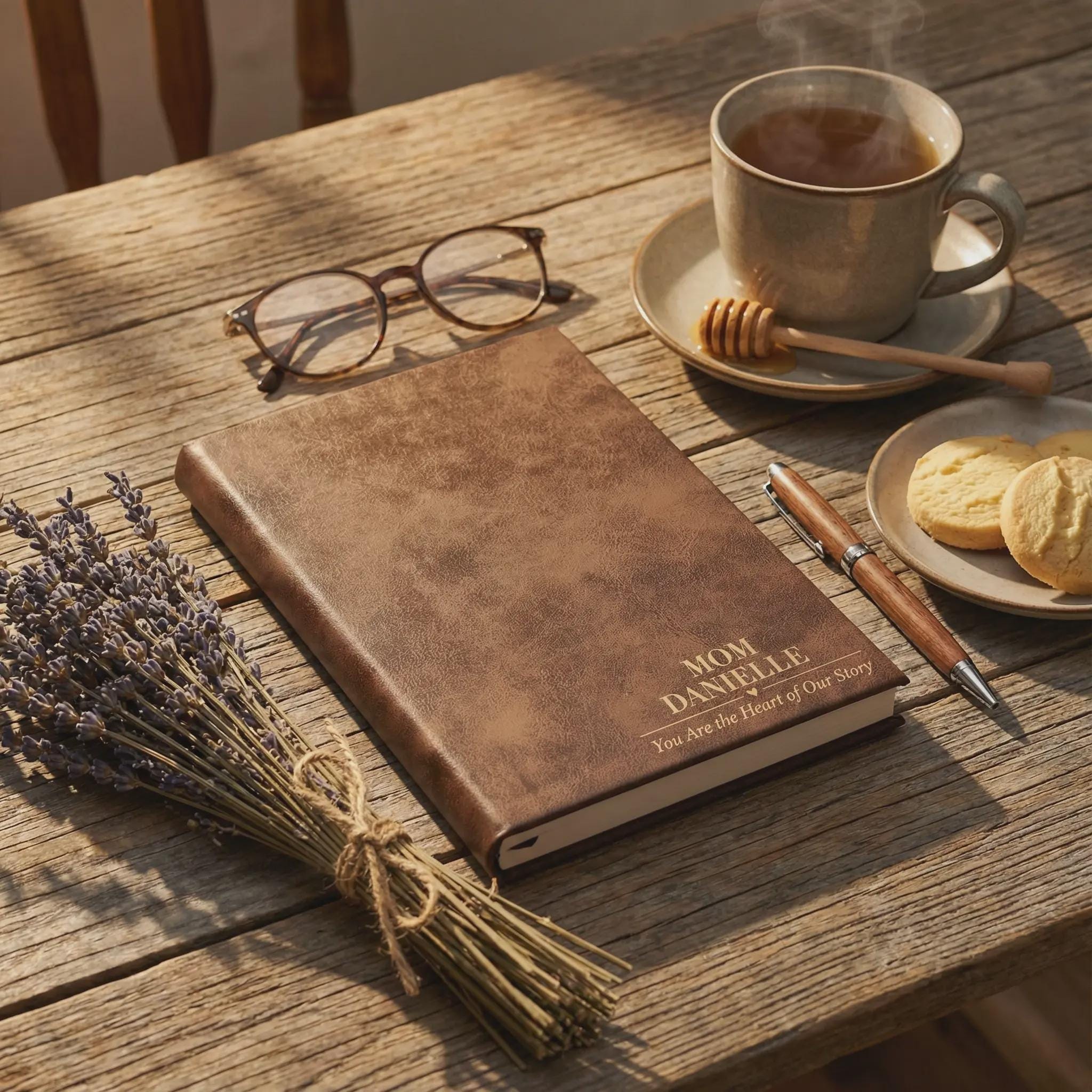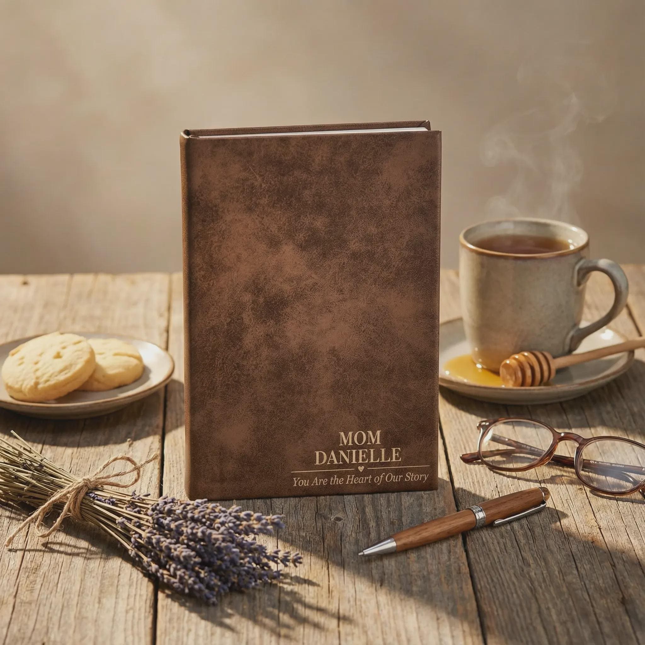 Celebrate the leading lady in your life with this personalized Mother's Day vegan leather diary. Featuring the touching "Heart of Our Story" engraving and a custom name, this brown engraved notebook provides a beautiful space for her to record family memories, daily gratitudes, or creative reflections. Whether you are looking for a unique birthday present for Mom or a meaningful keepsake to show appreciation to your Nana, this high-quality personalized stationery is designed to be cherished for years.