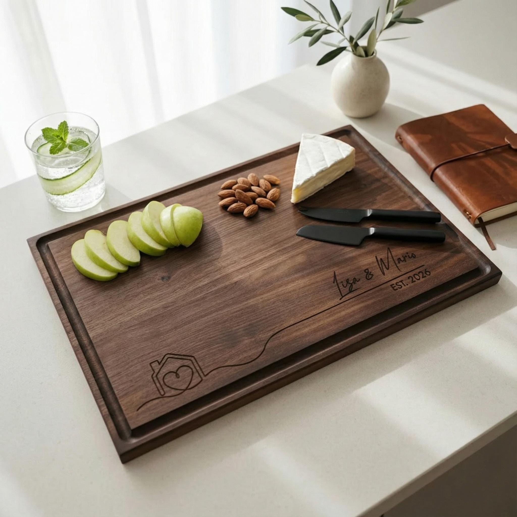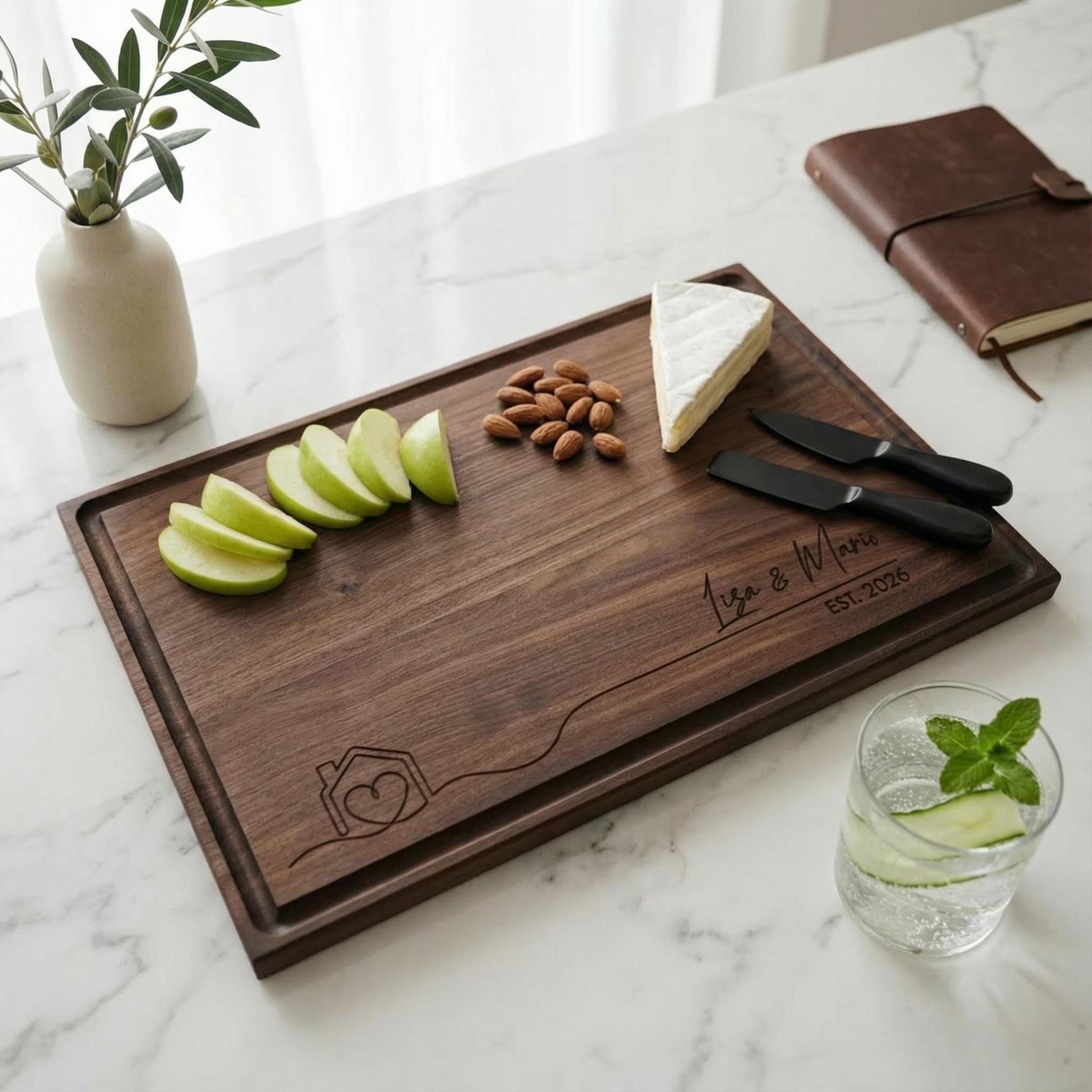 Celebrate the love and new beginnings with our Custom Couples Cutting Board—a personalized gift perfect for housewarming, realtor gifts, anniversaries, and couples. Handcrafted from premium Walnut, Cherry, or Acacia wood, this board adds a personal touch to any kitchen, making it a cherished keepsake.