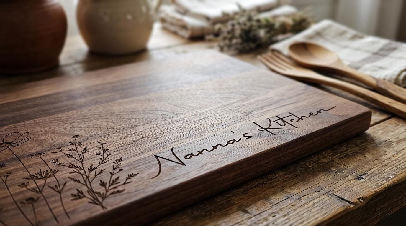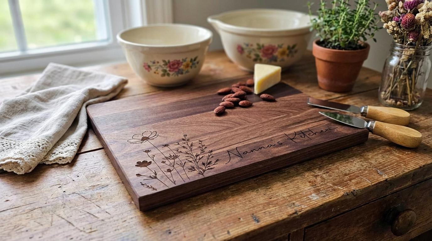 Beautiful laser-engraved personalization with "Nonna's Kitchen" and delicate flower designs, adding a personal touch to every meal and memory.