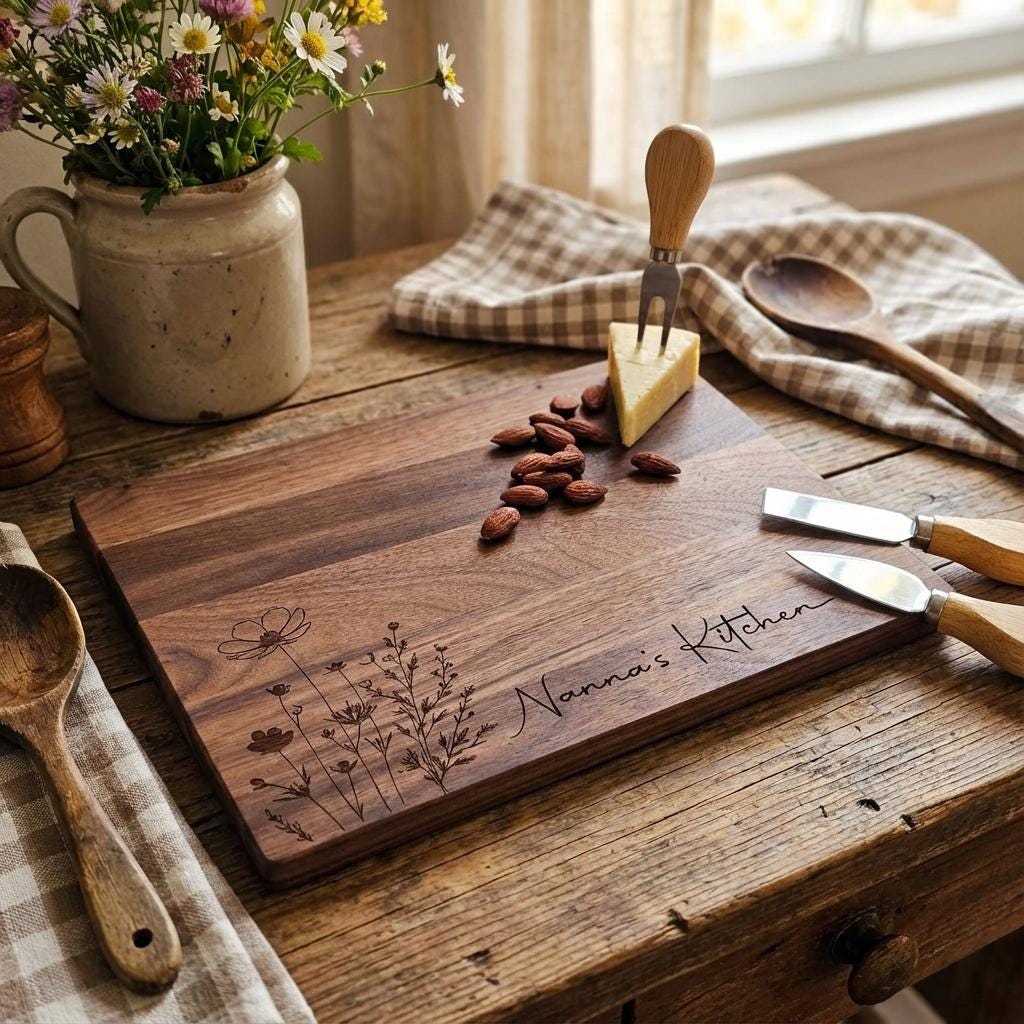 Bring a touch of nature to her home with this personalized Grandma's Kitchen cutting board. Featuring a beautiful wildflower engraving and rich walnut wood, this custom charcuterie board is the perfect Mother's Day gift for Nona, Nana, or Mom.