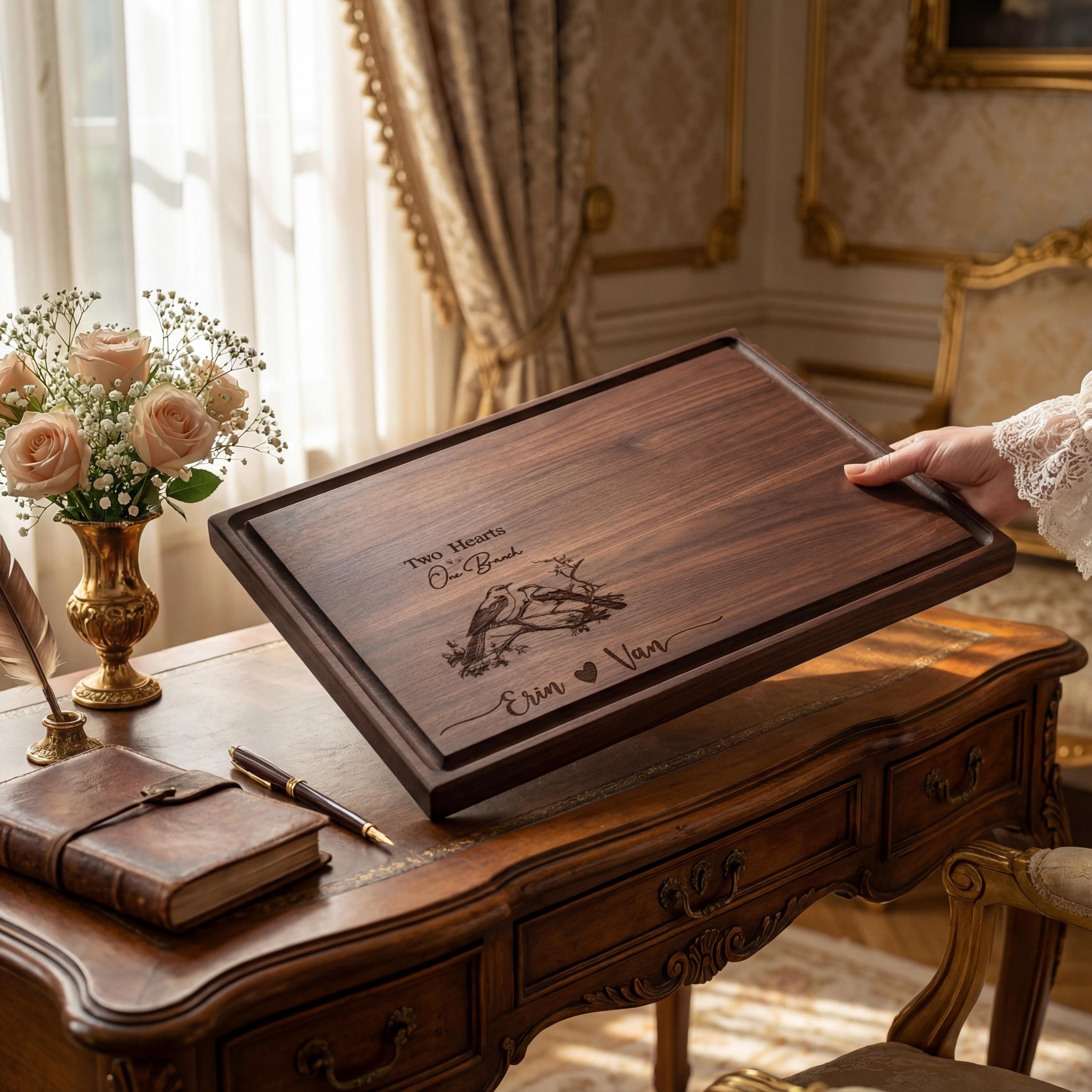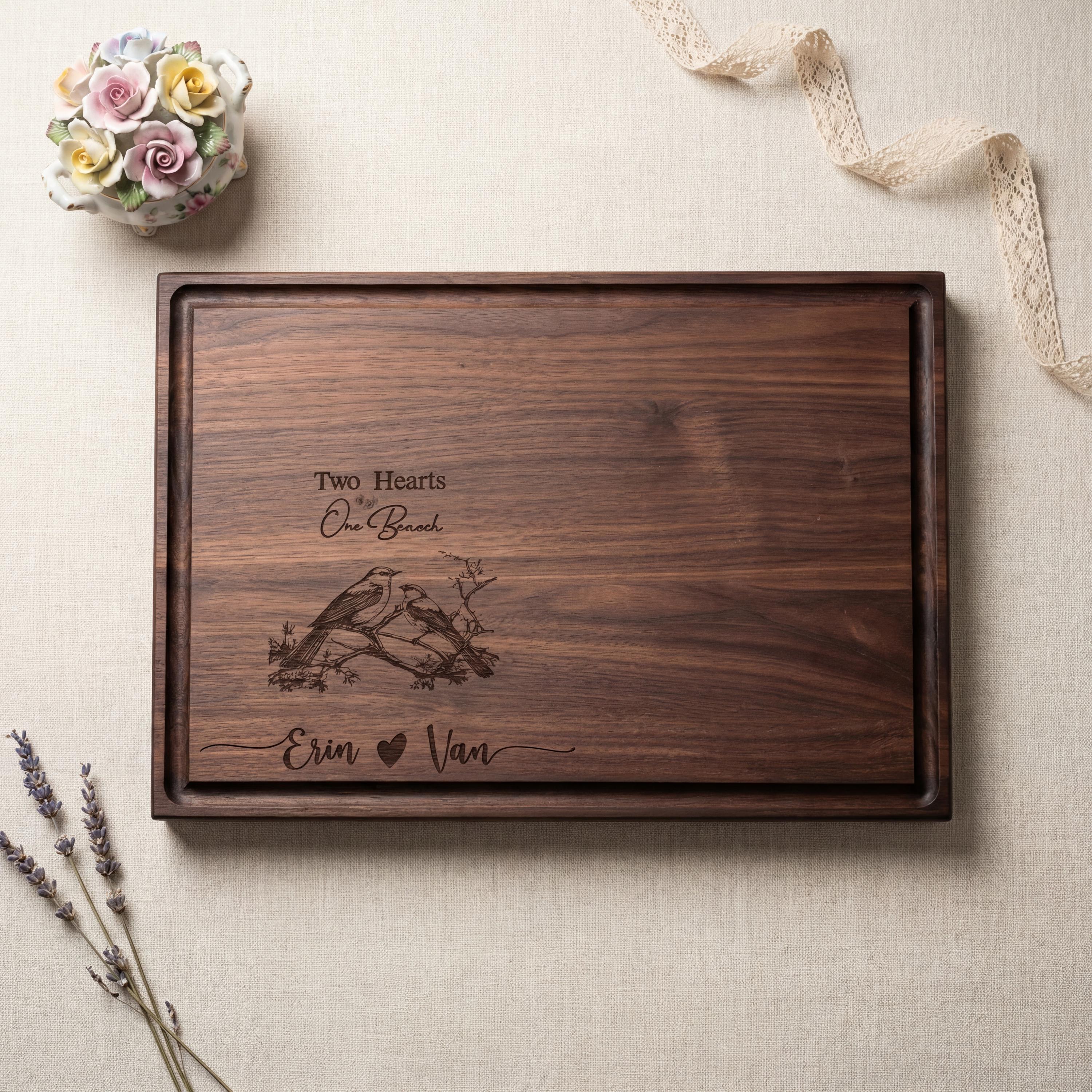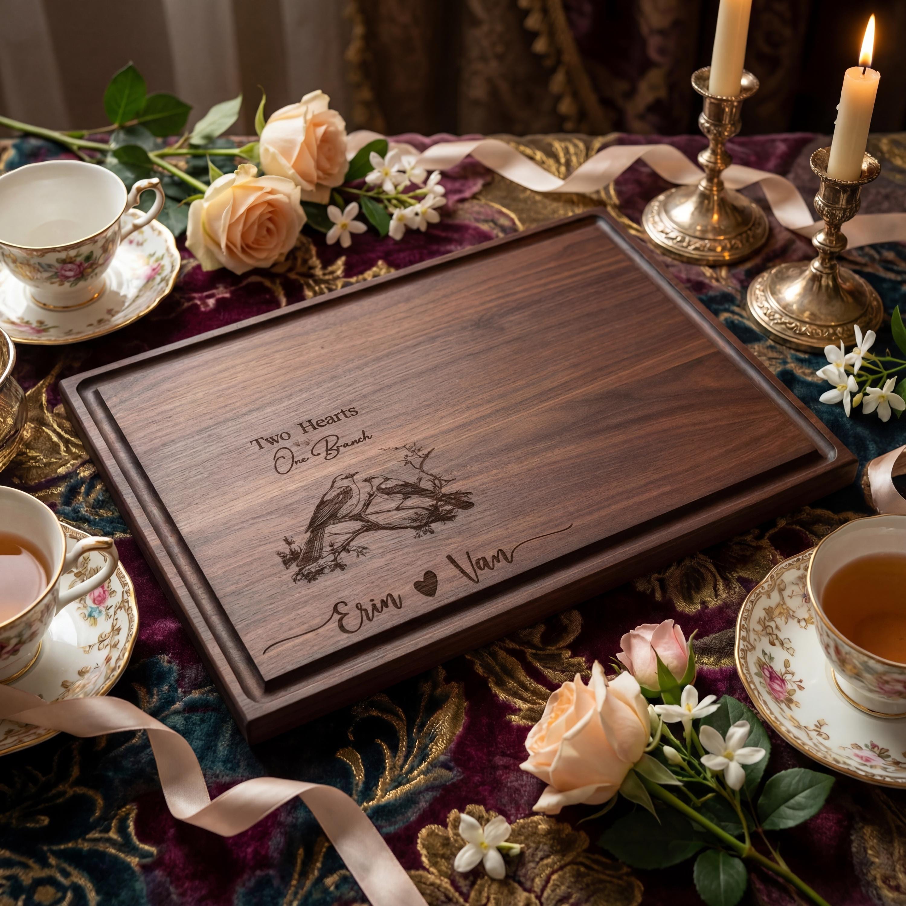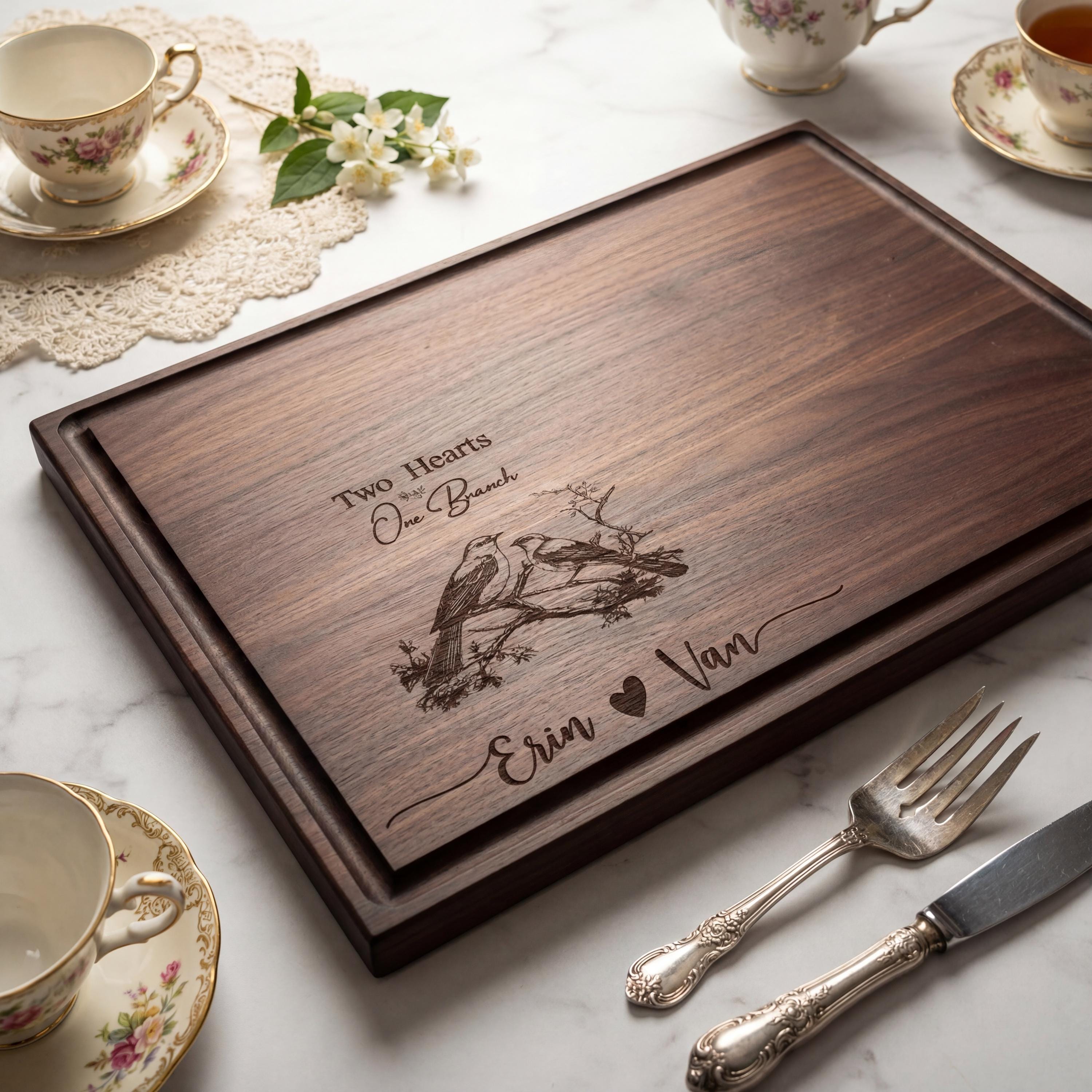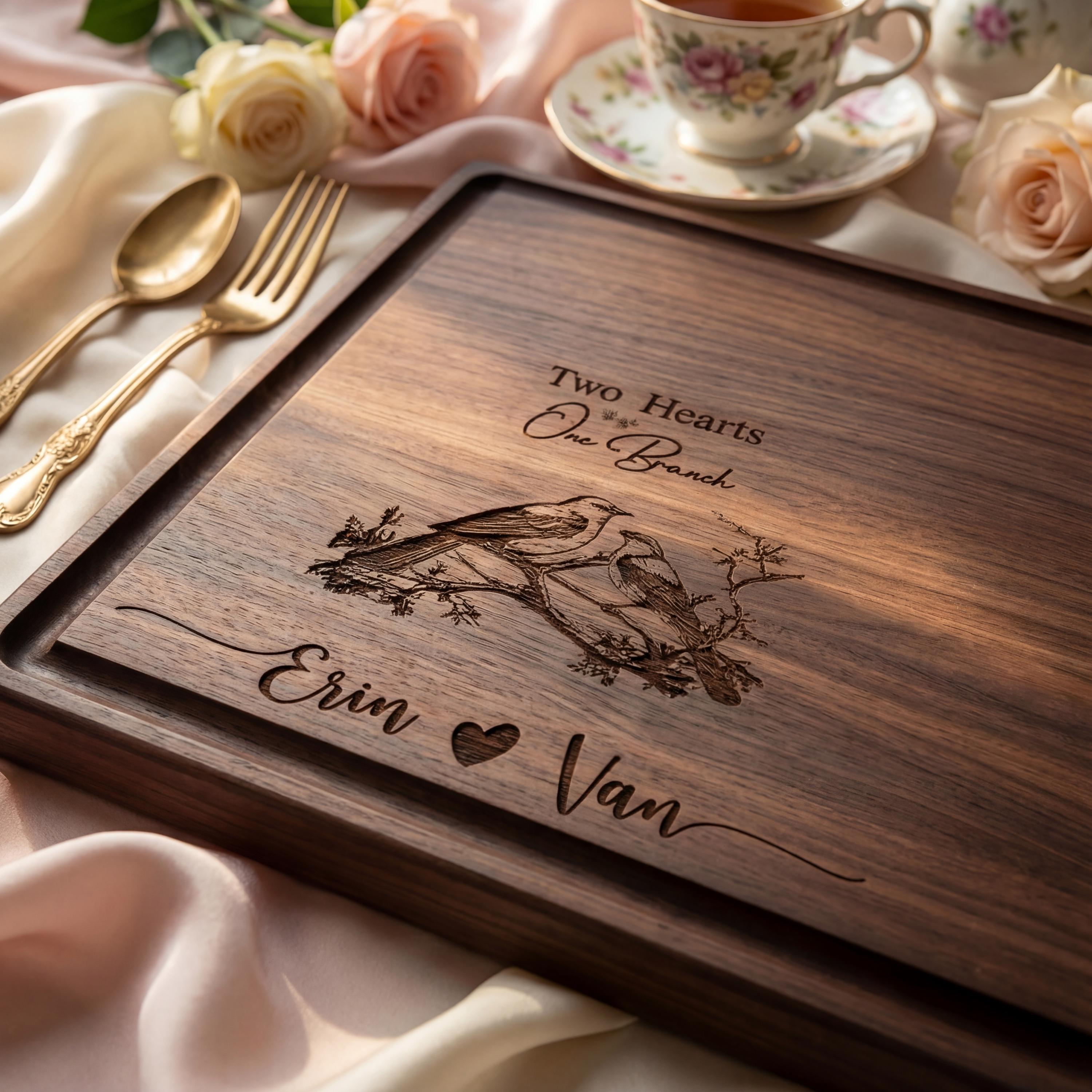 Celebrate a love that grows naturally with this personalized bird lover cutting board. Featuring the romantic 'Two Hearts One Branch' engraving, this walnut charcuterie board is the ultimate wedding gift for couples or 5th anniversary keepsake.