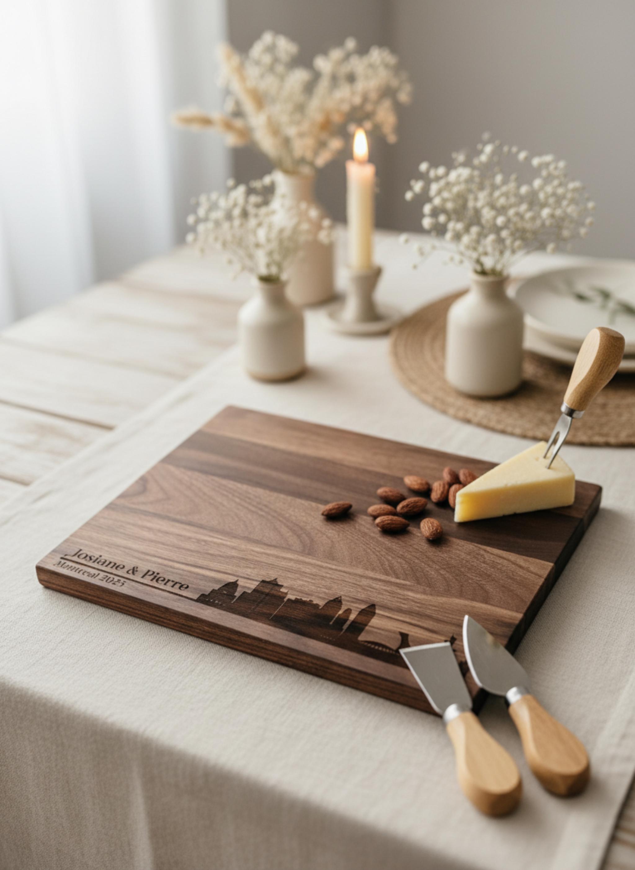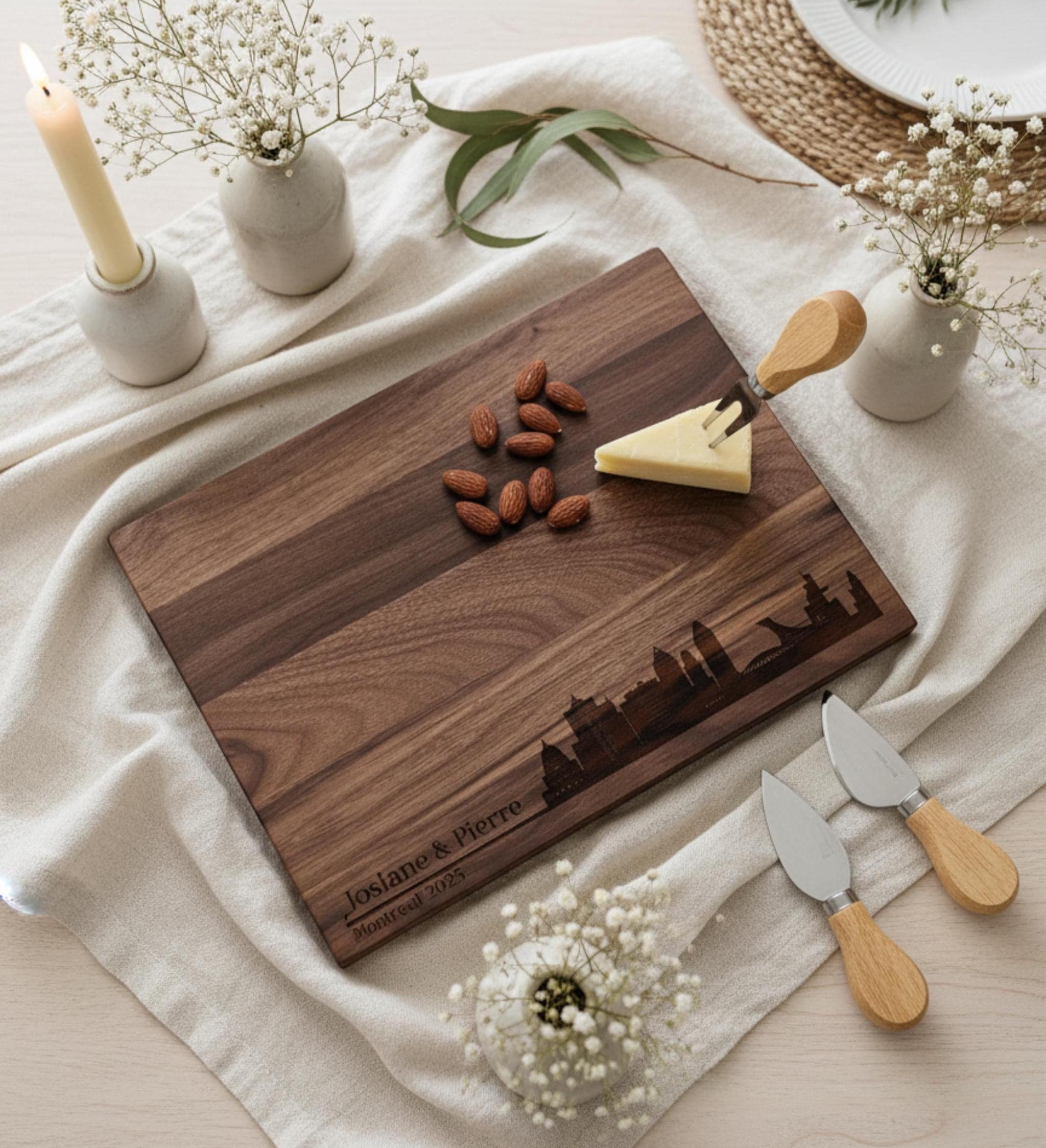 Celebrate love, new beginnings, and the beauty of Montreal with our personalized Montreal Skyline cutting board! A stunning engraved wedding gift, housewarming present, or realtor gift, handcrafted from premium Walnut, Cherry, or Acacia wood.