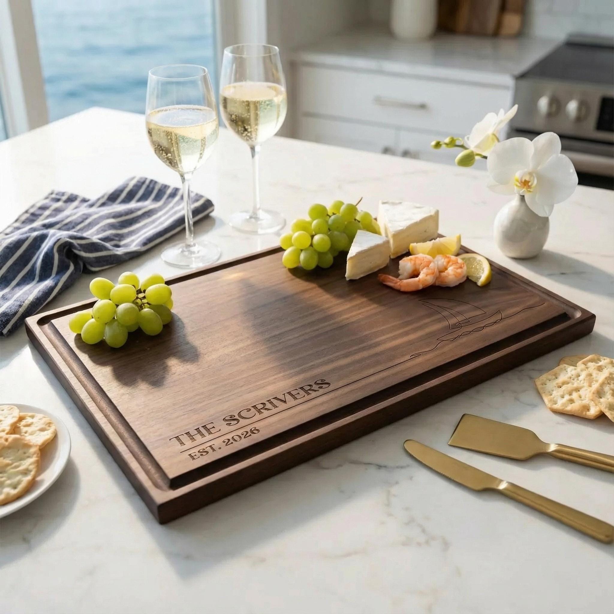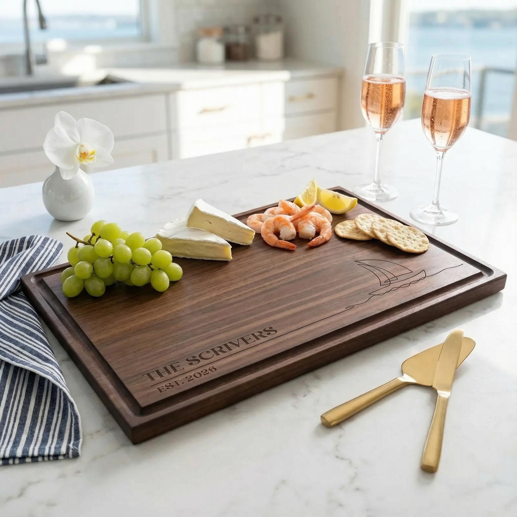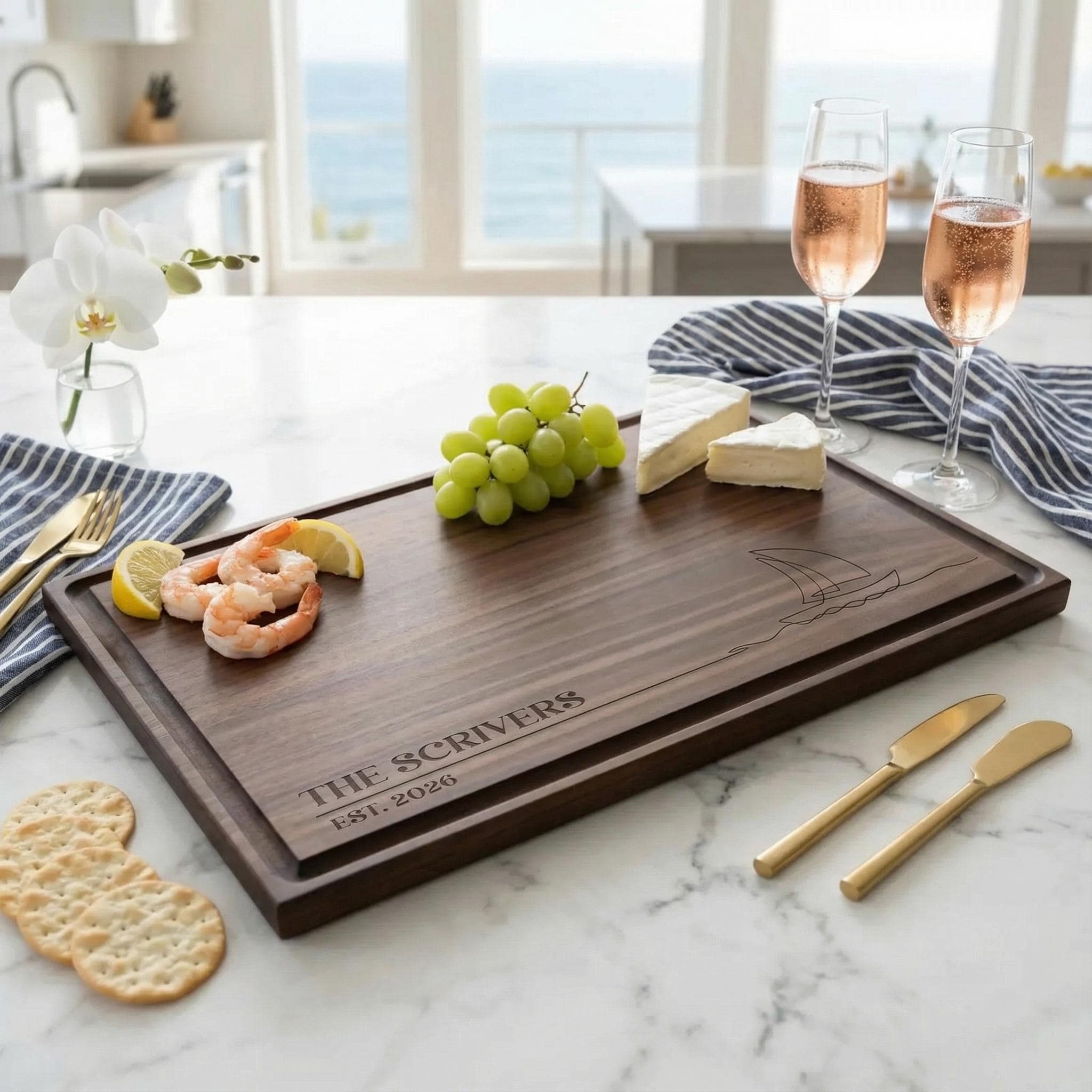 Ahoy there! Looking for a unique and nautical-themed gift that celebrates family and adventure? Our custom-engraved cutting boards feature a beautifully designed modern sailing boat, personalized with your family name and a special date. Perfect for housewarmings, anniversaries, birthdays, or any occasion to celebrate a love for the sea. It's more than just a cutting board; it's a piece of coastal decor that brings the spirit of the ocean into the heart of the home.