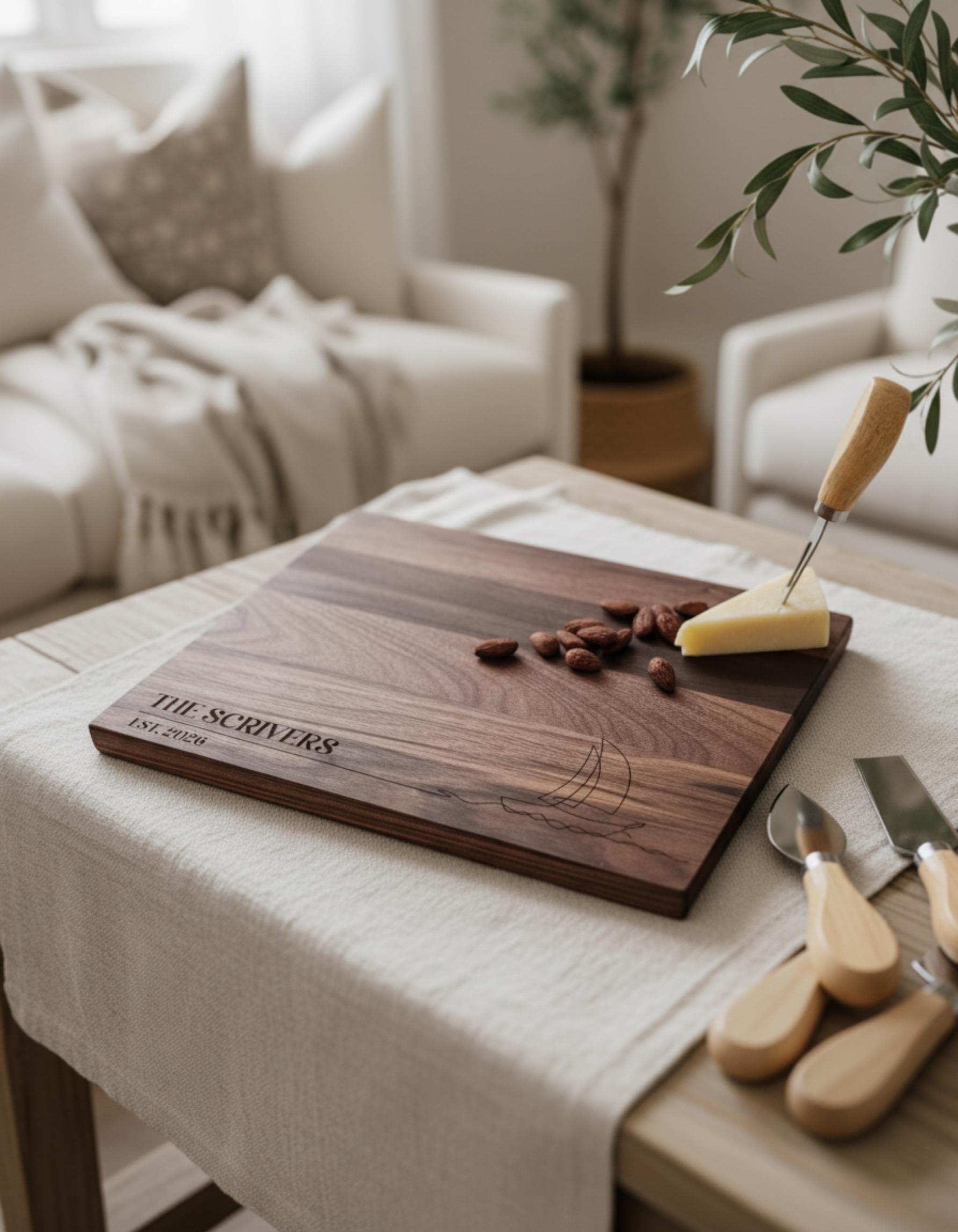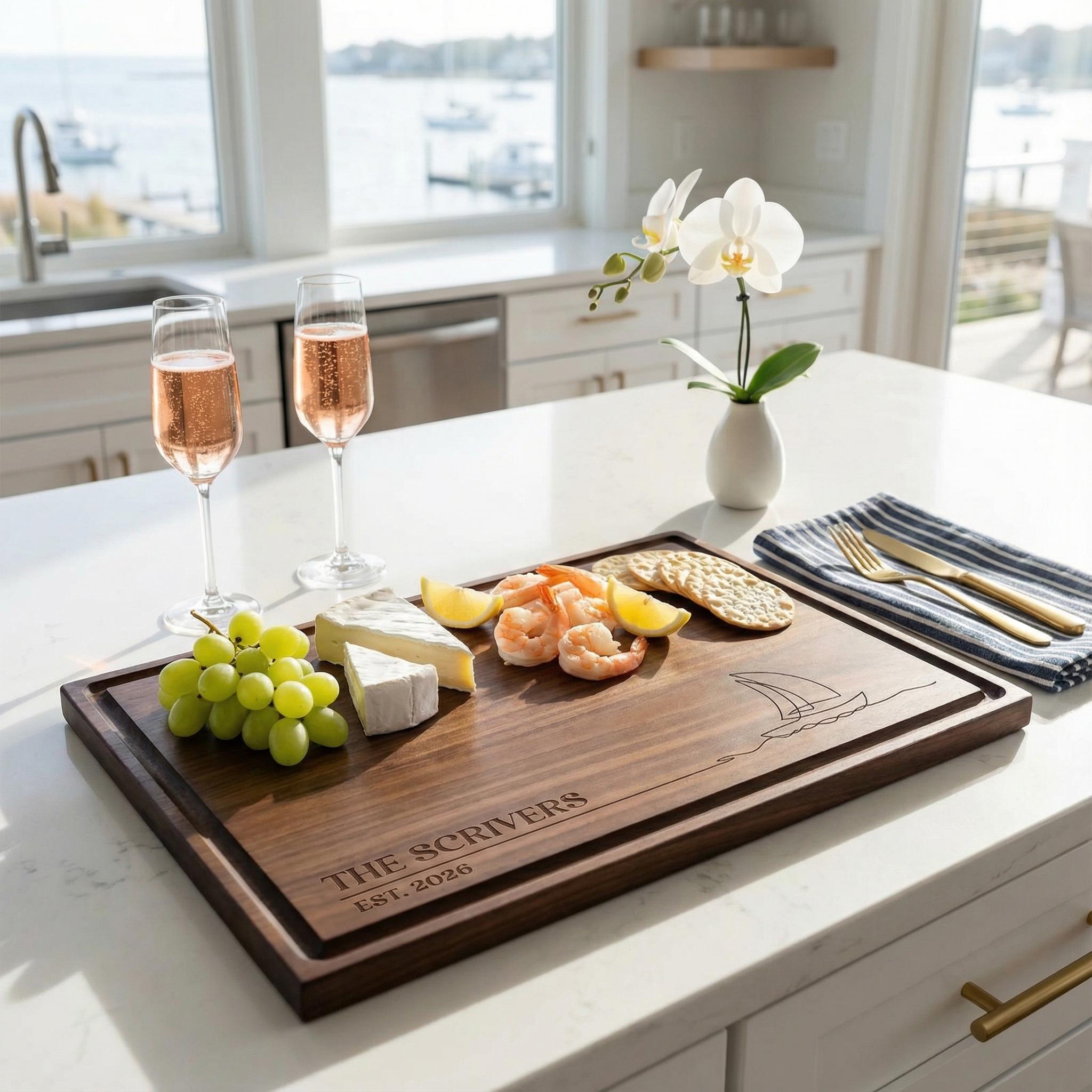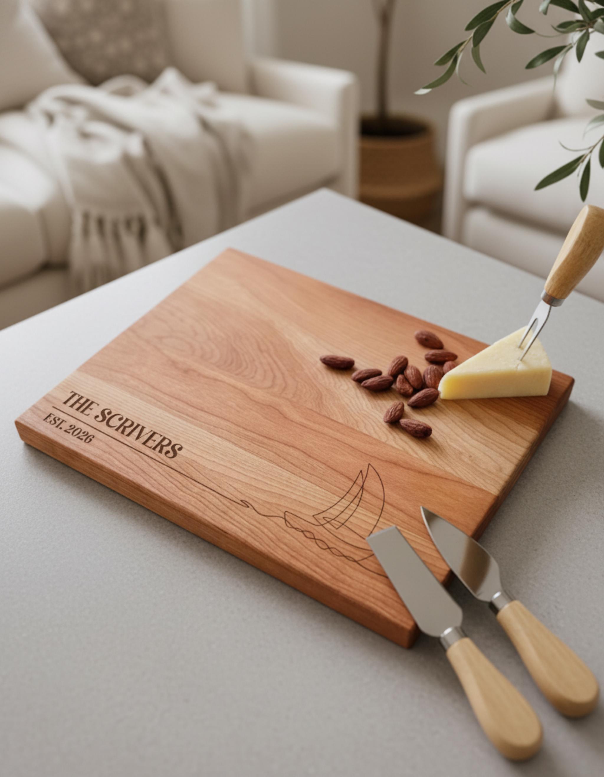 Ahoy there! Looking for a unique and nautical-themed gift that celebrates family and adventure? Our custom-engraved cutting boards feature a beautifully designed modern sailing boat, personalized with your family name and a special date. Perfect for housewarmings, anniversaries, birthdays, or any occasion to celebrate a love for the sea. It's more than just a cutting board; it's a piece of coastal decor that brings the spirit of the ocean into the heart of the home.