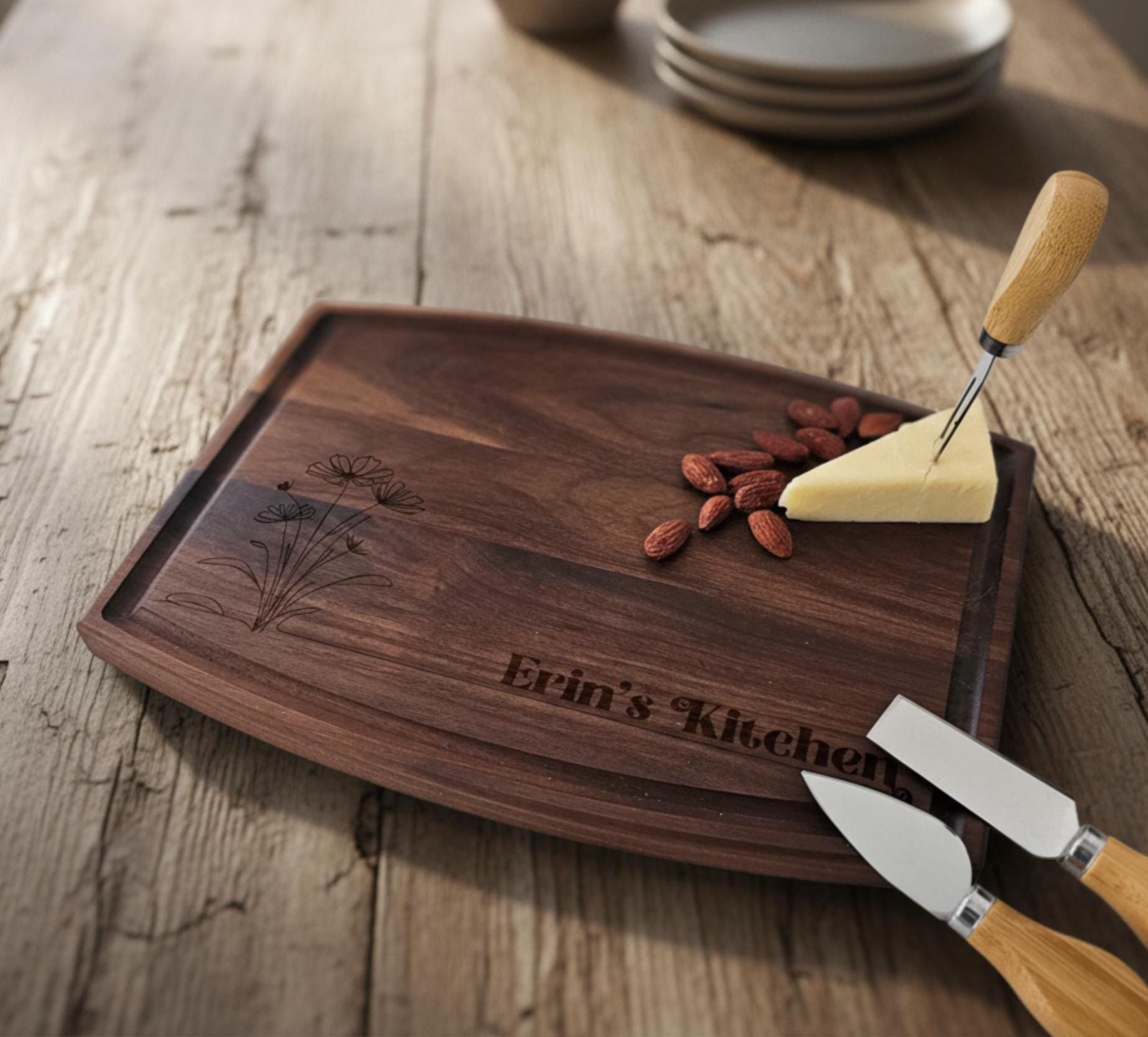 Beautifully laser engraved with "Erin's Kitchen" and delicate floral details, making it a heartfelt and stylish addition to any kitchen.