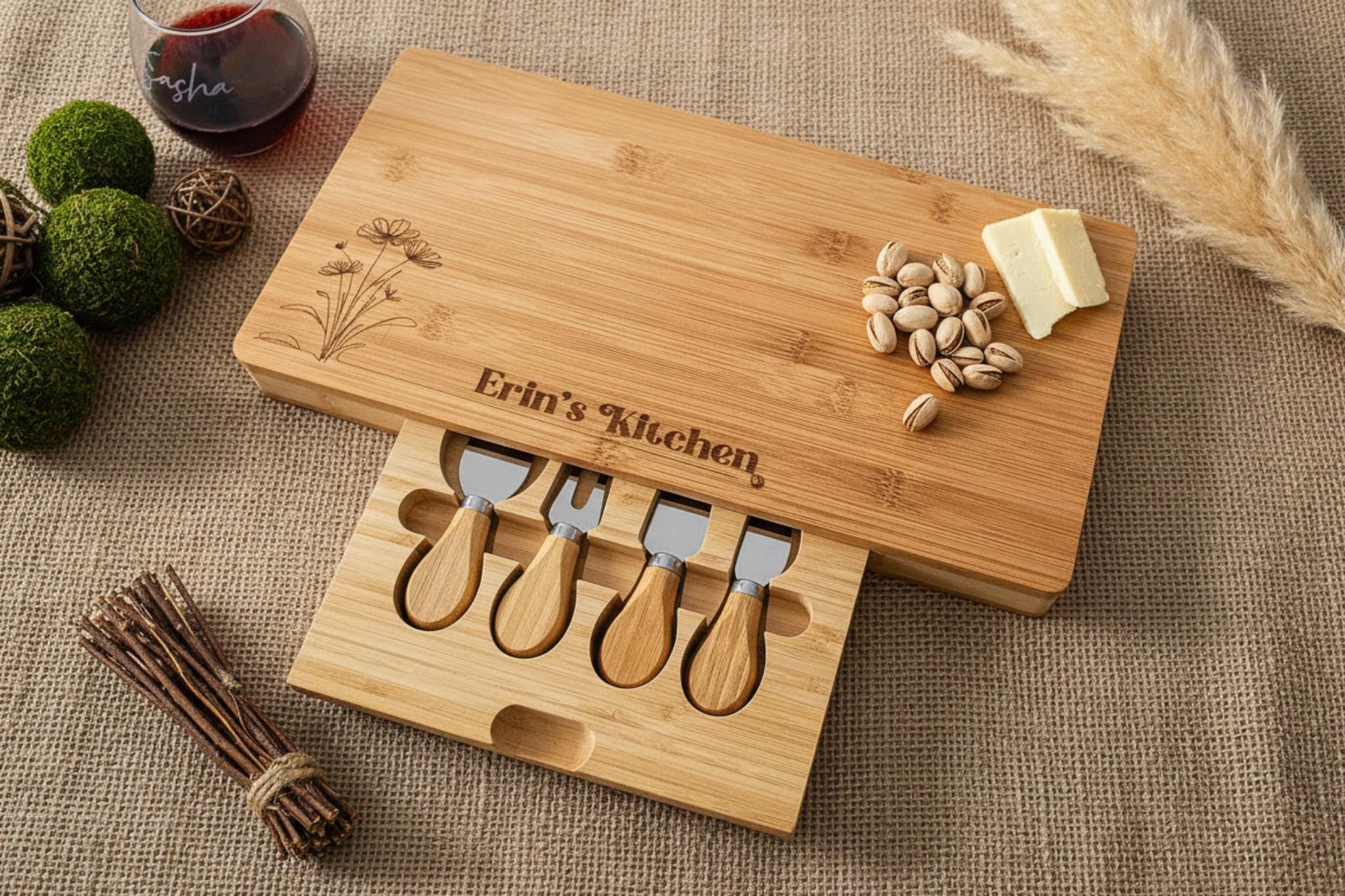 Elevate Mom or Grandma's kitchen with our personalized bamboo cheese board set—a custom engraved, multi-functional masterpiece designed to celebrate the art of cooking and the love of family. This elegantly crafted board features a modern daisy flower design along with a chic "Name's Kitchen" engraving, offering an exceptional blend of style, functionality, and heartfelt personalization.