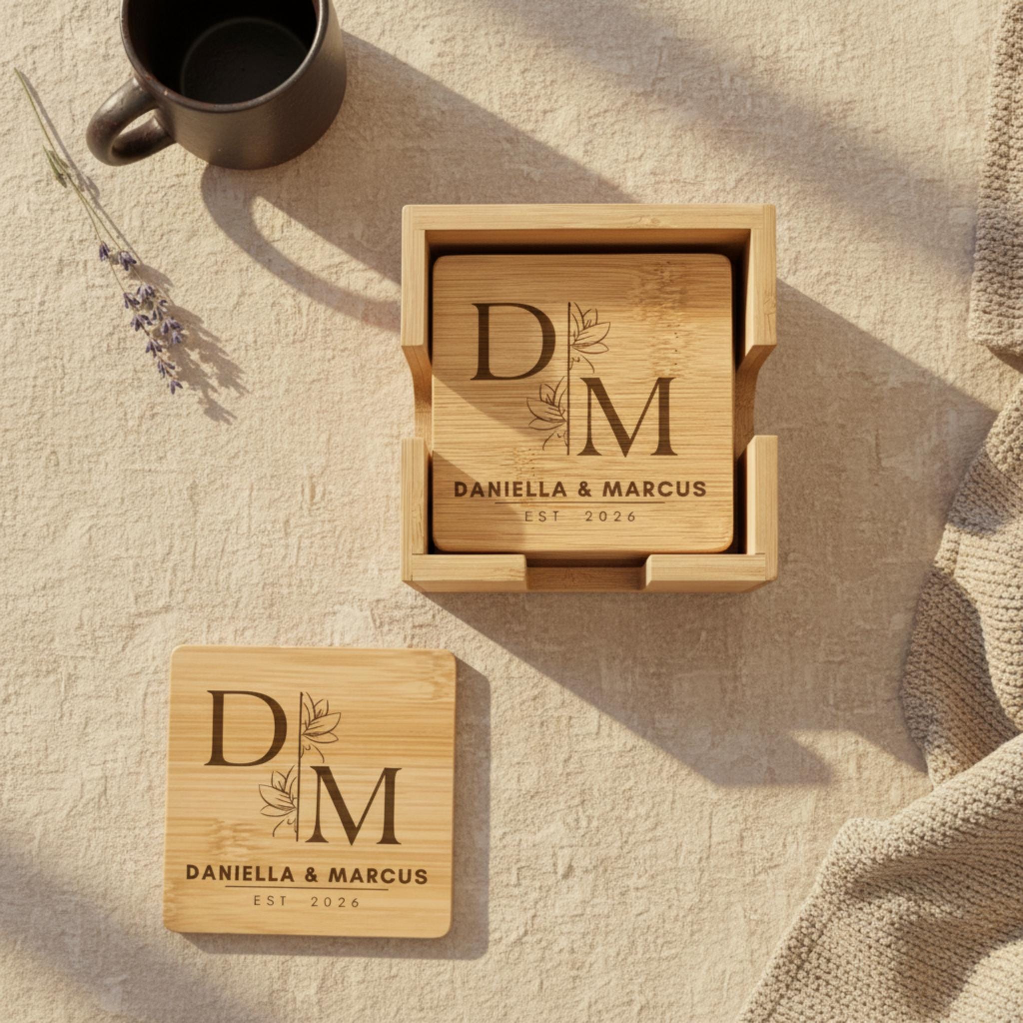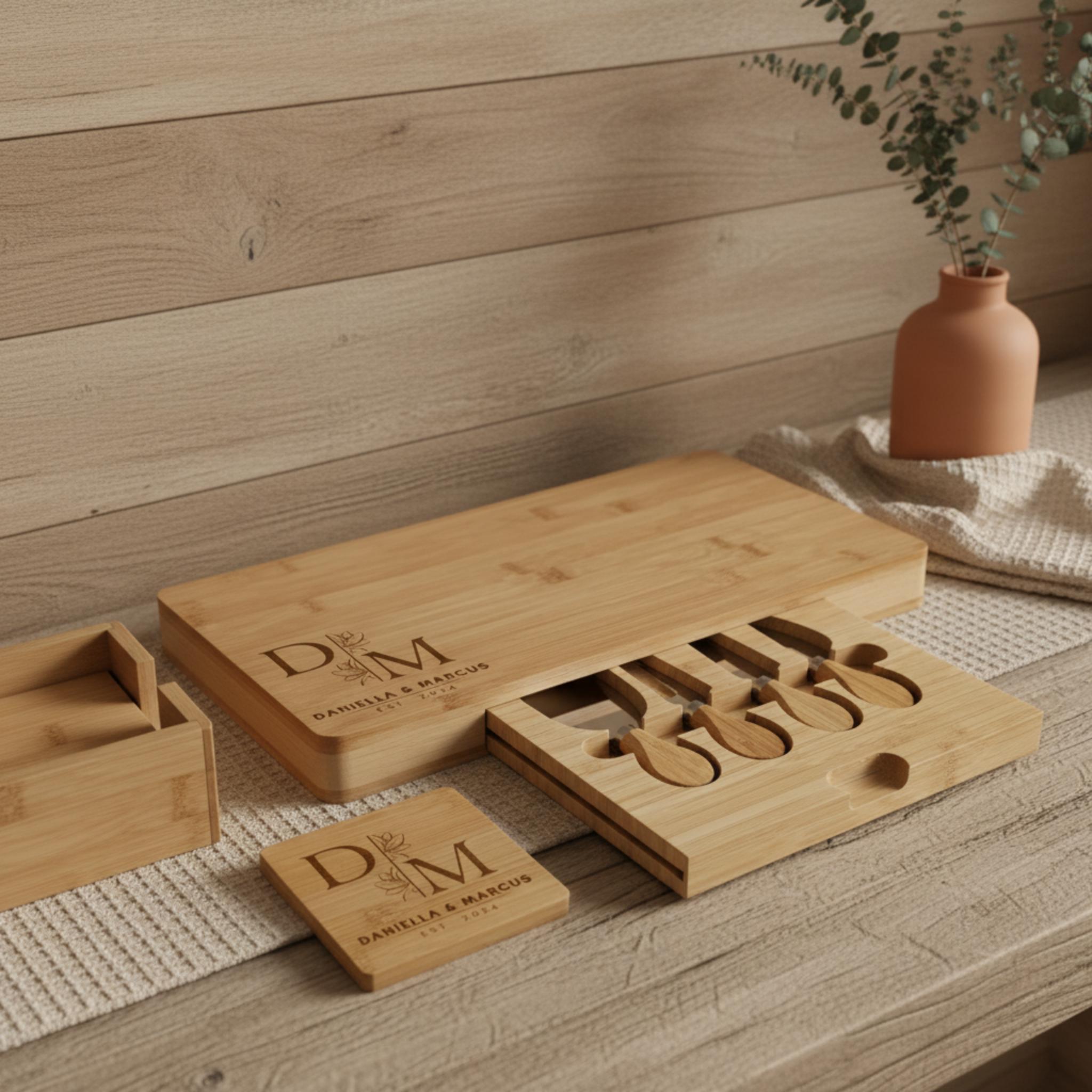 Combo Set: Create the ultimate serving ensemble by pairing the personalized cheese board with the matching 5-piece coaster set for a complete and sophisticated presentation.