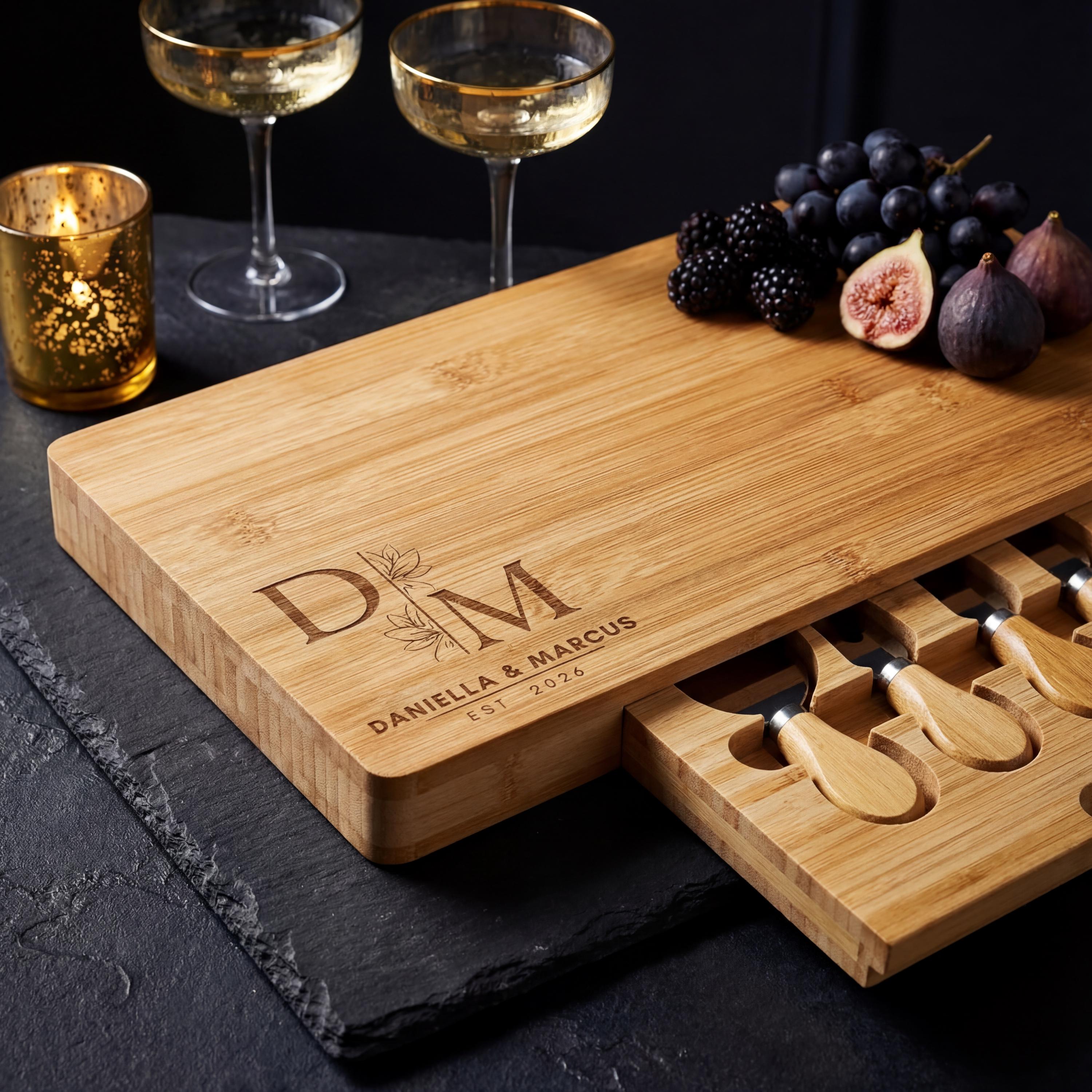 Elevate your hosting game with our personalized bamboo cheese board—a beautifully engraved charcuterie board designed to showcase a couple's initials, names, and a special date in a modern floral motif. This board isn’t just a serving accessory; it’s a unique keepsake that makes an ideal wedding gift, anniversary present, or statement piece for any couple’s home.