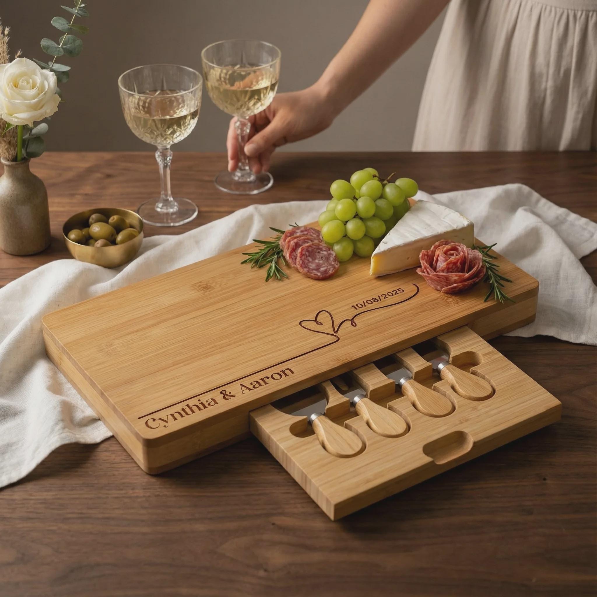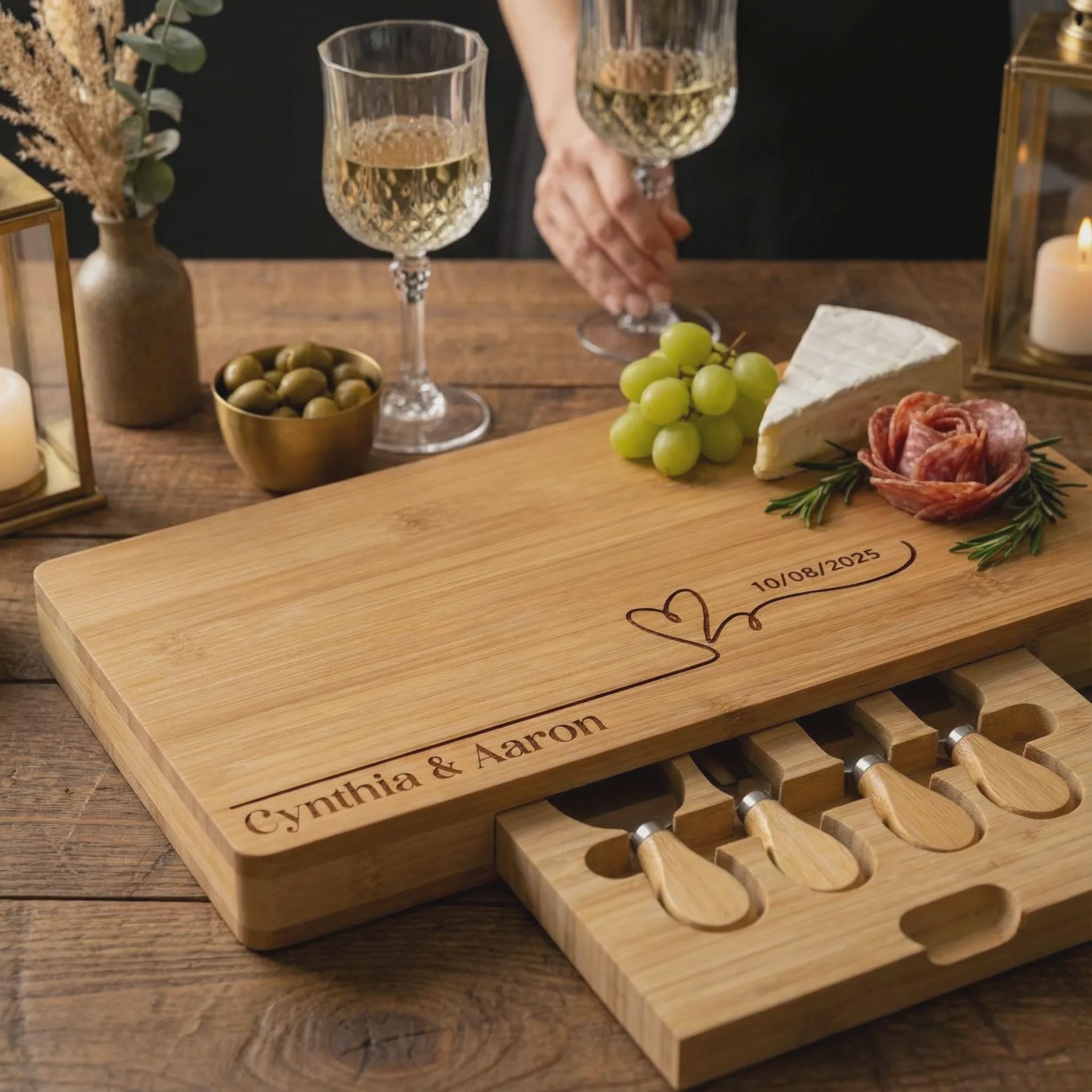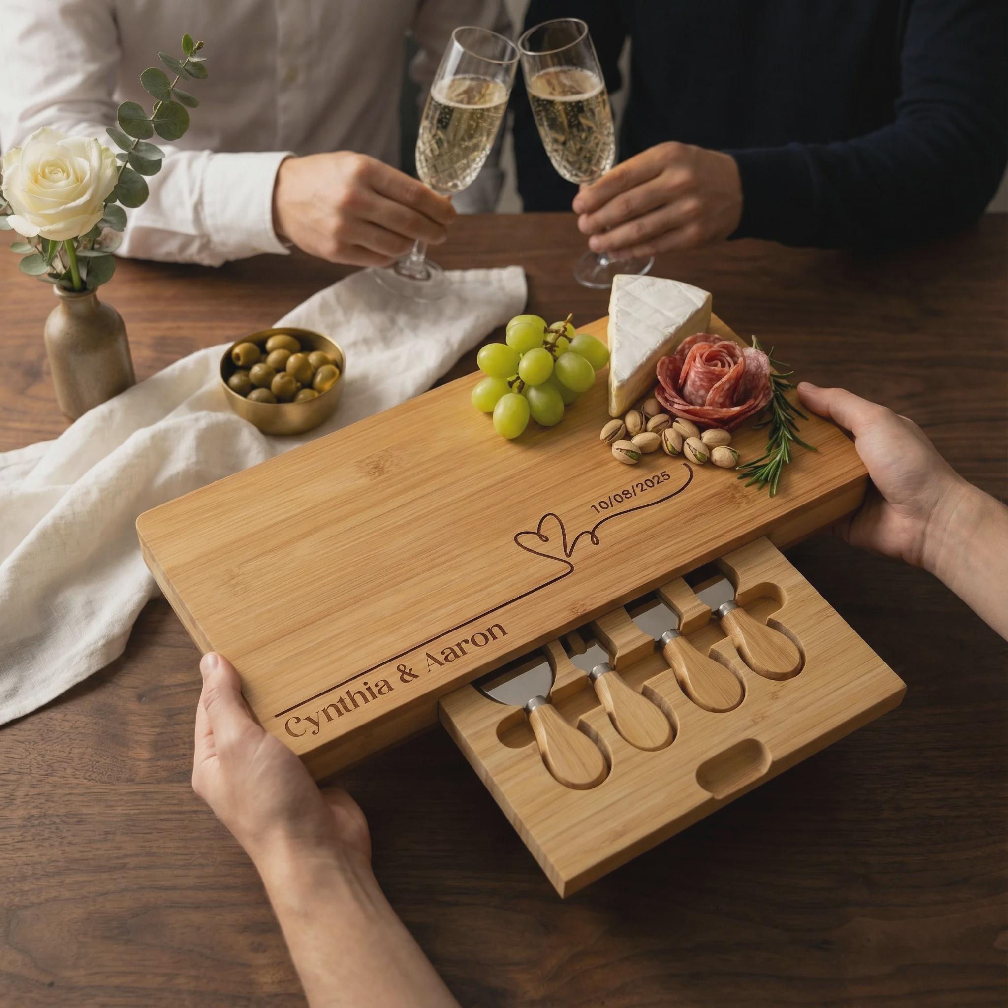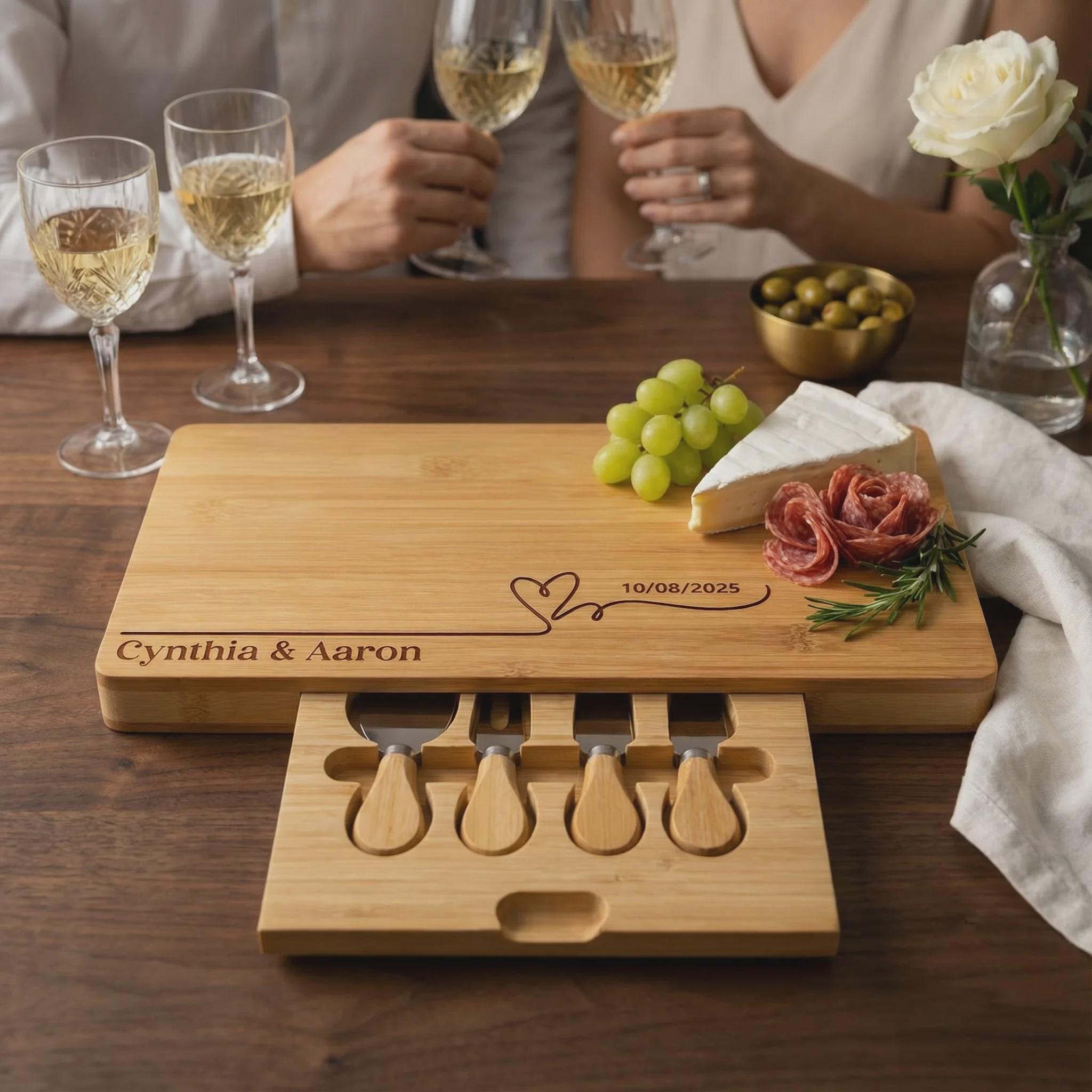 Cheese Board Set: Enjoy the custom engraved cheese board, showcasing your love story with its integrated utensil storage—perfect for gourmet spreads and intimate celebrations.