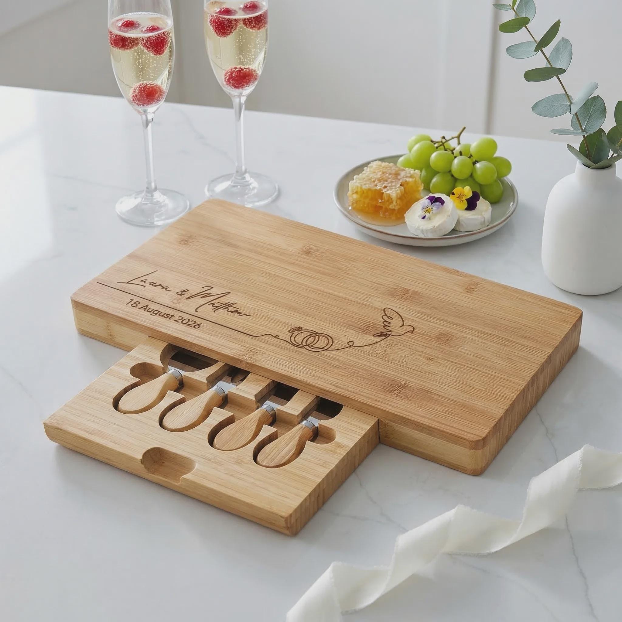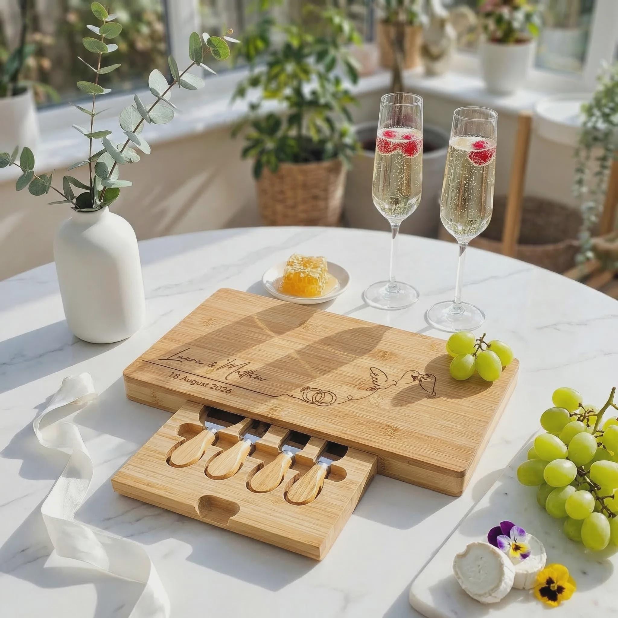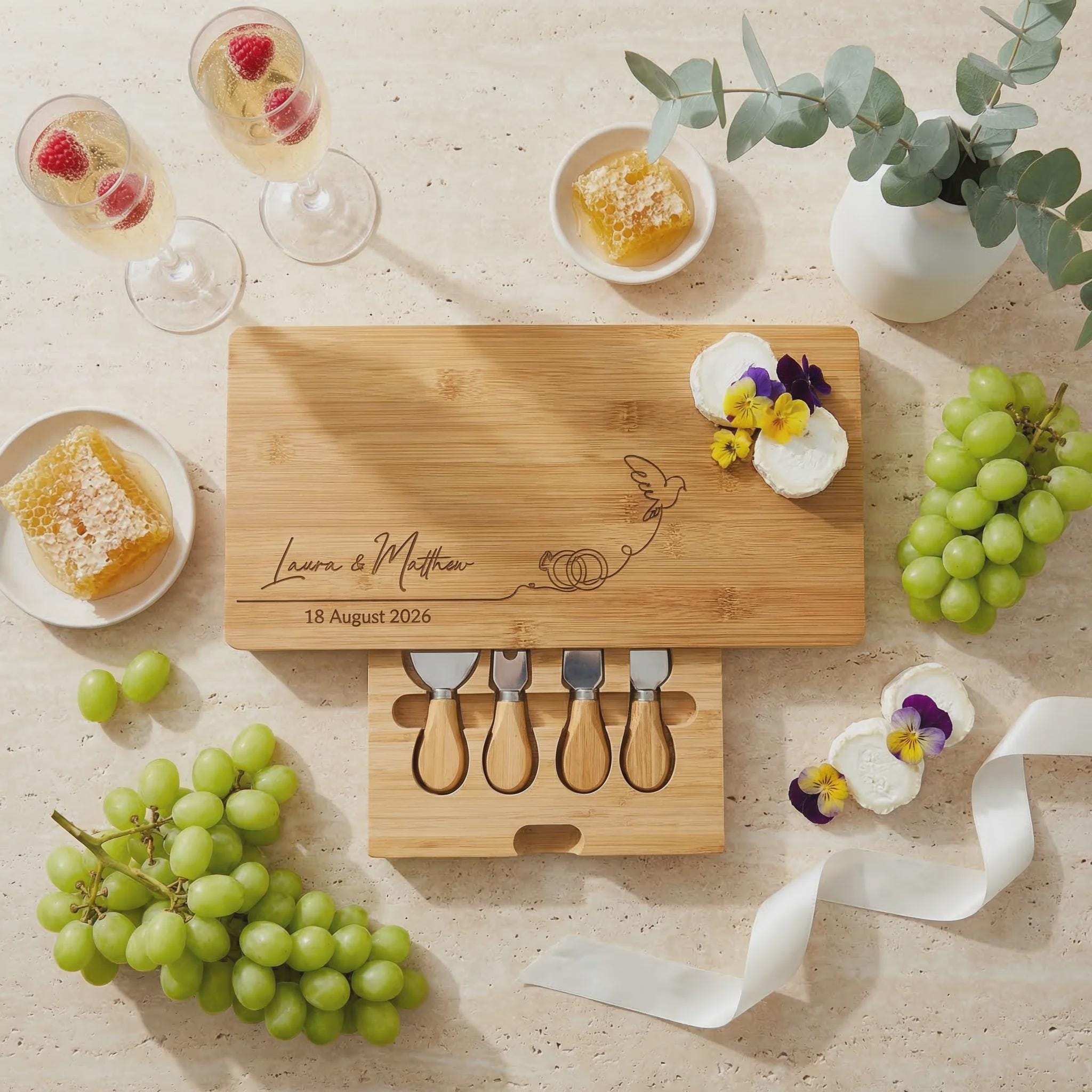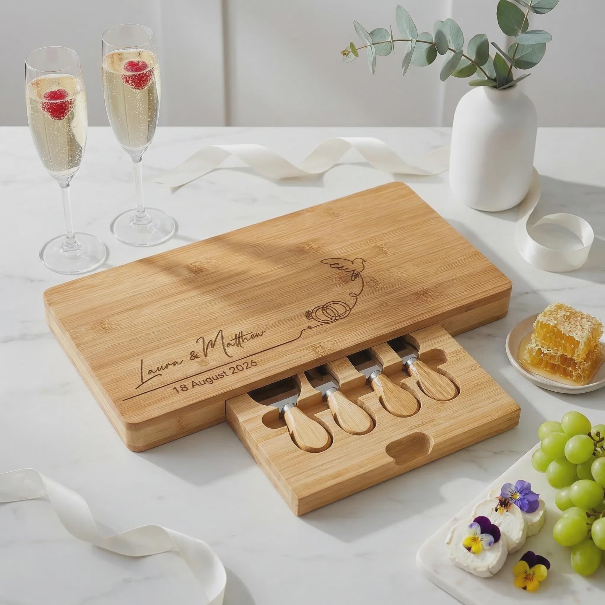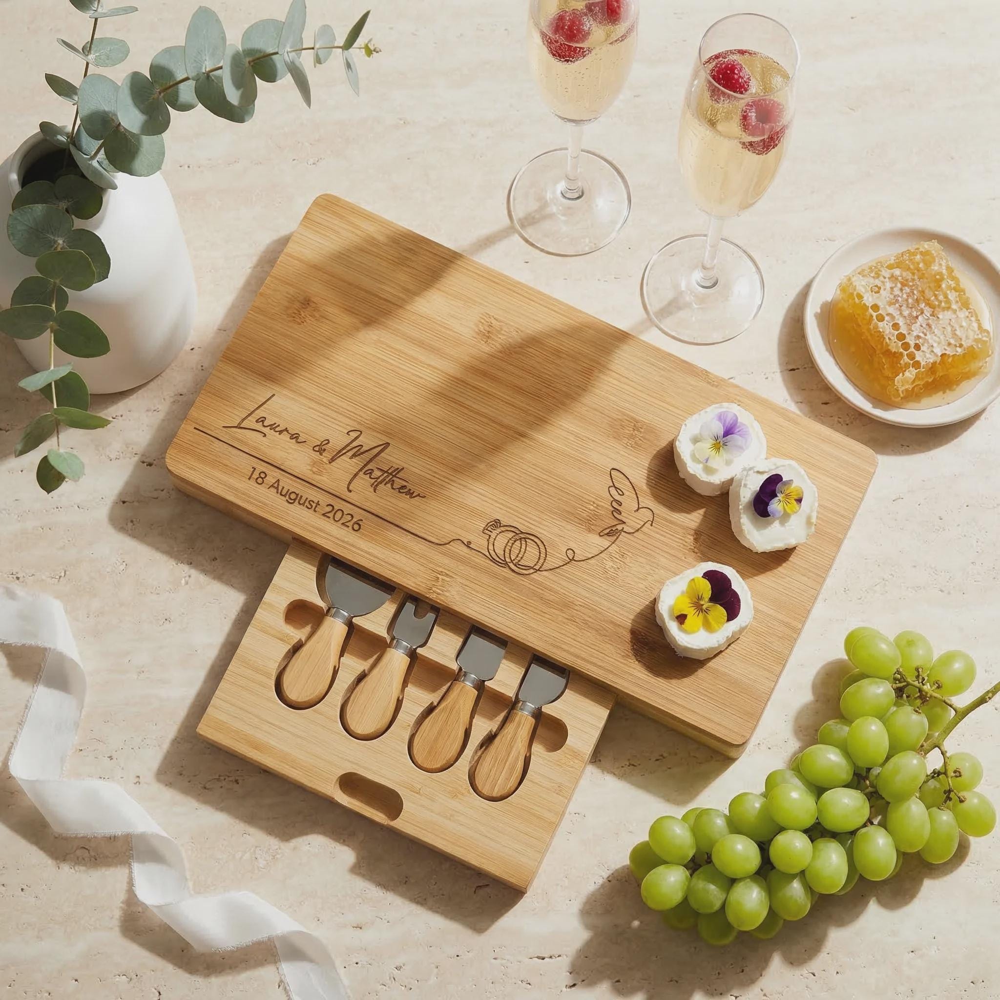 Personalized Bamboo Charcuterie Board with Knife Set, Custom Dove Engraved Wedding Gift for Couple