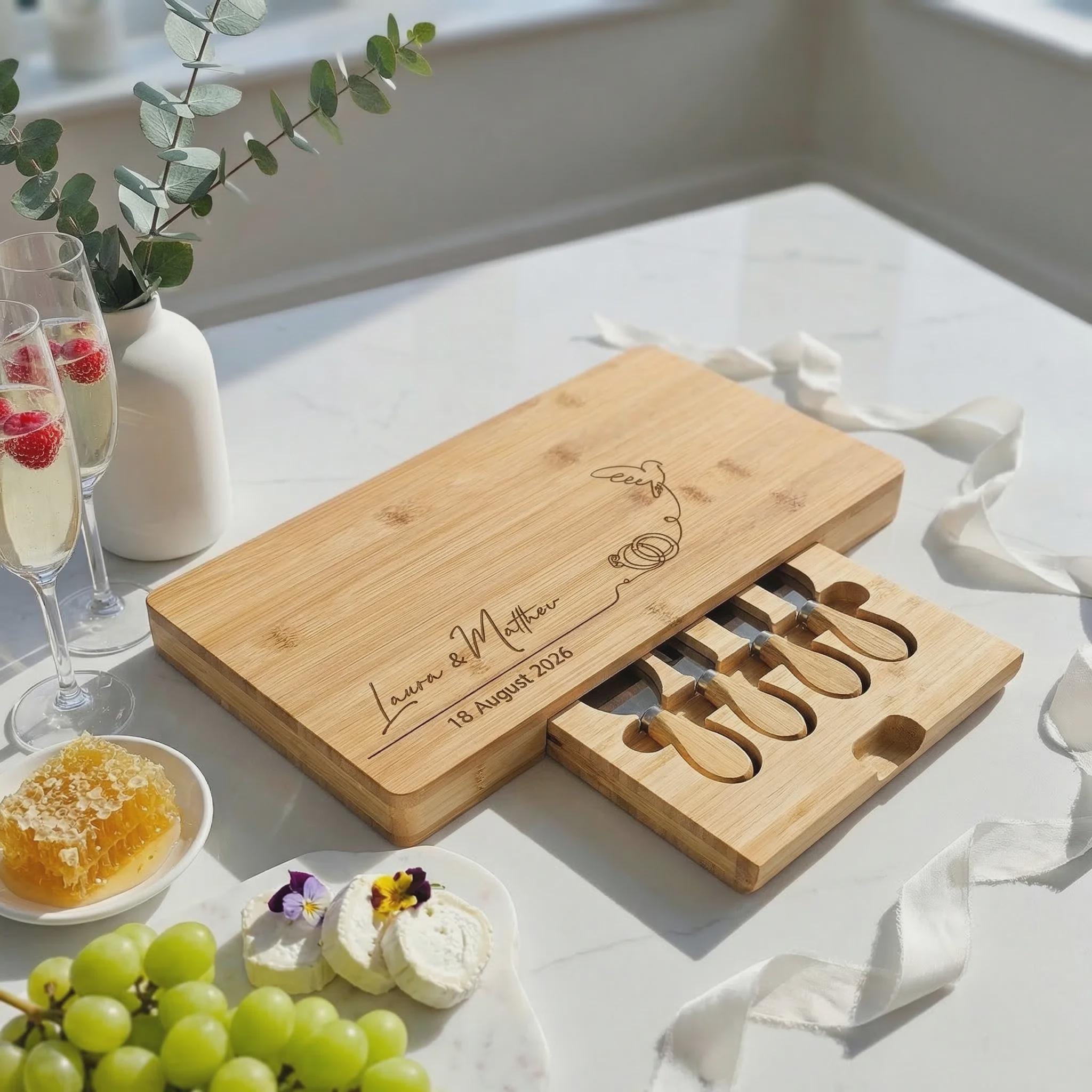 Create Your Heirloom Today: Click “Add to Cart” to personalize your custom engraved bamboo cheese & charcuterie board with your chosen option (Cheese Board Only, Coaster Set Only, or Combo Set) and bring a touch of elegance to every occasion. Celebrate your love story with a piece that’s as enduring as it is beautiful.