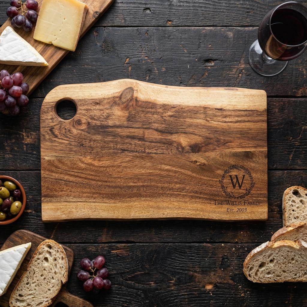 Add natural warmth to their kitchen with this personalized, live-edge cutting board. Featuring a classic laurel wreath monogram and organic wood shape, this rustic charcuterie platter is the ultimate housewarming gift or 5th anniversary keepsake.