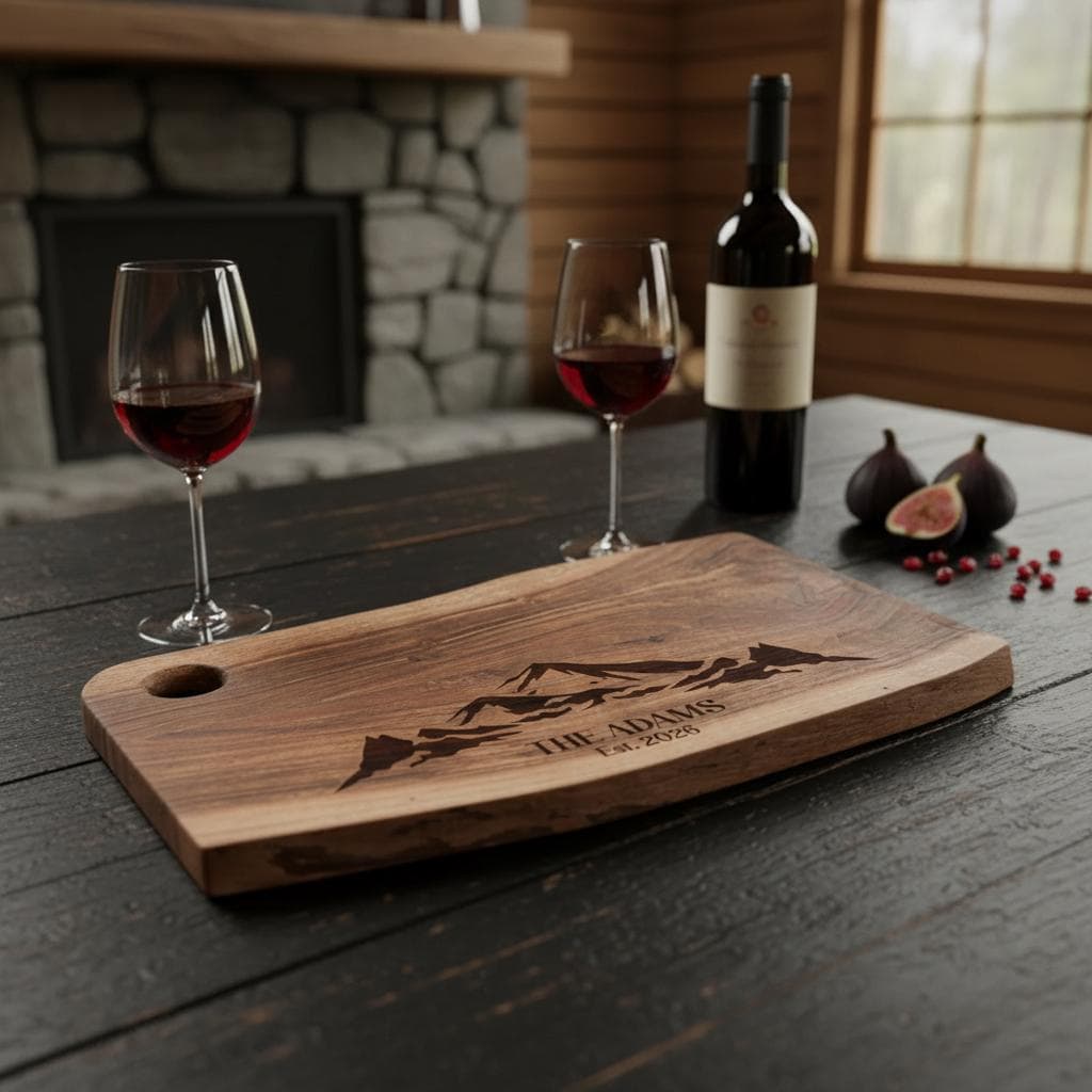 Personalized live edge cutting board - Mountain Ranges: Rustic Engraved Charcuterie Board for Couples, Adventure Seekers, cottage gift