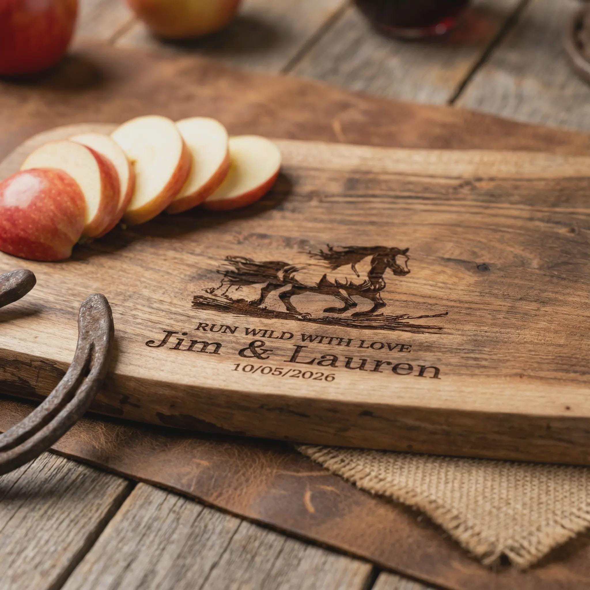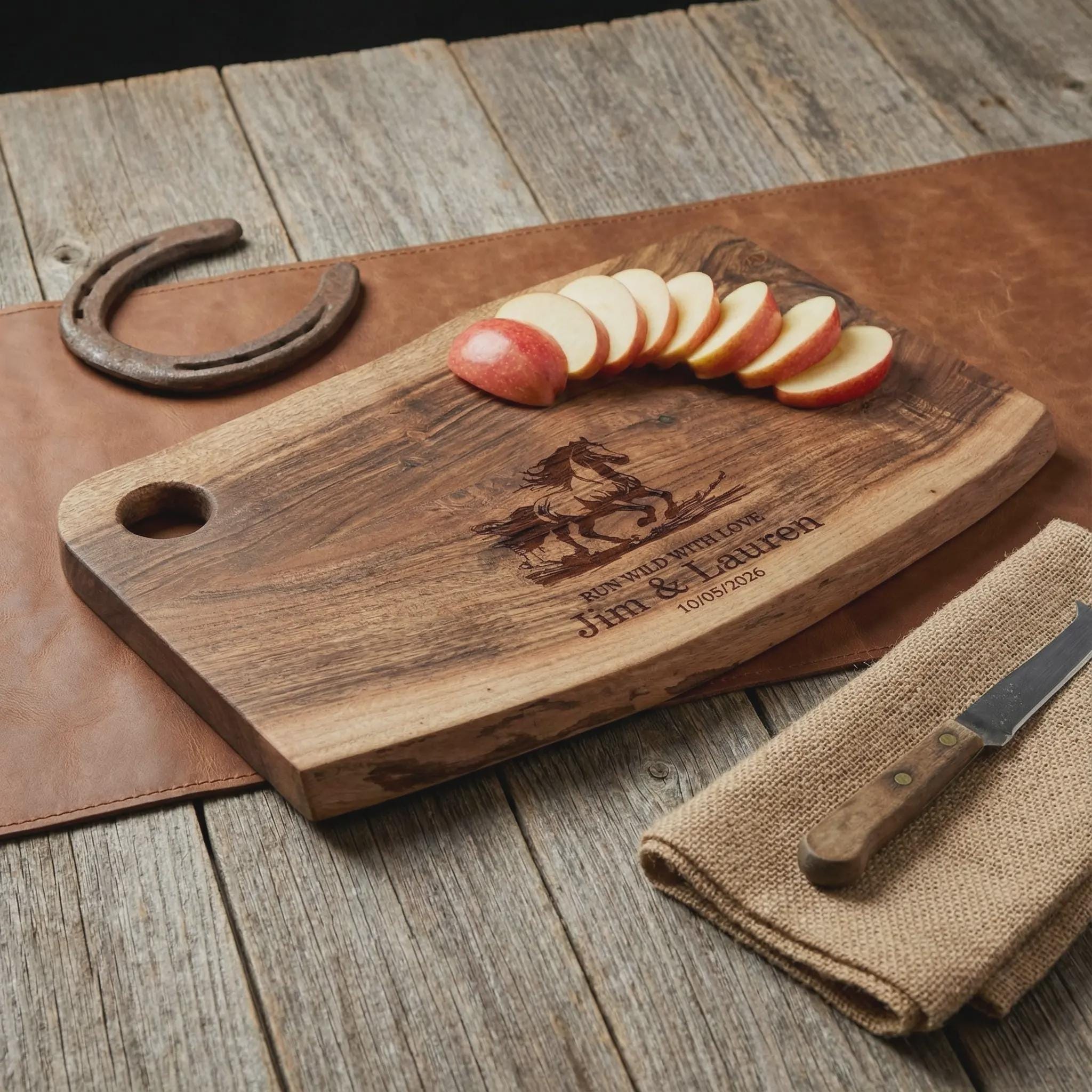 Celebrate their unbridled love with this personalized horse cutting board. Featuring a rustic 'Run Wild With Love' engraving on natural live edge wood, this custom charcuterie platter is the ultimate western wedding gift or ranch housewarming present.