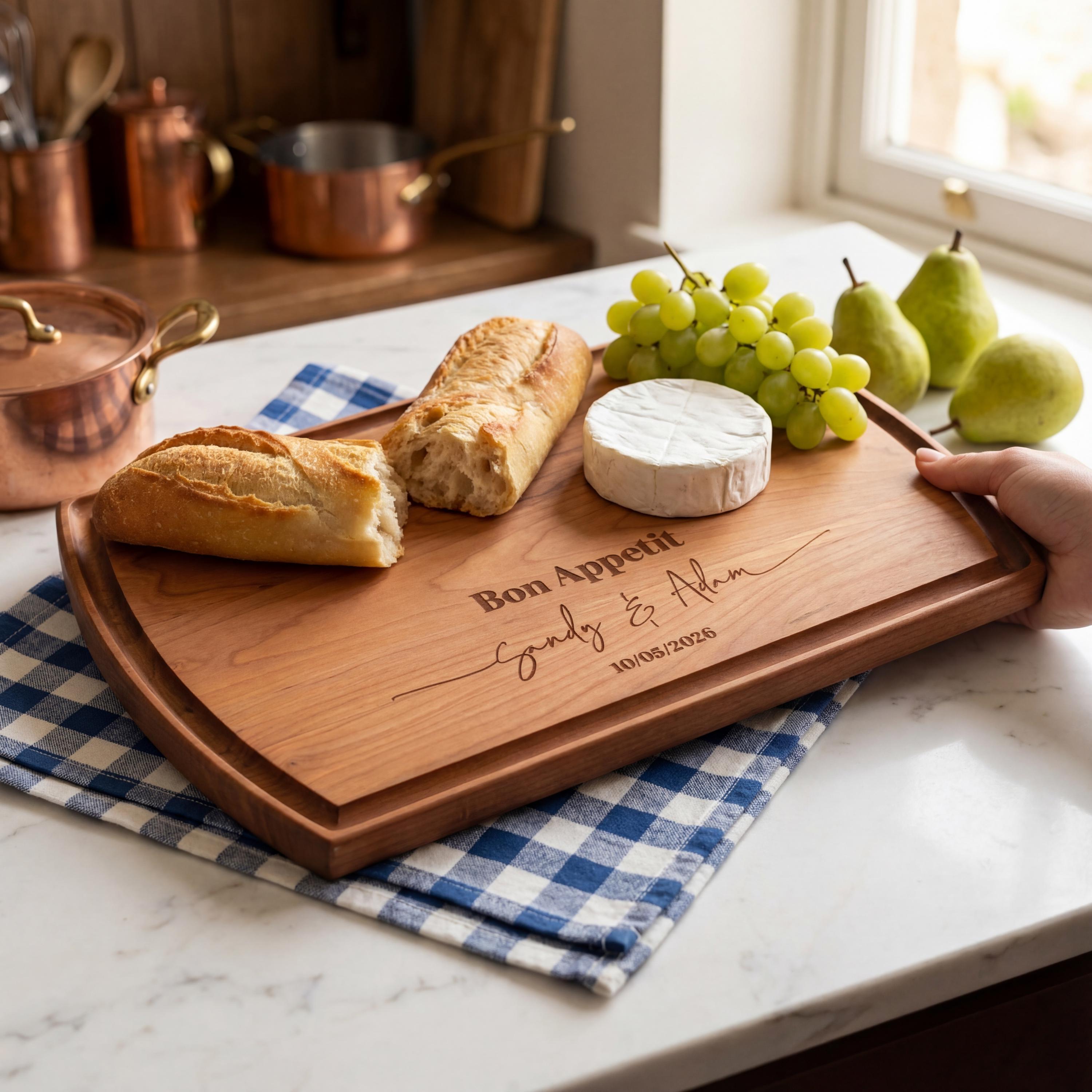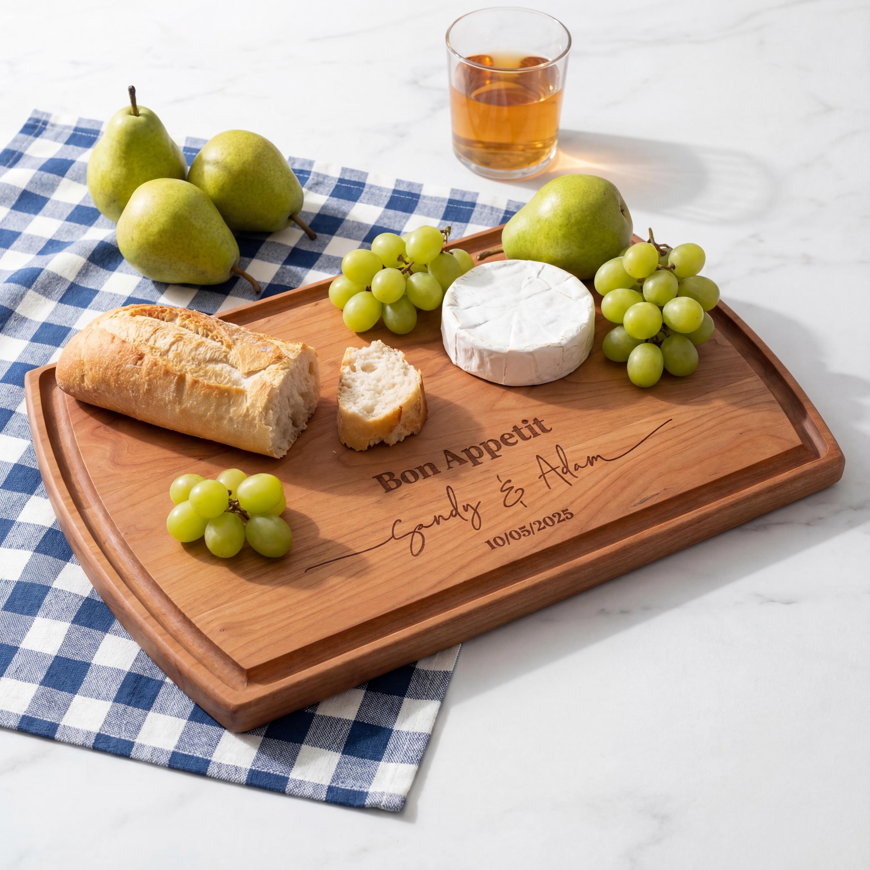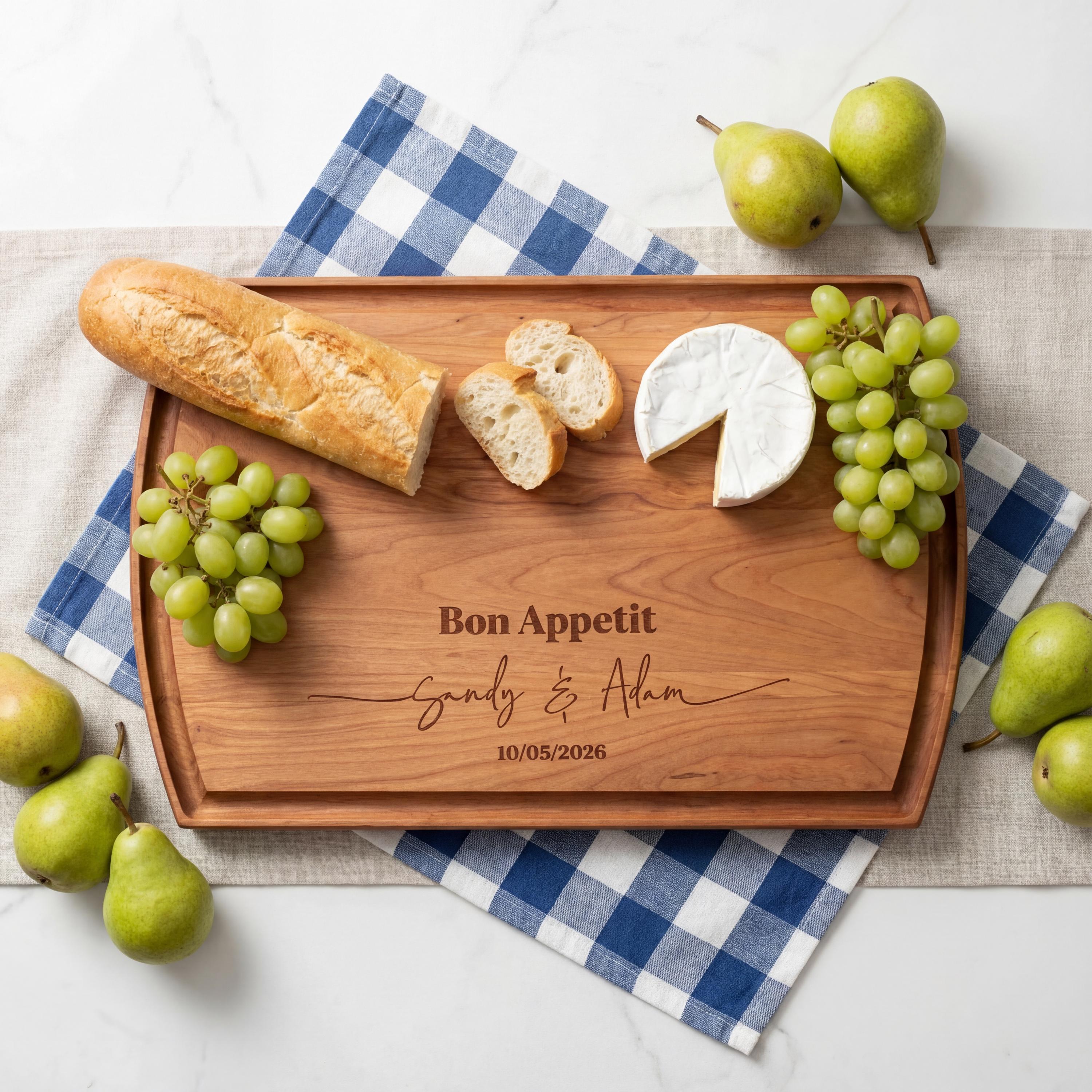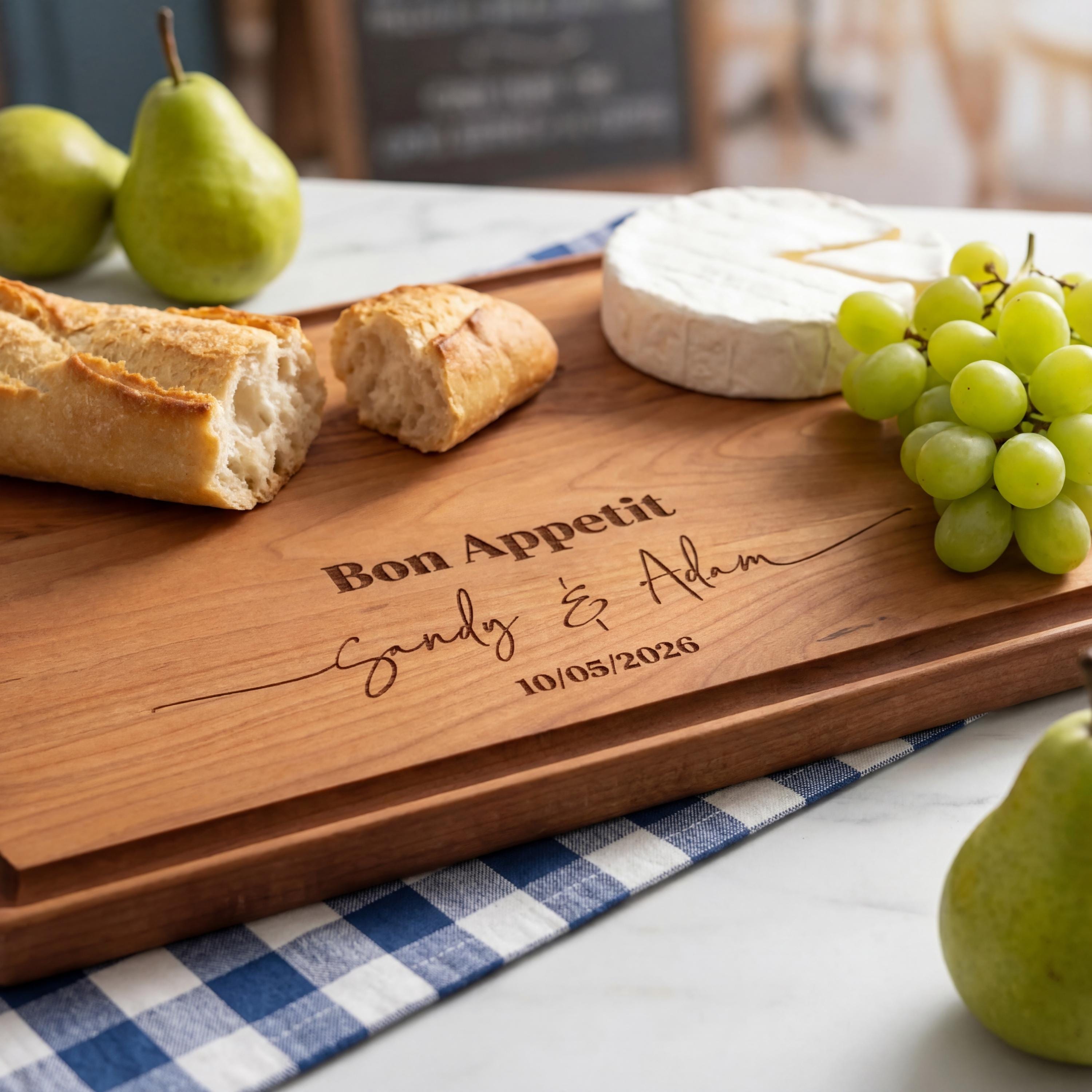 Inspire their culinary adventures with this personalized cutting board. Featuring the classic 'Bon Appetit' engraving and a deep juice groove, this cherry wood charcuterie board is the ultimate foodie gift for couples or a wedding present.