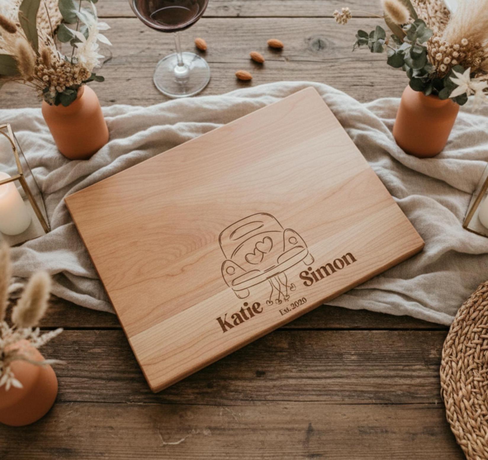 Celebrate love with our Beatles Wedding Cutting Board! This personalized gift features a charming engraved drawing of a Beatles wedding car with hearts, along with the couple's names and the date. A unique and cherished keepsake!
