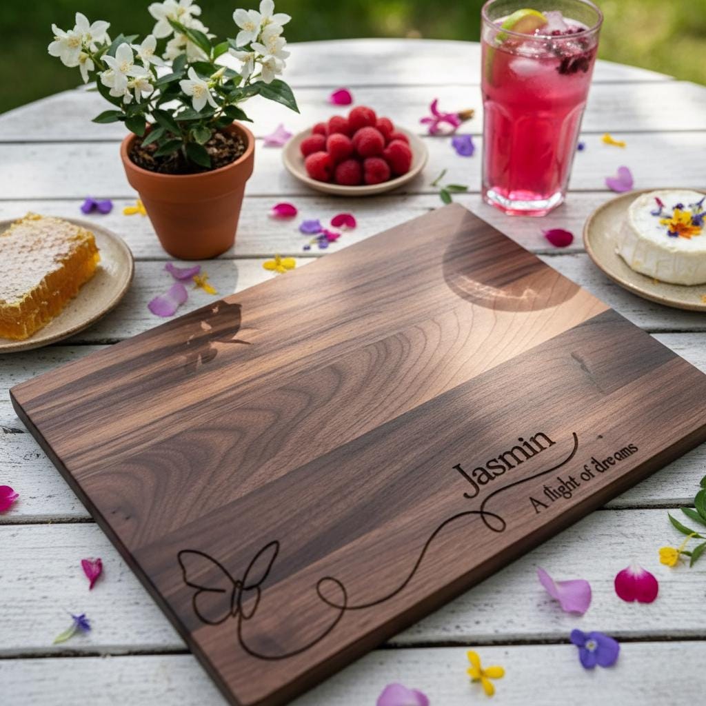 Discover the allure of personalized art with our exquisitely crafted Cutting Board, engraved with a hand-drawn butterfly and the inspiring quote "A Flight of Flavors." Tailored with your chosen name, this unique piece serves as both a functional kitchen tool and a heartwarming decorative treasure.