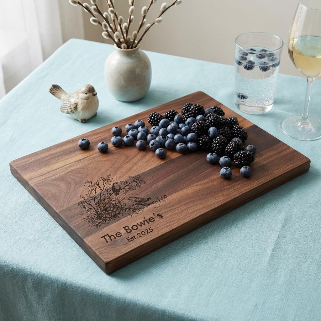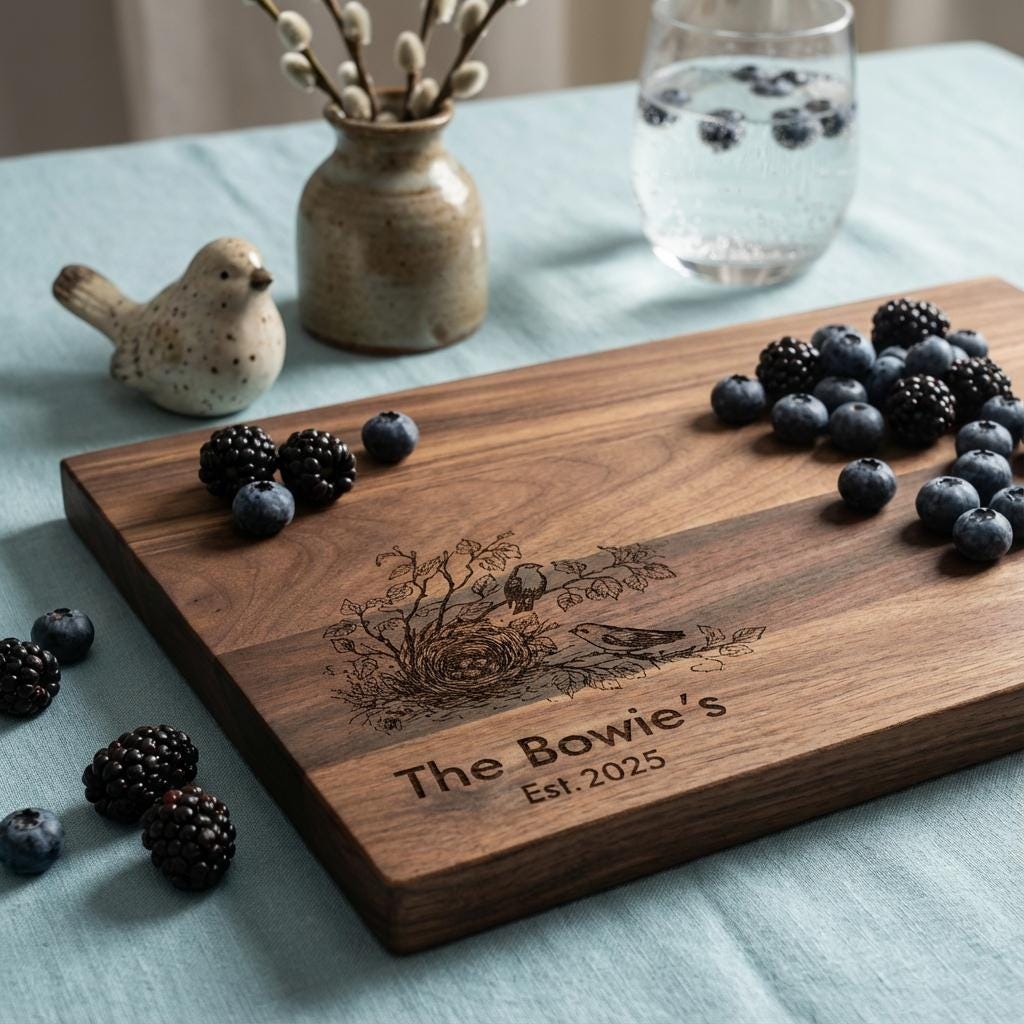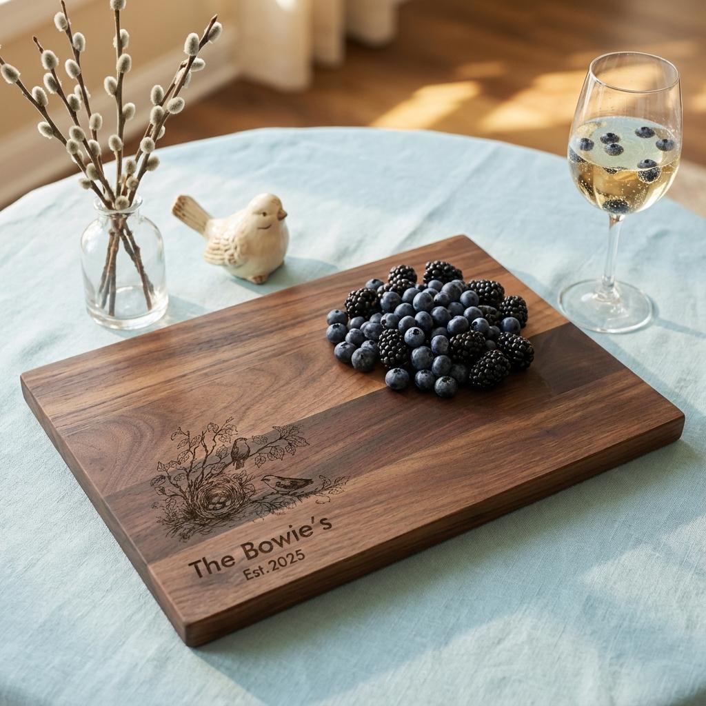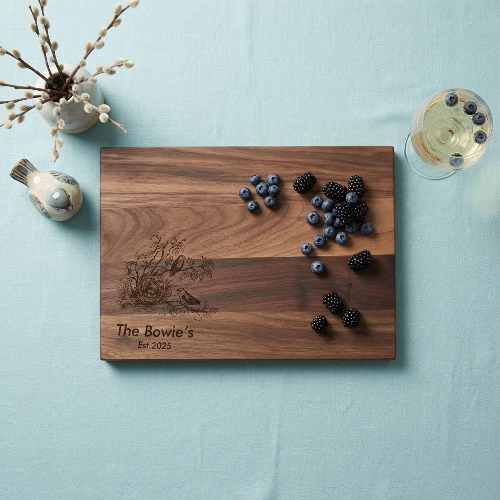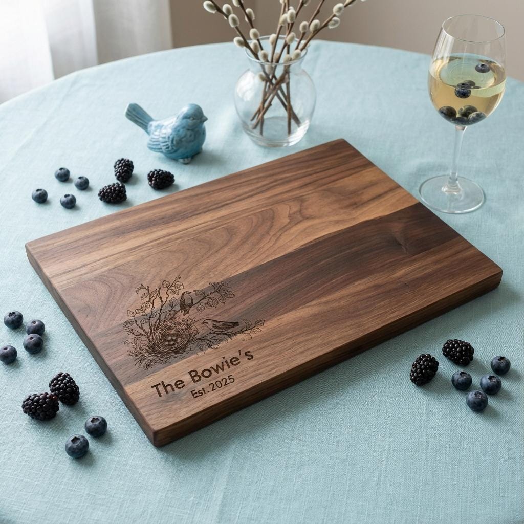 Celebrate their new home with this personalized bird nest cutting board. Featuring a rustic family nest engraving and rich walnut wood, this custom charcuterie board is the ultimate housewarming gift or wedding keepsake for couples.