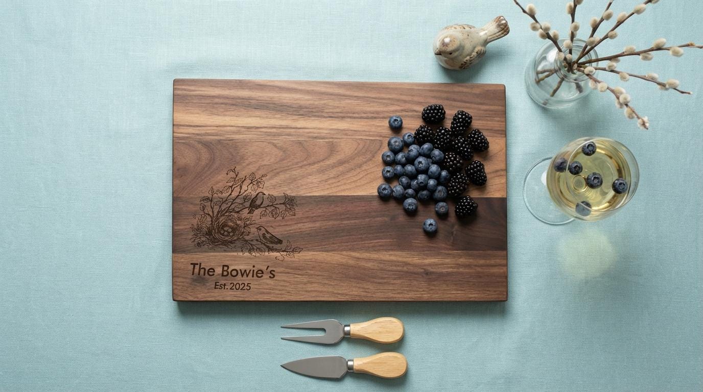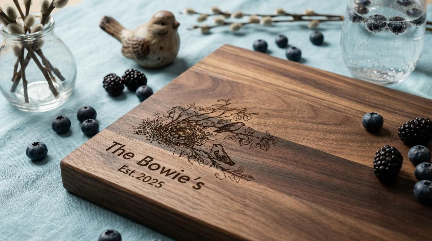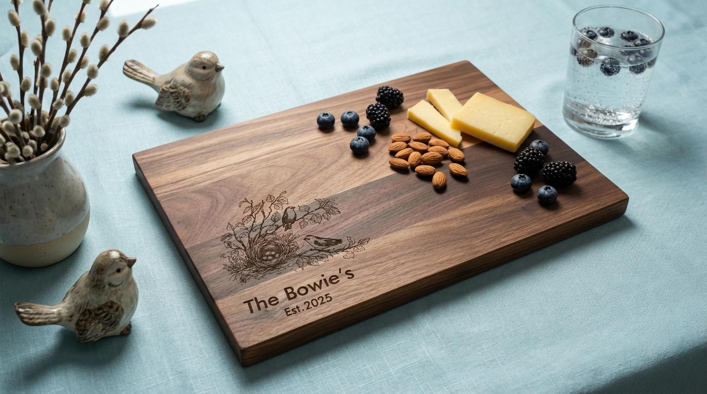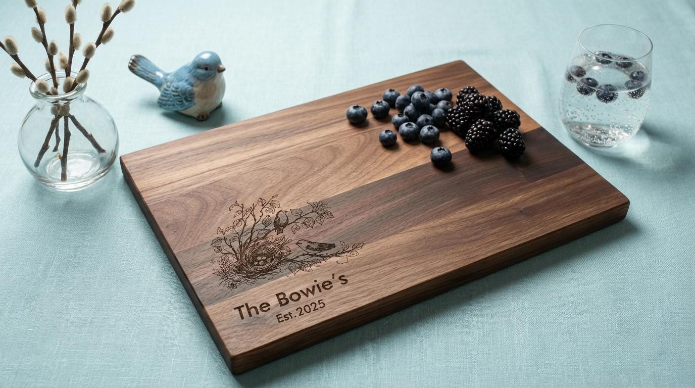 Celebrate their new home with this personalized bird nest cutting board. Featuring a rustic family nest engraving and rich walnut wood, this custom charcuterie board is the ultimate housewarming gift or wedding keepsake for couples.