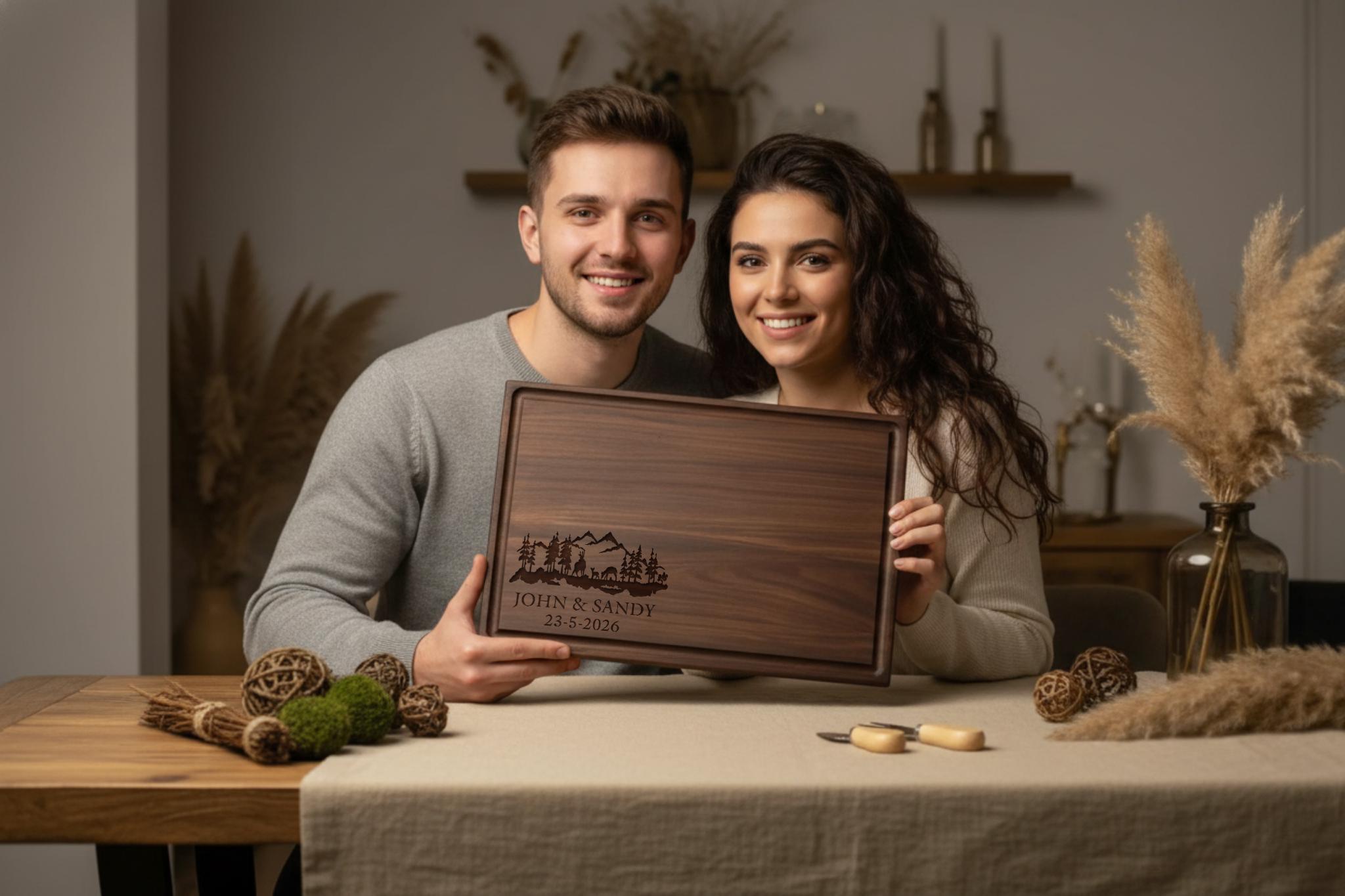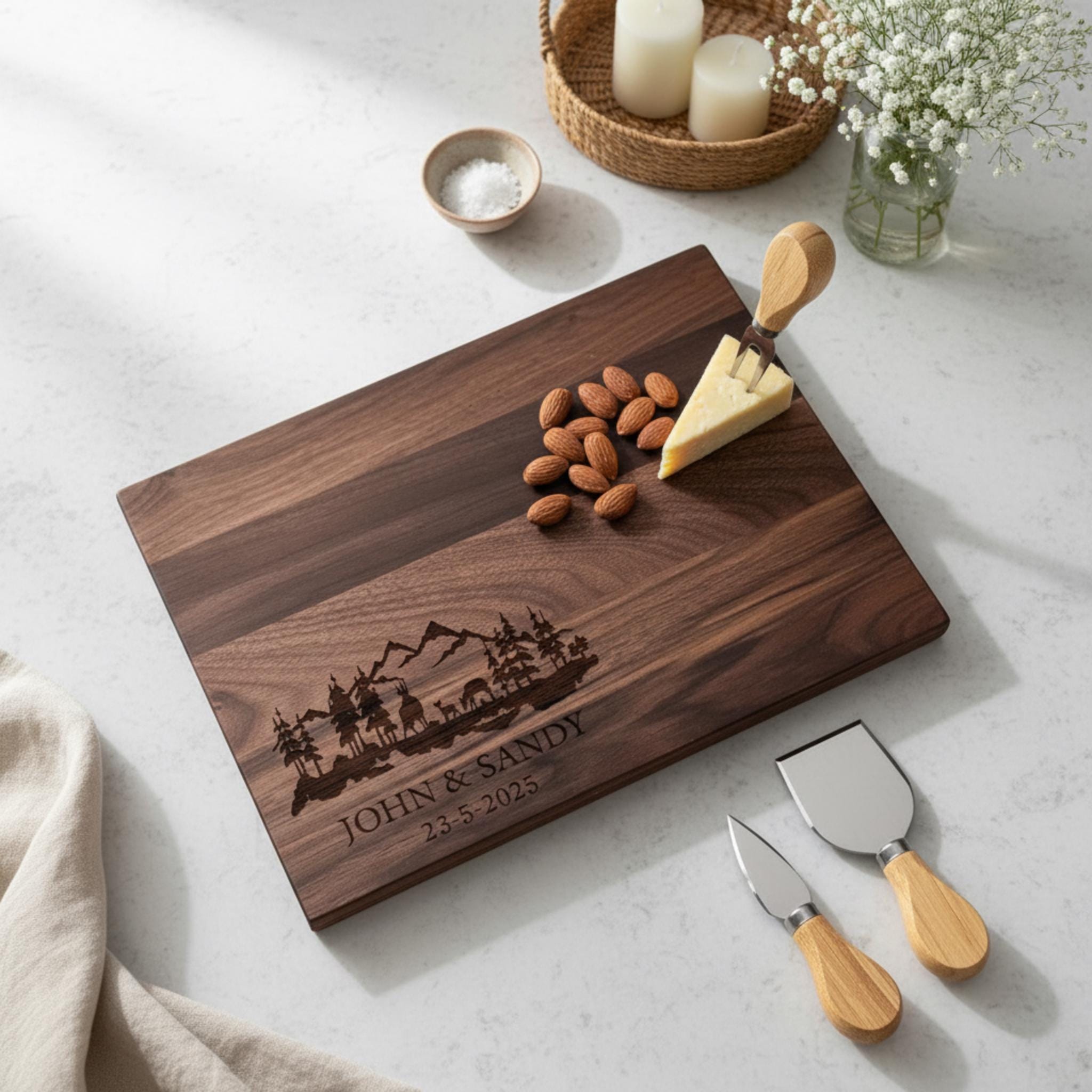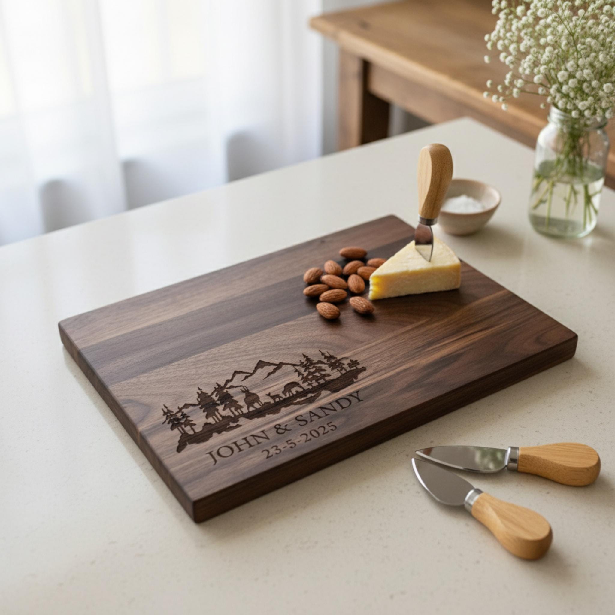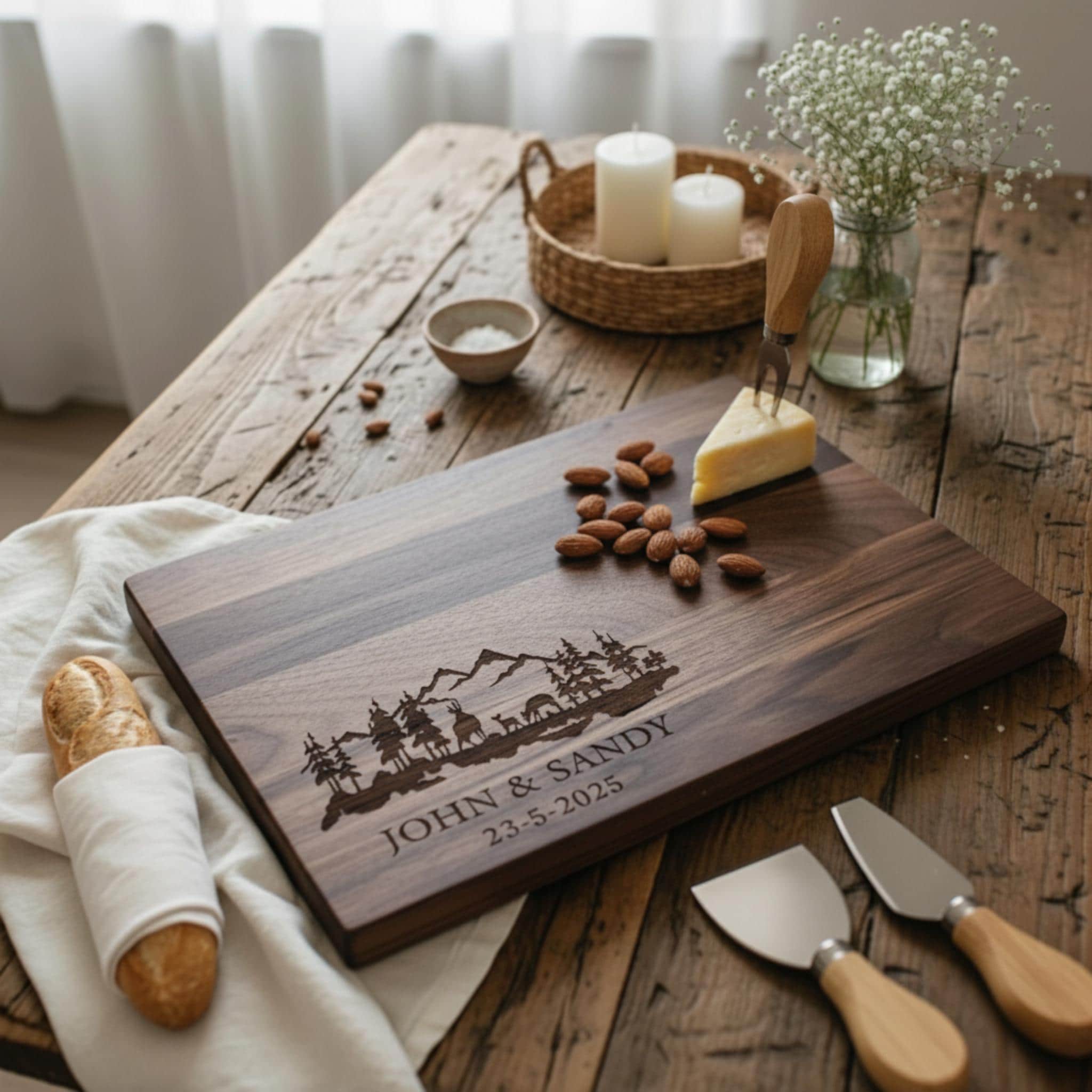 Personalized Walnut Charcuterie Board: Engraved Mountain Scene, Couple's Gift