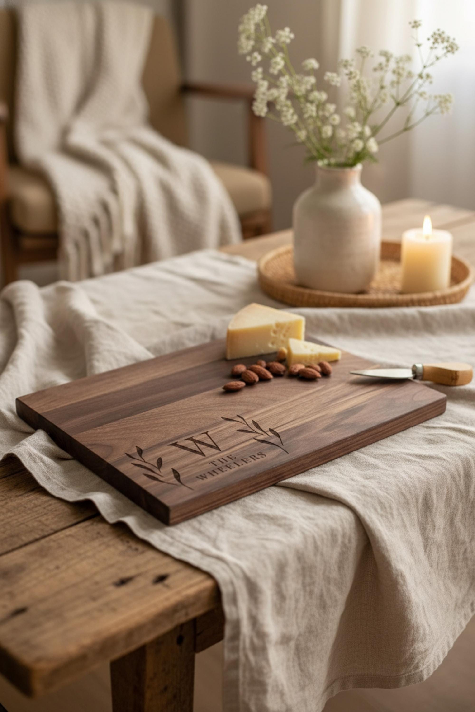 A Beautiful Keepsake for Couples & New Beginnings Celebrate the union of family and home with our Monogrammed Family Cutting Board—a truly personalized keepsake perfect for weddings, anniversaries, housewarmings, and more. Handcrafted from your choice of premium Walnut, Cherry, or Acacia wood, each board transforms everyday meal prep into a cherished ritual. Its elegant design and custom engraving create a timeless piece that not only serves as a practical kitchen tool but also as a decorative charcuterie board and a statement of lasting love.