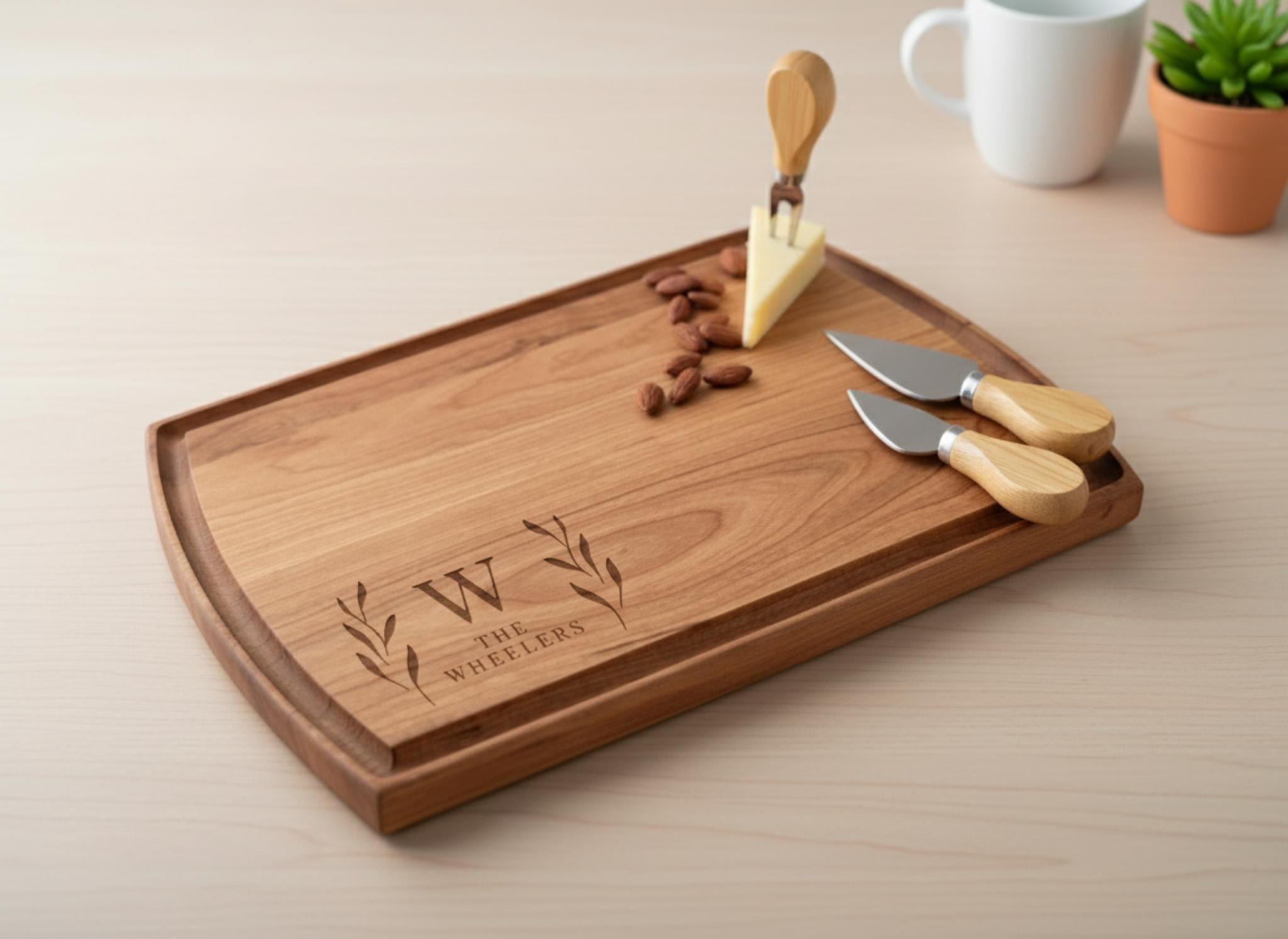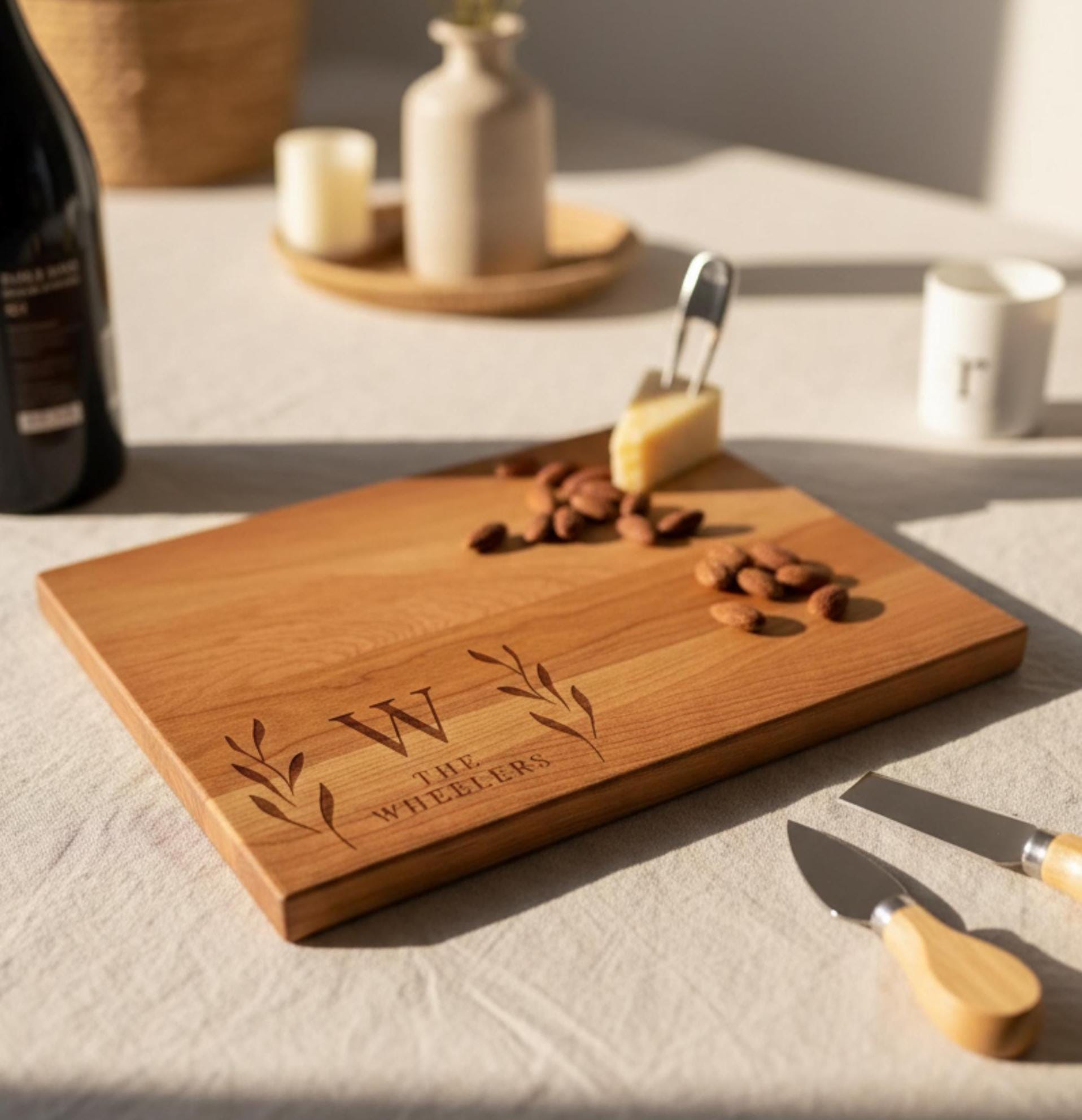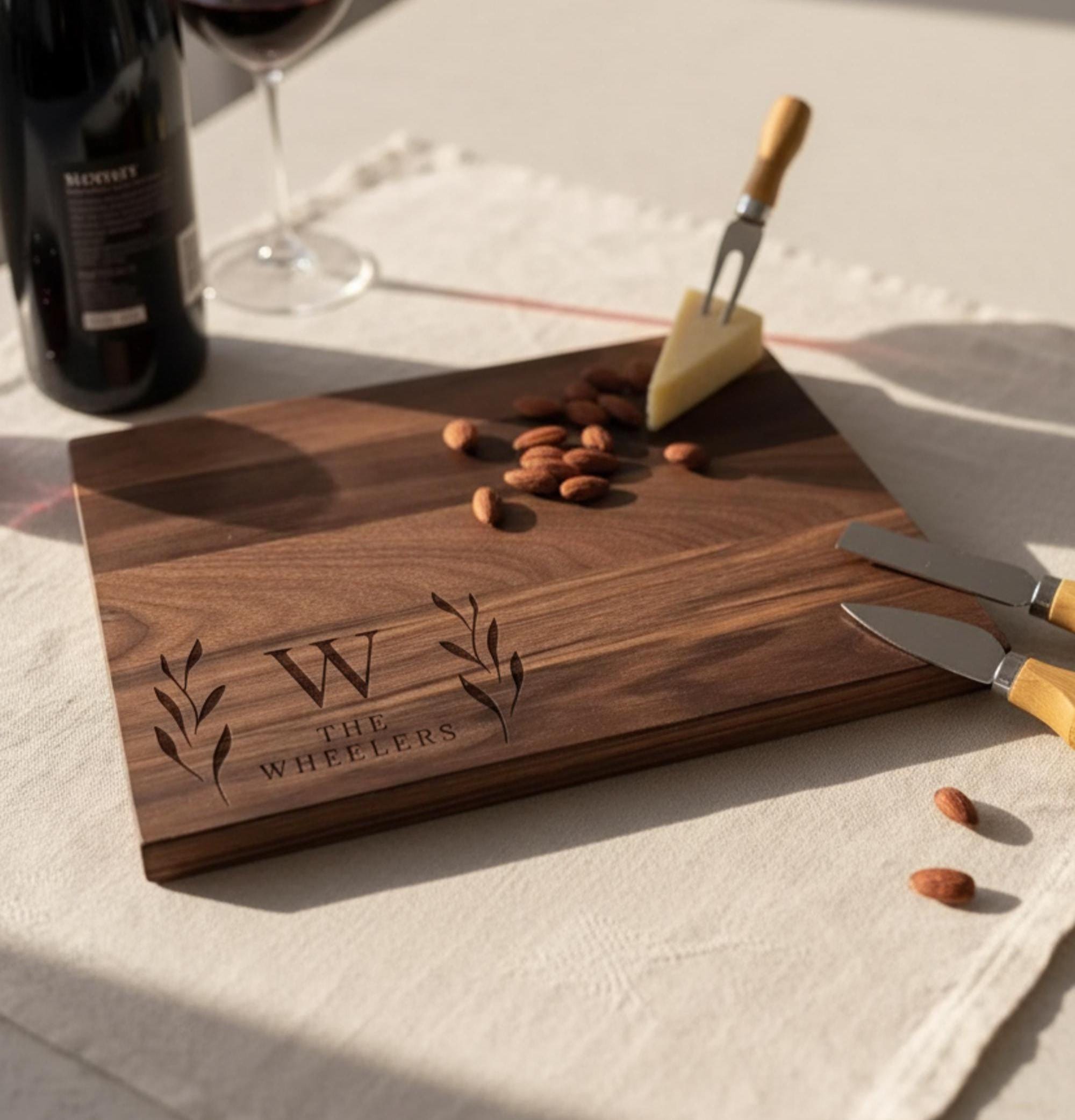 Custom Laser Engraving: Personalize your board with a beautifully engraved monogram featuring the family initial and name, celebrating your unique story.