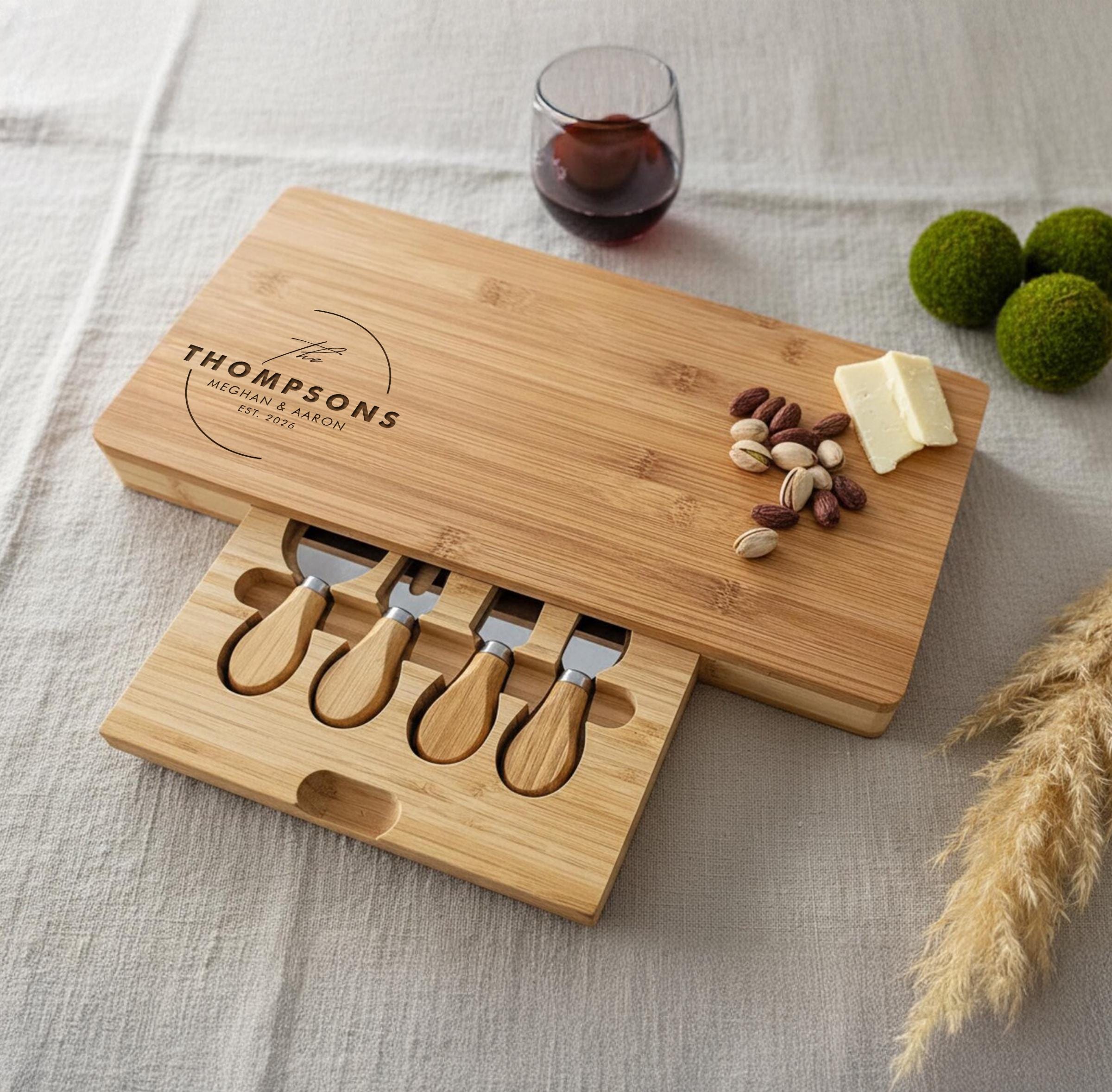 Personalized Charcuterie Board, Family Gift: Custom engraved Bamboo Cheese Board With Knives, Wedding, Housewarming, Anniversary Gift