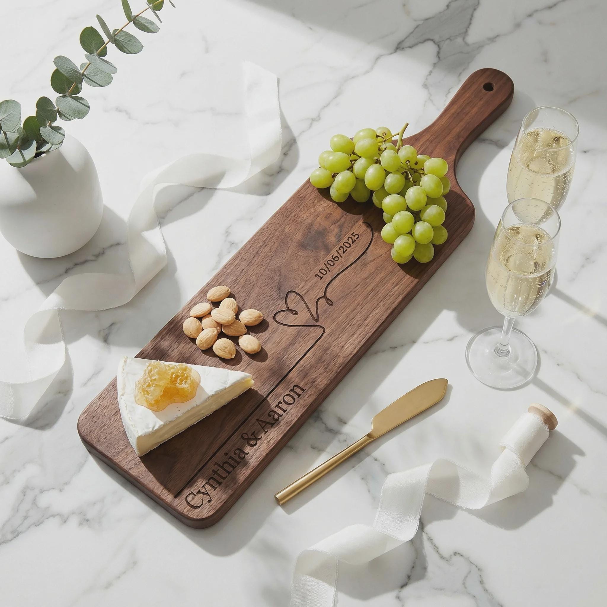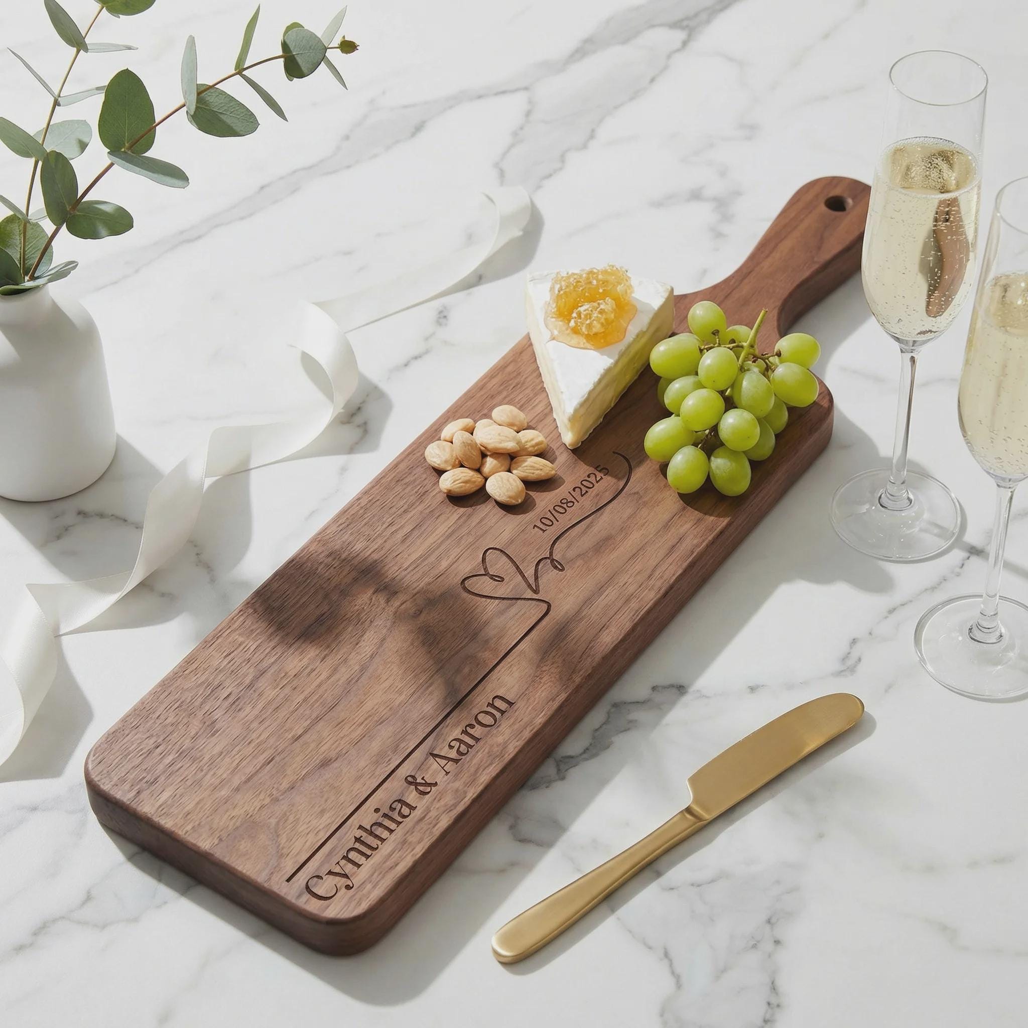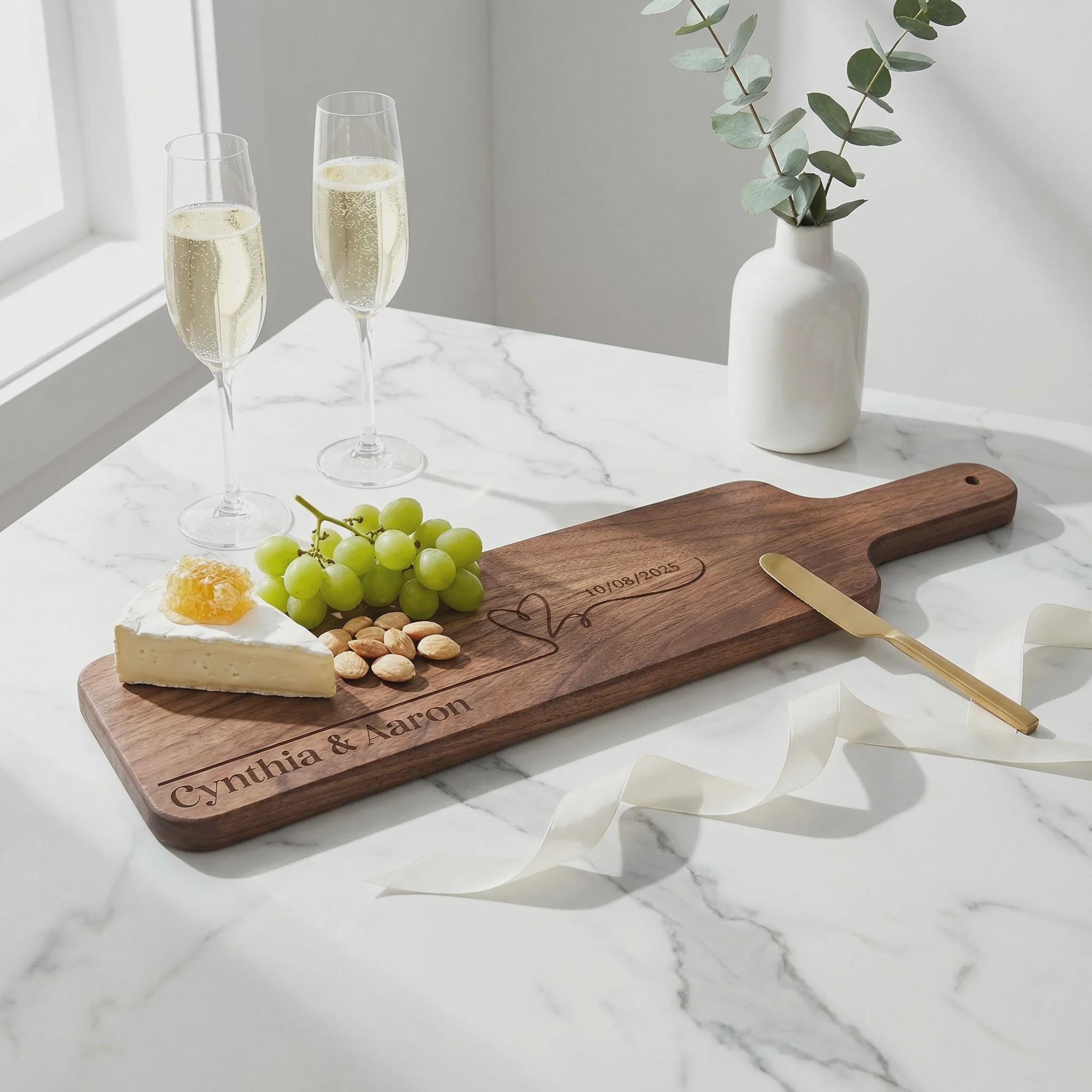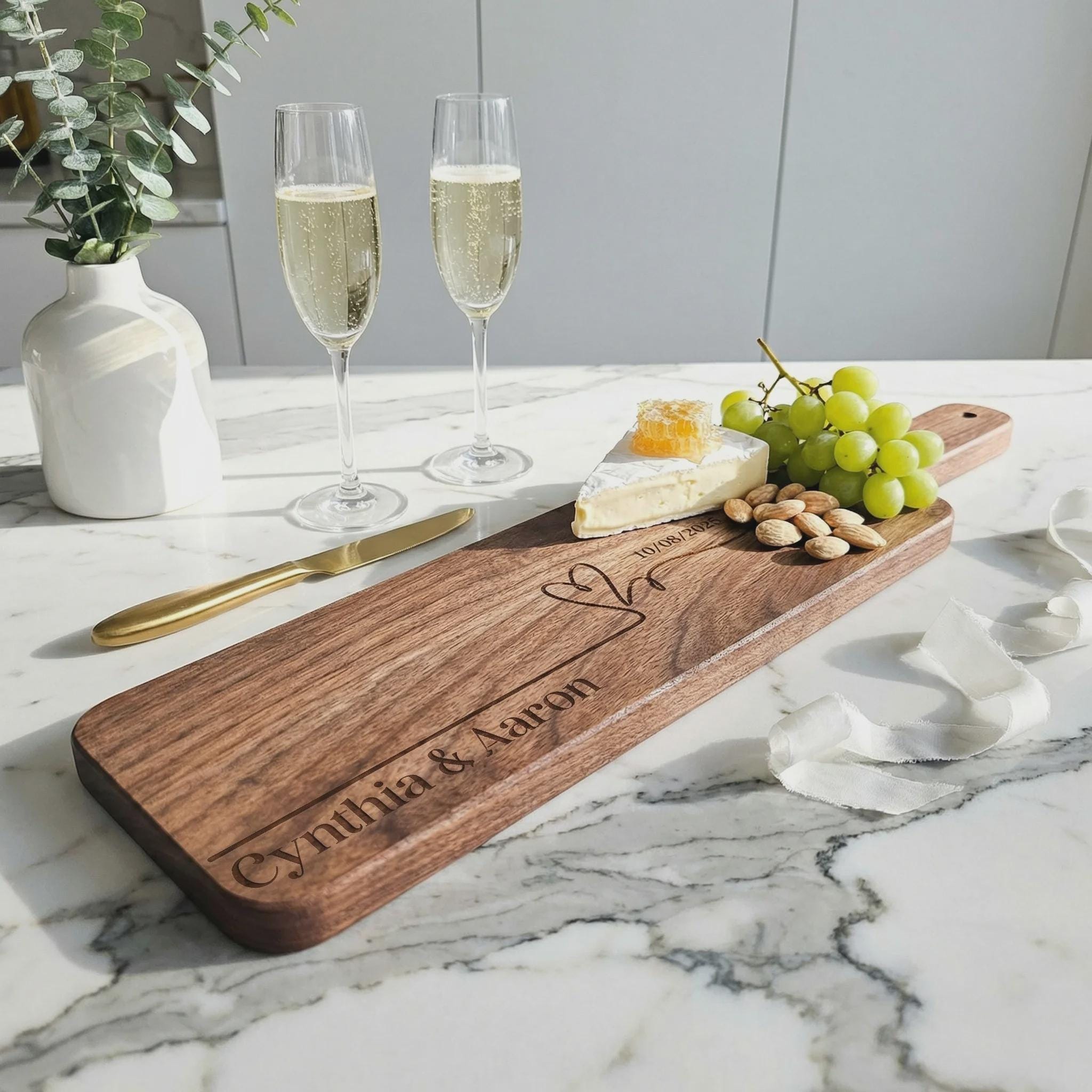 Elevate your hosting with this personalized long wood bread board. Hand-crafted from premium solid natural wood, each board is precision laser engraved with a modern heart motif and your custom text. Featuring a sleek, elongated profile, it serves as a professional-grade slicing surface for artisan baguettes and a sophisticated centerpiece tray for cheeses and charcuterie.