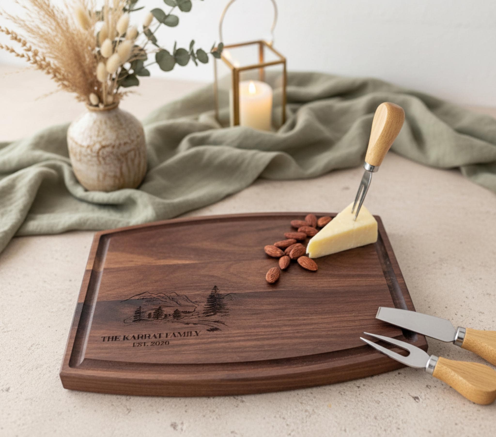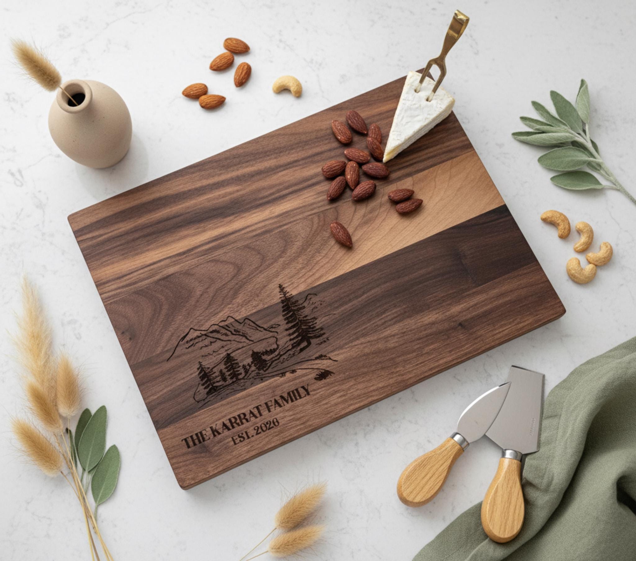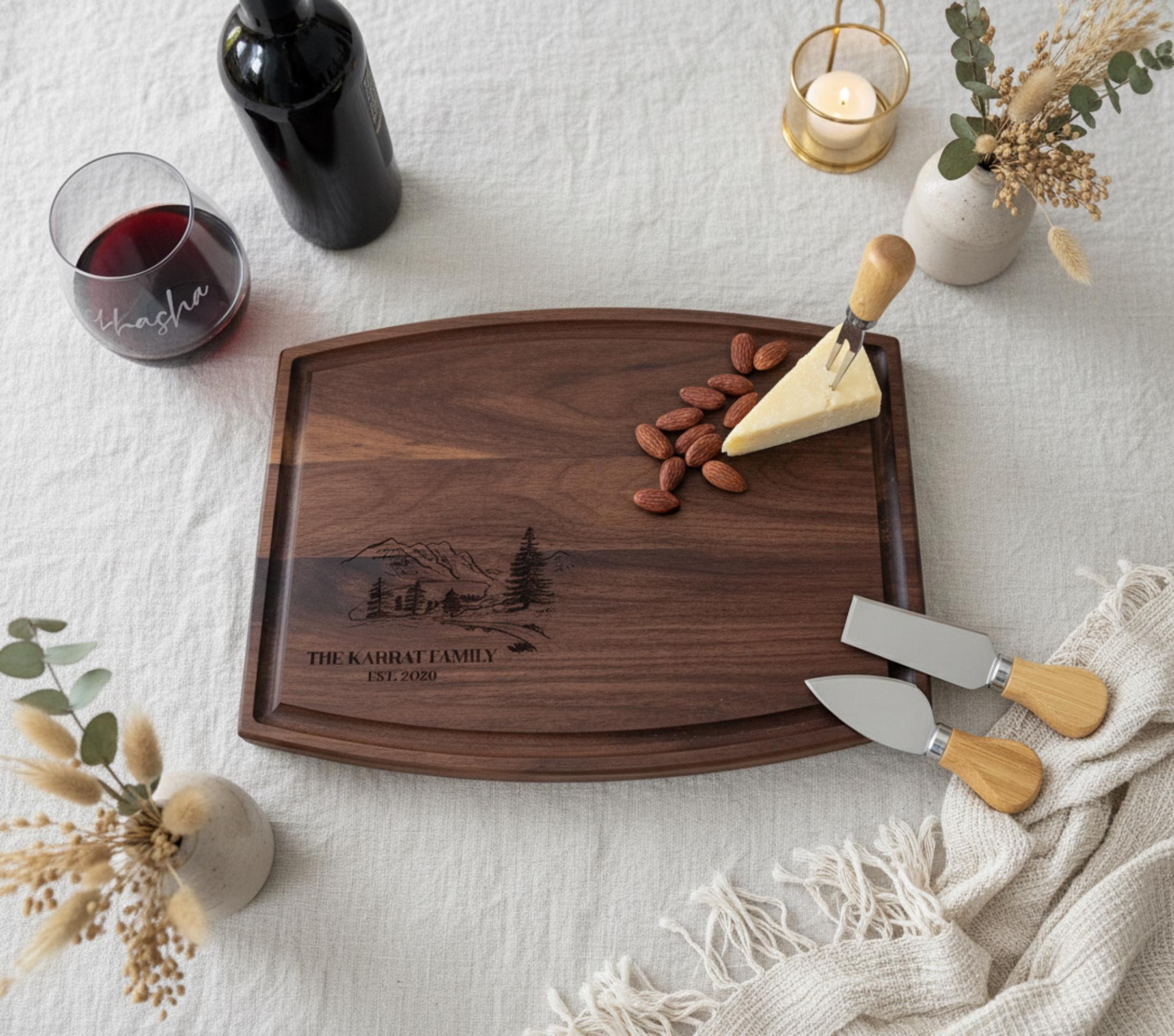 Scenic Custom Engraving: Elegantly etched with a detailed mountain scene, pine trees, and a winding road, our cutting board symbolizes life’s meaningful journeys. With its thoughtful personalization options, it makes an unforgettable Scenic Gift for weddings, anniversaries, housewarmings, or even as a timeless addition to your kitchen décor.