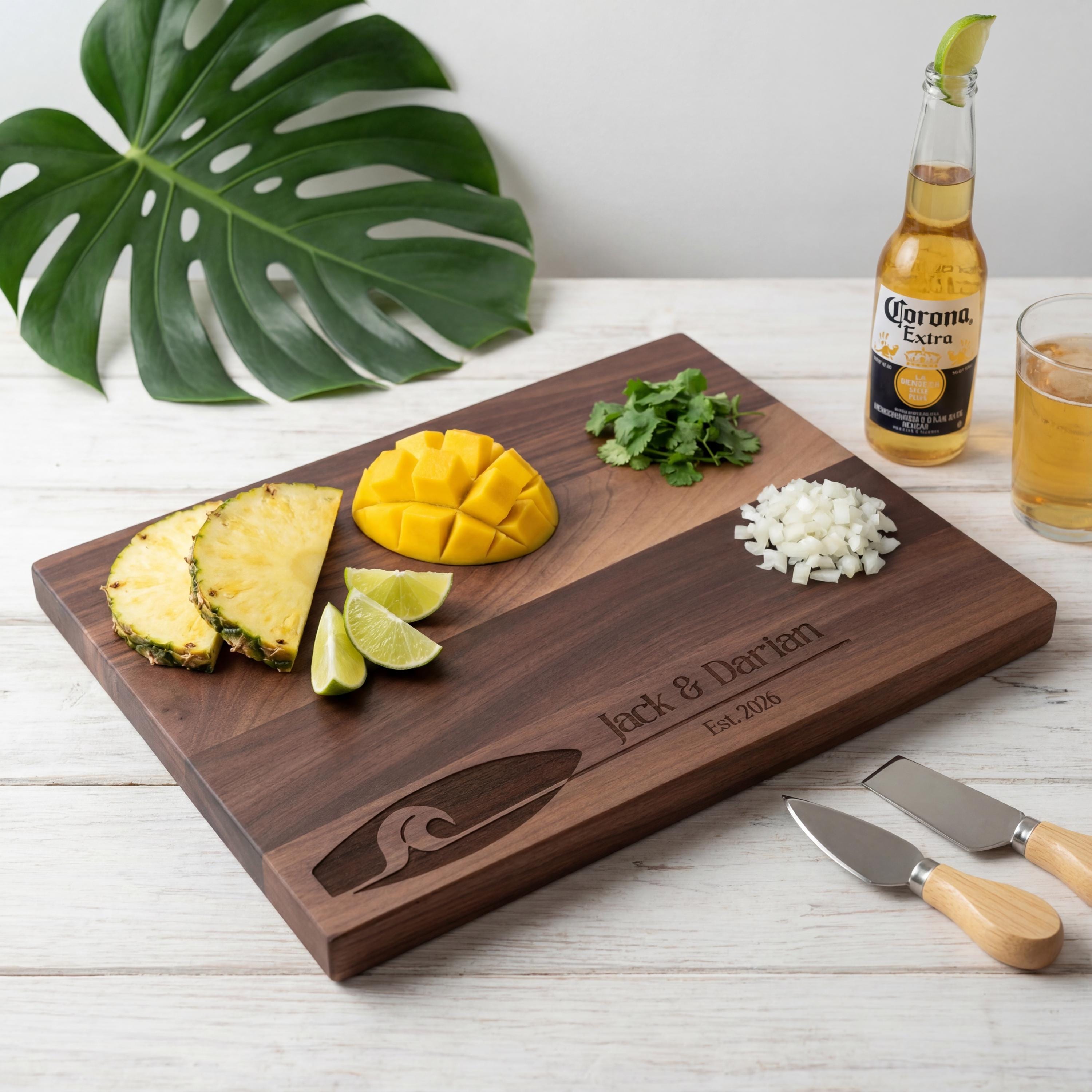 Personalized Charcuterie Board – Surfing Couple: Custom Cutting Board | Beach Wedding, Ocean Decor, Surfboard, Housewarming, Engagement Gift