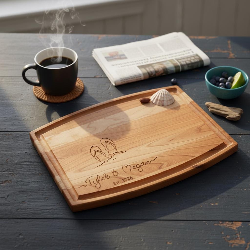 Bring the vacation vibes home with this personalized beach cutting board. Featuring a cute flip-flop engraving and deep juice groove, this custom wood charcuterie board is the ultimate destination wedding gift or coastal housewarming present.