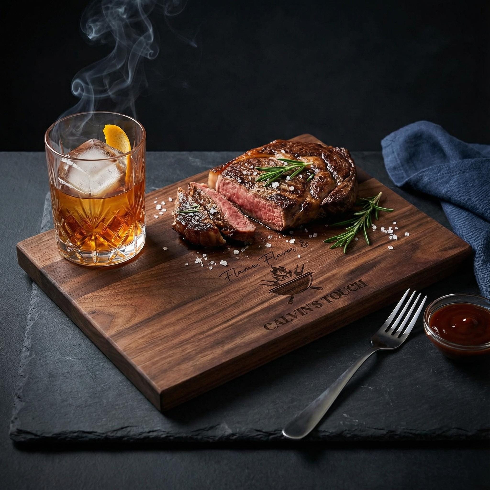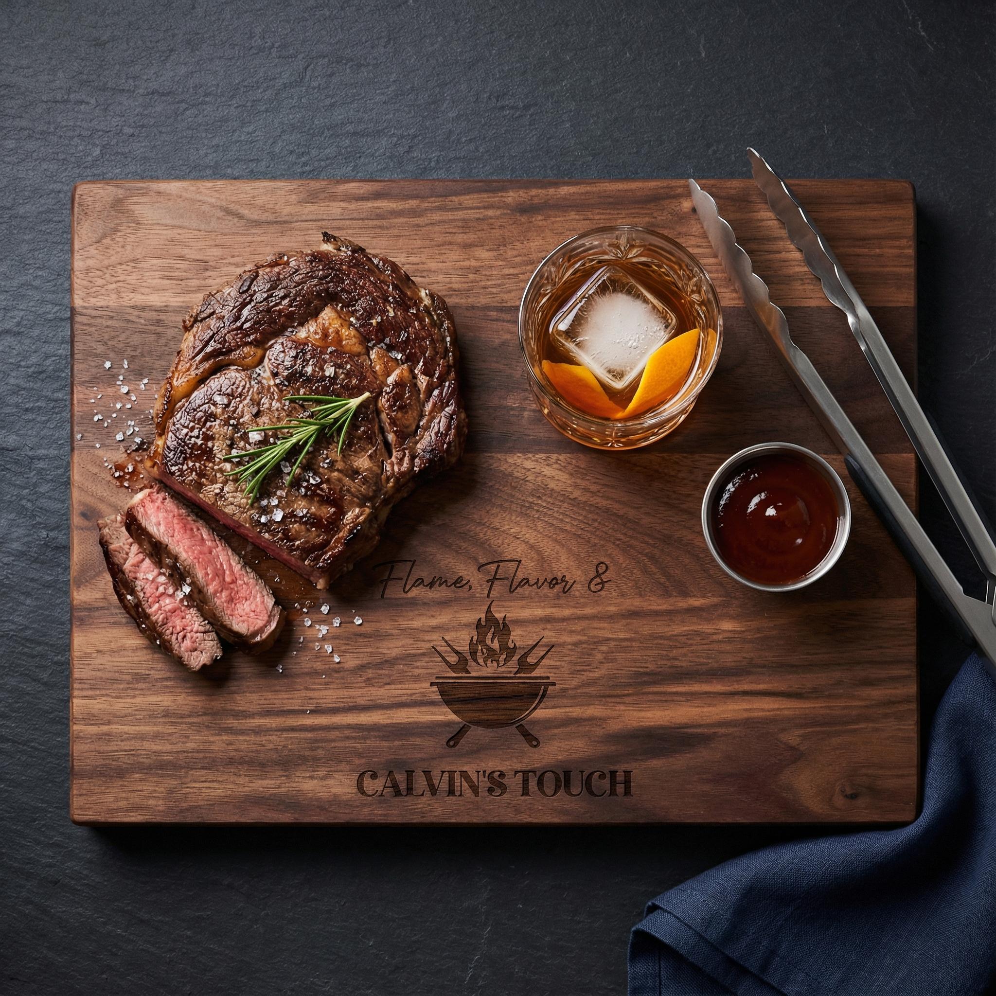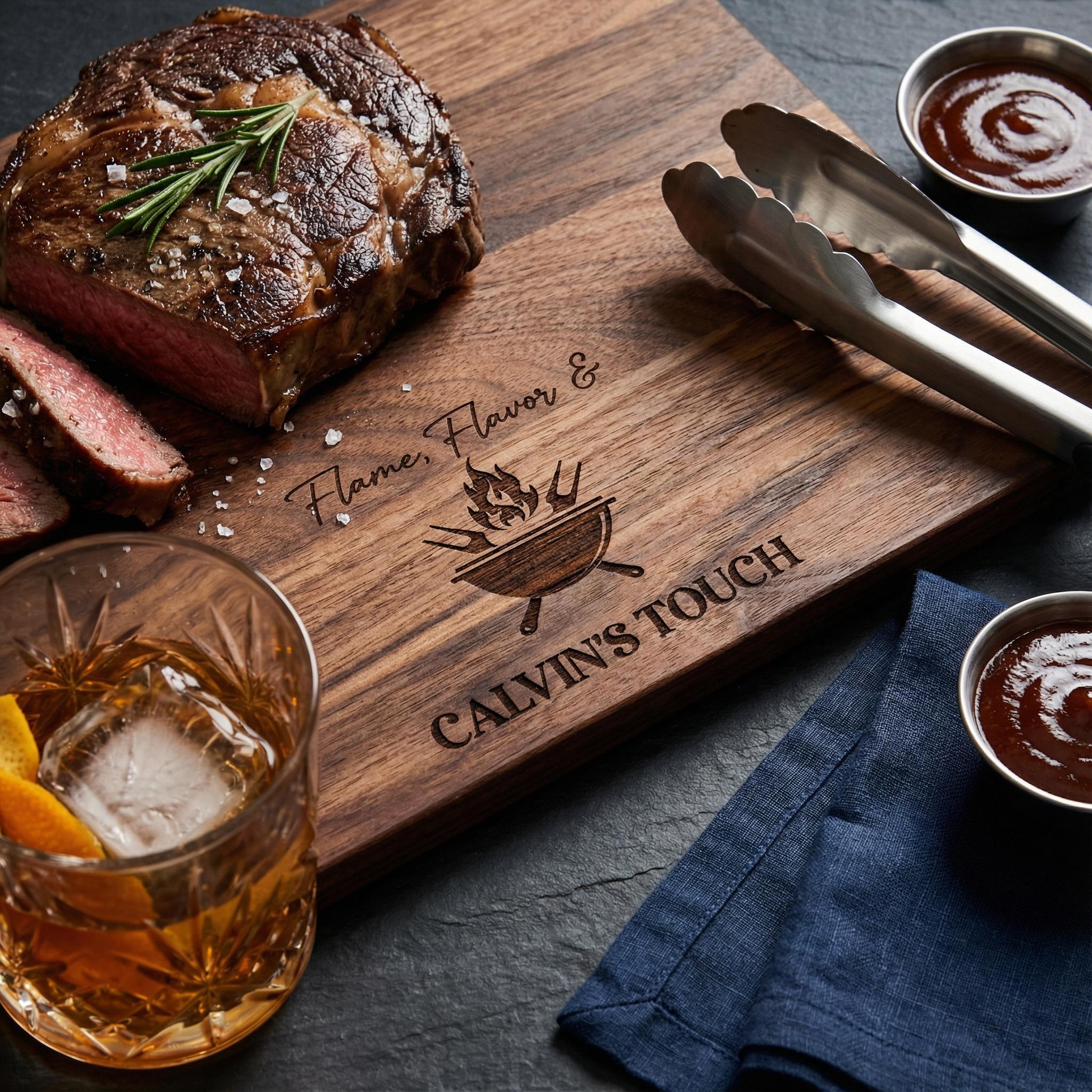 Striking Signature Engraving: Our skilled artisans bring your board to life by engraving “Flame, Flavor & [Name]'s Touch” with precision and artistry. This custom detail celebrates the unique touch that Dad brings to every meal.