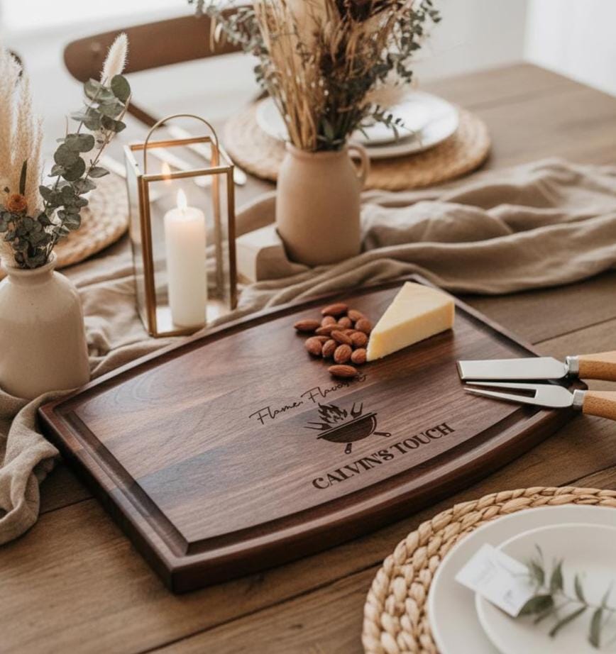 Striking Signature Engraving: Our skilled artisans bring your board to life by engraving “Flame, Flavor & [Name]'s Touch” with precision and artistry. This custom detail celebrates the unique touch that Dad brings to every meal.