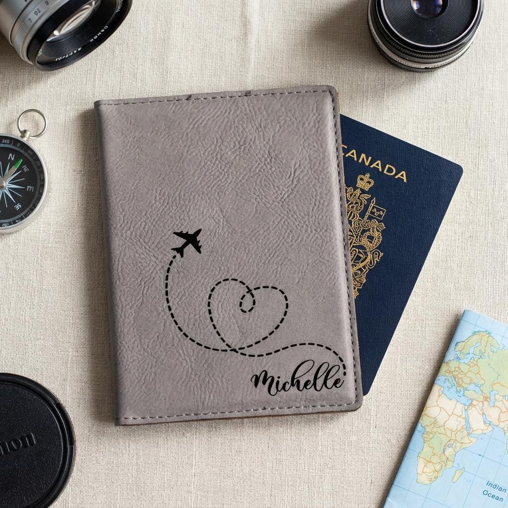 Embark on your next adventure with our personalized vegan leather passport cover, uniquely engraved with a heart and an airplane alongside your custom name. This travel accessory combines chic style with practical protection, making it the perfect souvenir or gift for explorers and romantics alike.