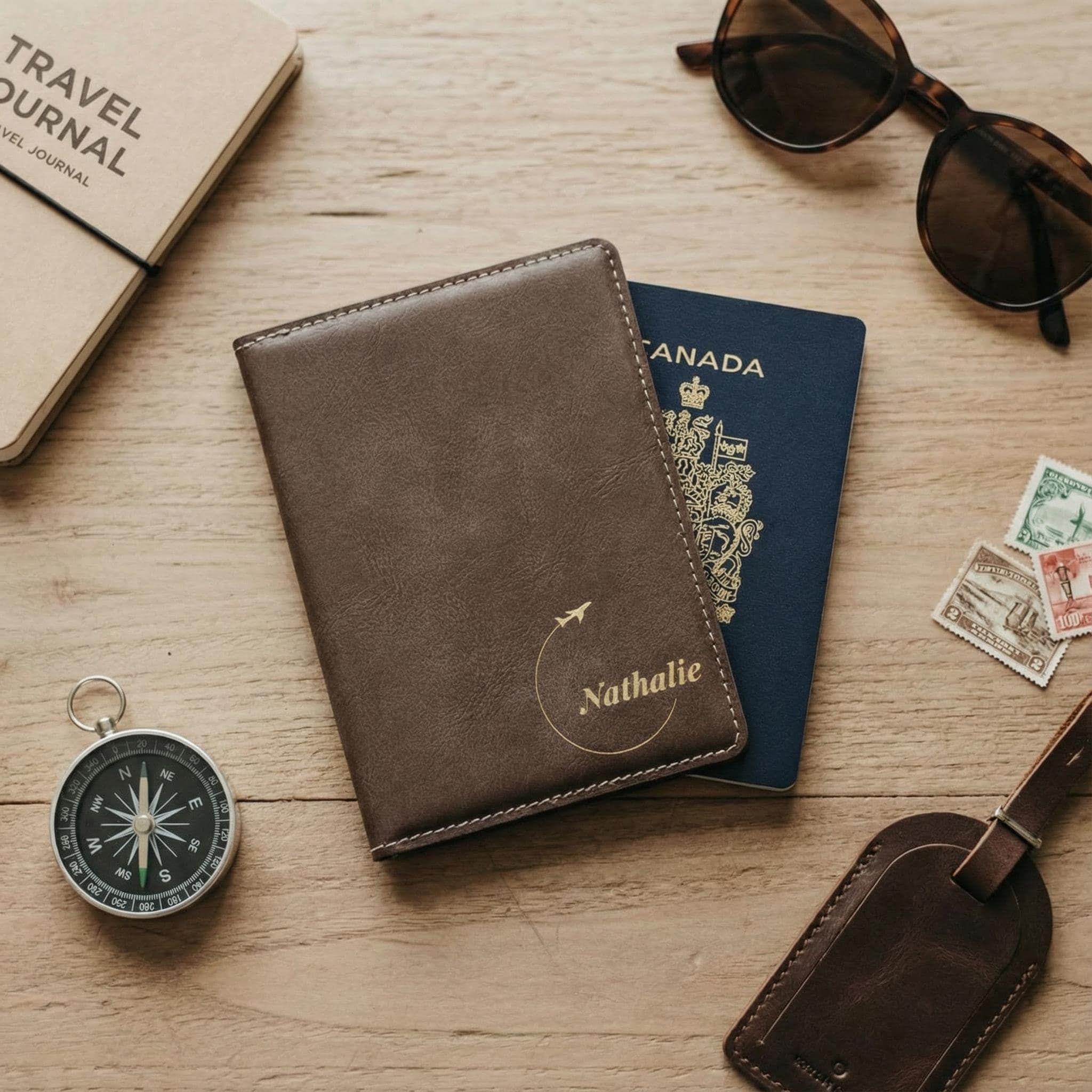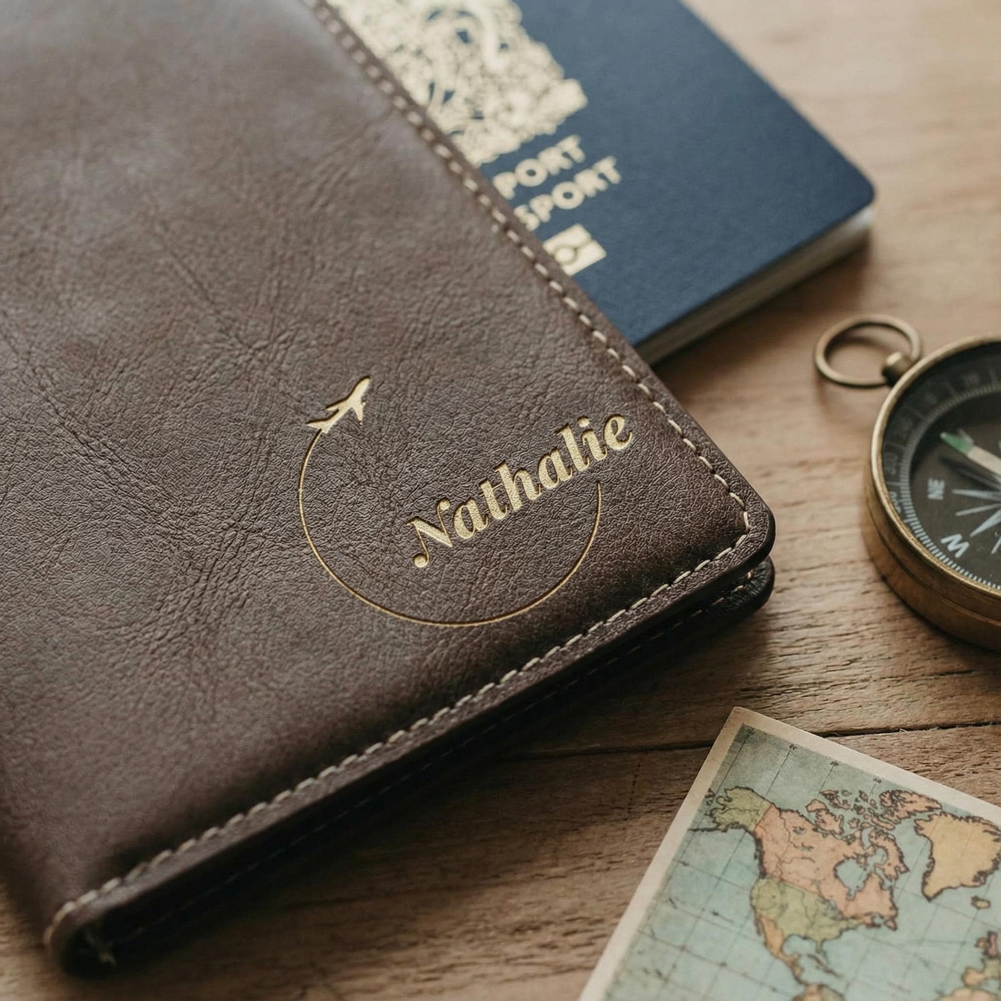 Custom Airplane Design: The chic airplane icon is laser-engraved alongside your name—making each cover a unique travel keepsake.