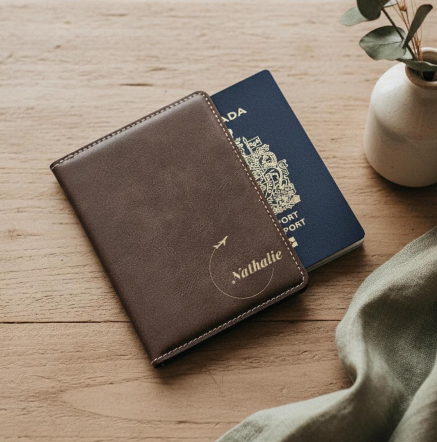 Take to the skies with our personalized vegan leather passport cover, tailored just for you. This travel accessory is expertly crafted in cruelty‑free vegan leather and features a stylish engraved airplane paired with your custom name. It’s the perfect companion for those who love to explore while keeping their essentials safe.
