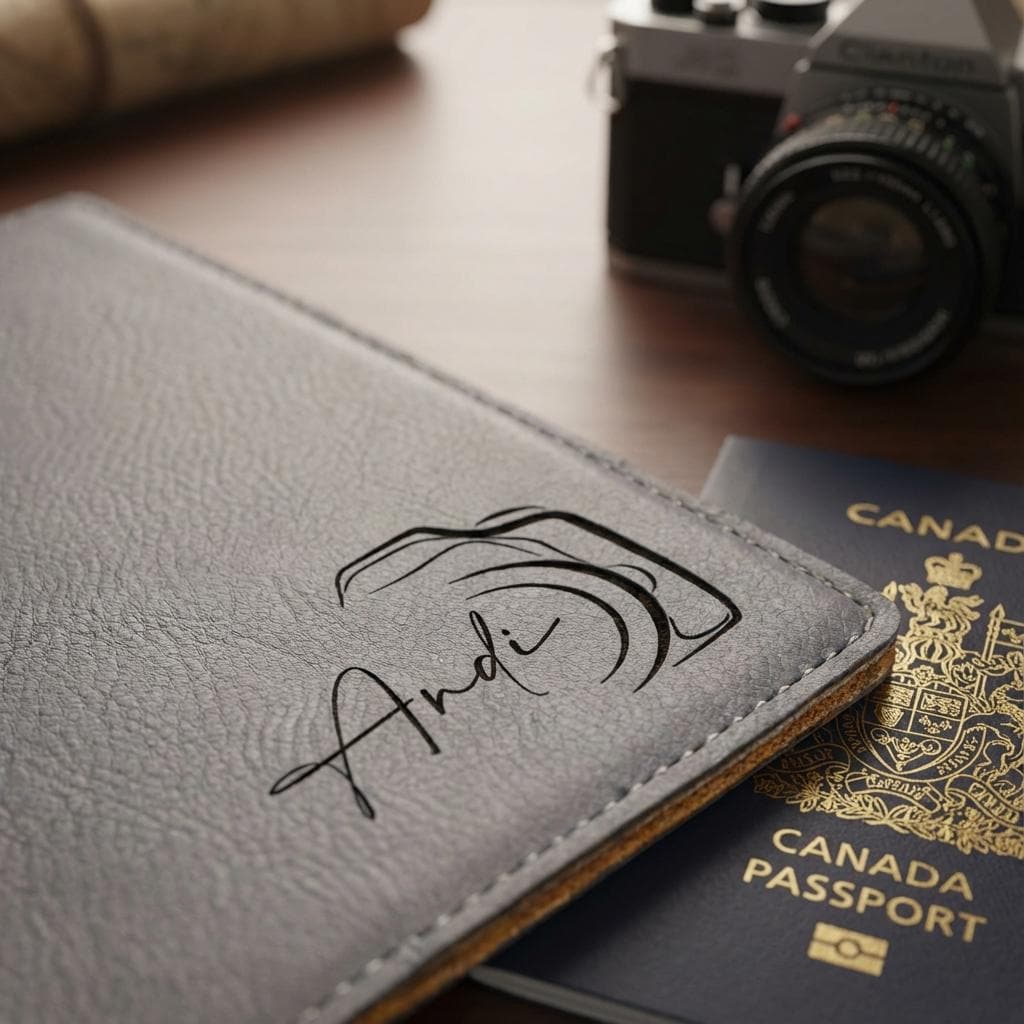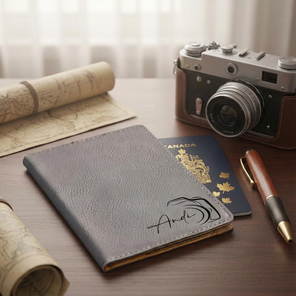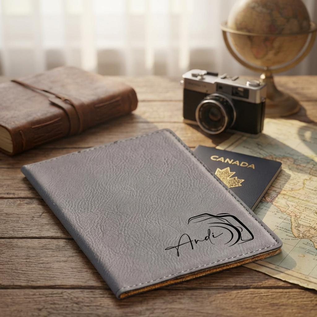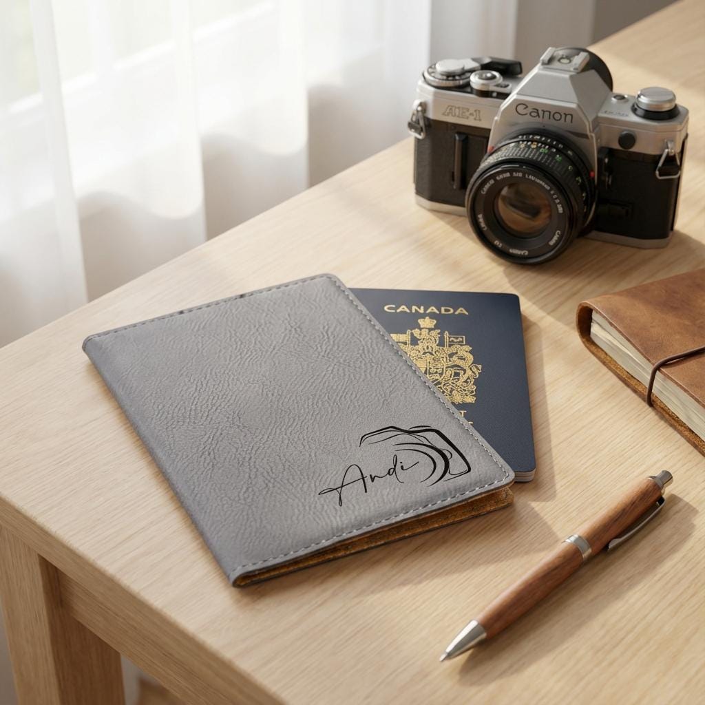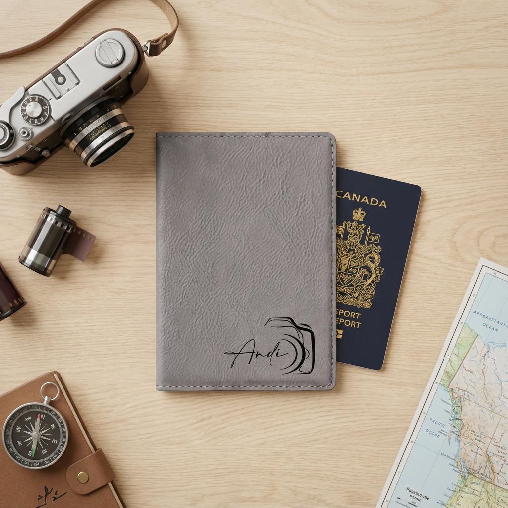 Capture your next adventure with this personalized passport holder. Featuring a sleek camera lens engraving and custom name, this vegan leather travel wallet is the perfect photographer gift or travel accessory for him.