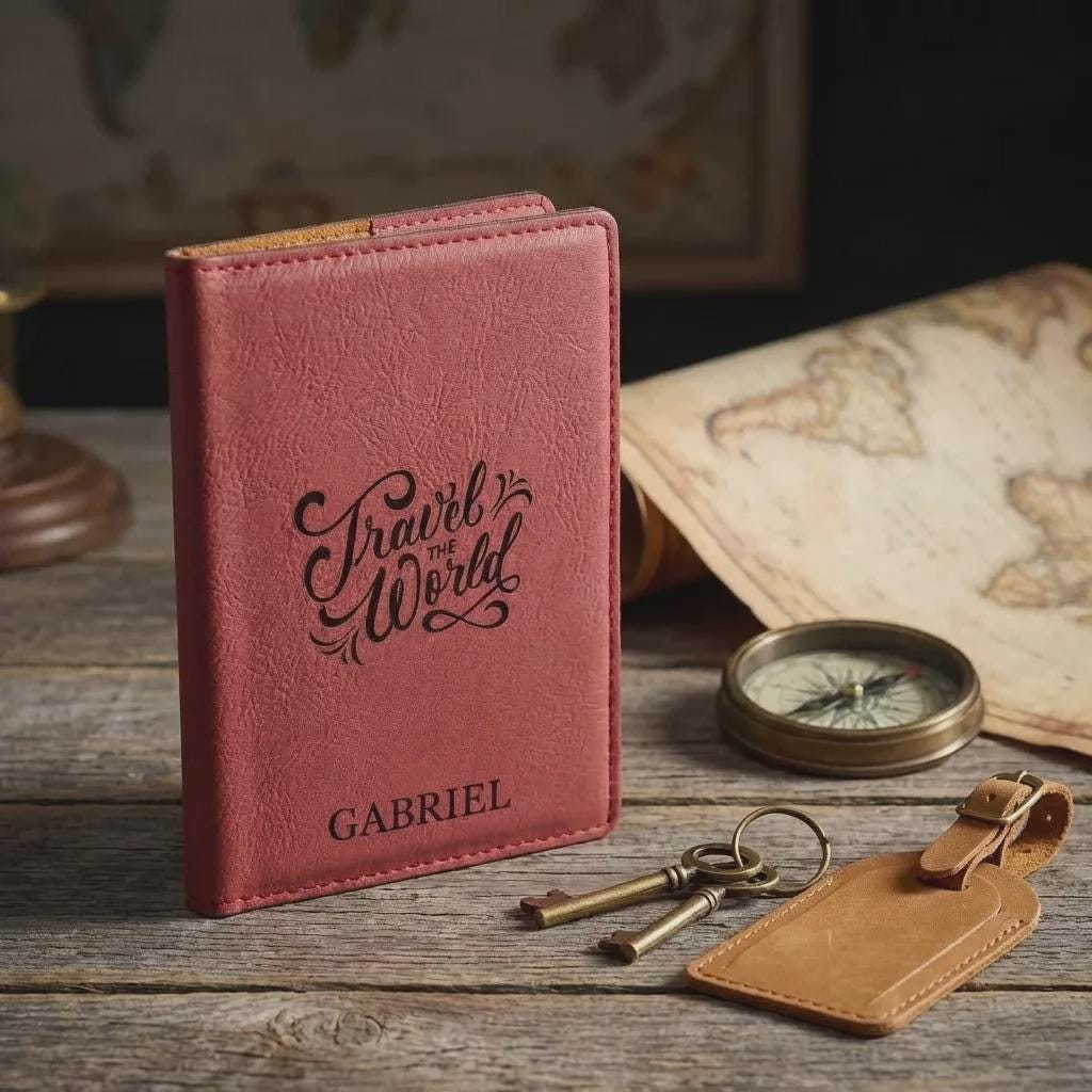 Inspire their next journey with this personalized passport holder. Featuring the adventurous 'Travel the World' design and a custom name, this engraved vegan leather wallet is the ultimate graduation gift or travel accessory for globetrotters