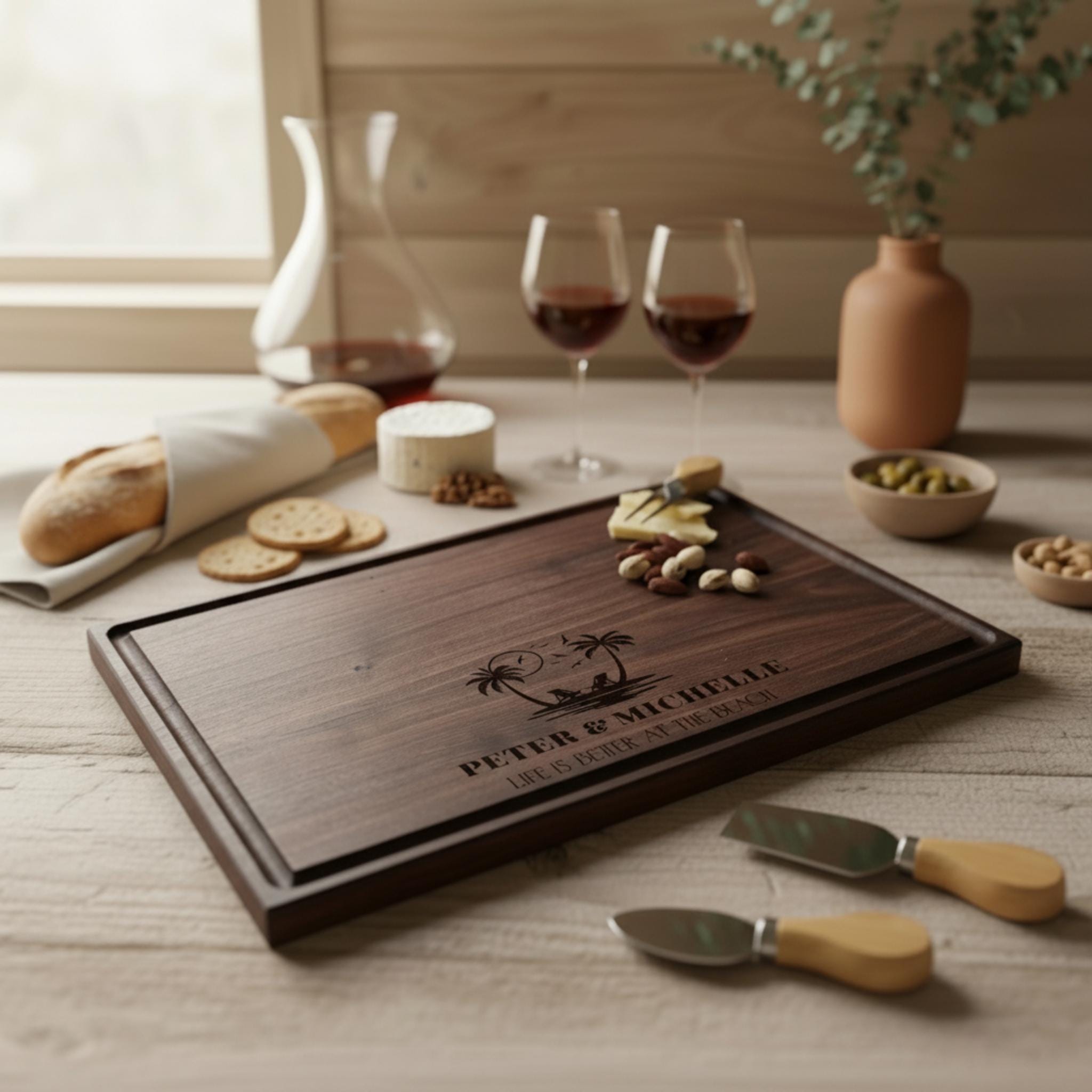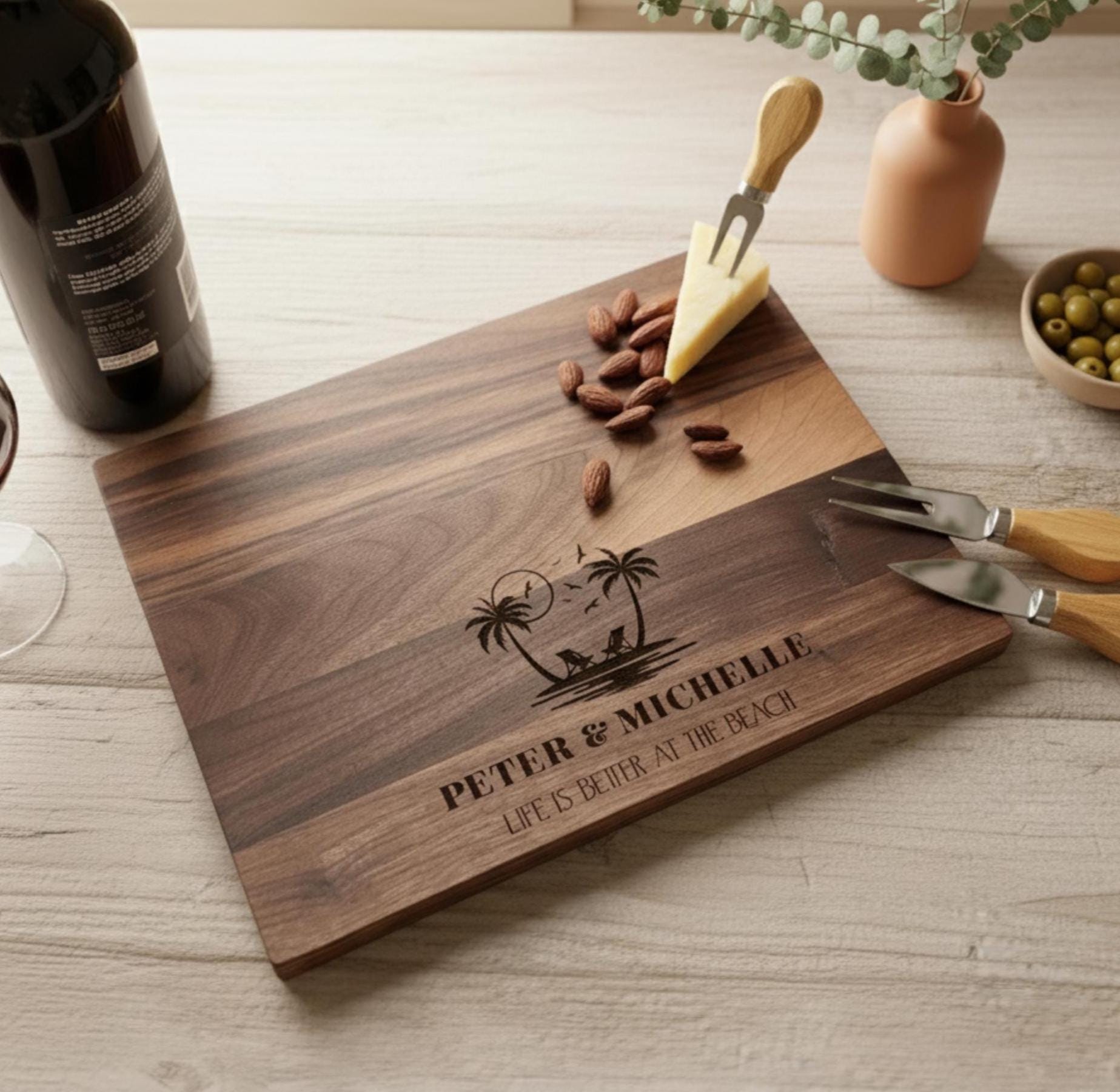 Custom Laser Engraving: Etched with the heartwarming phrase “Life Is Better at the Beach” alongside their names, this cutting board embodies their love for sand, sea, and serenity.