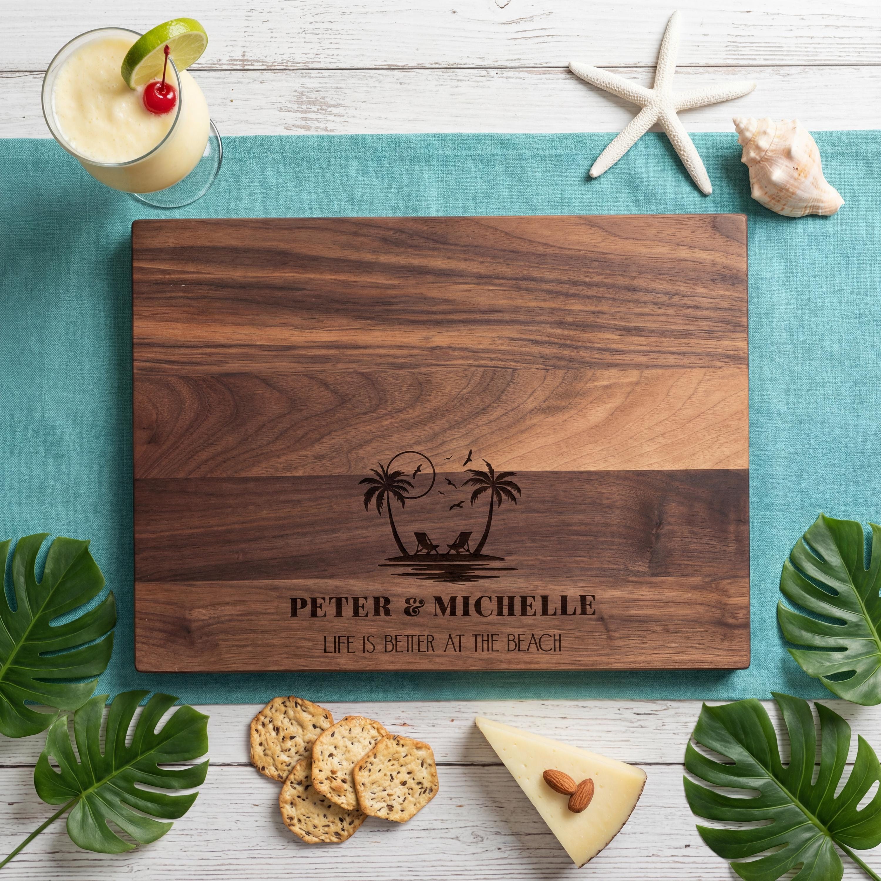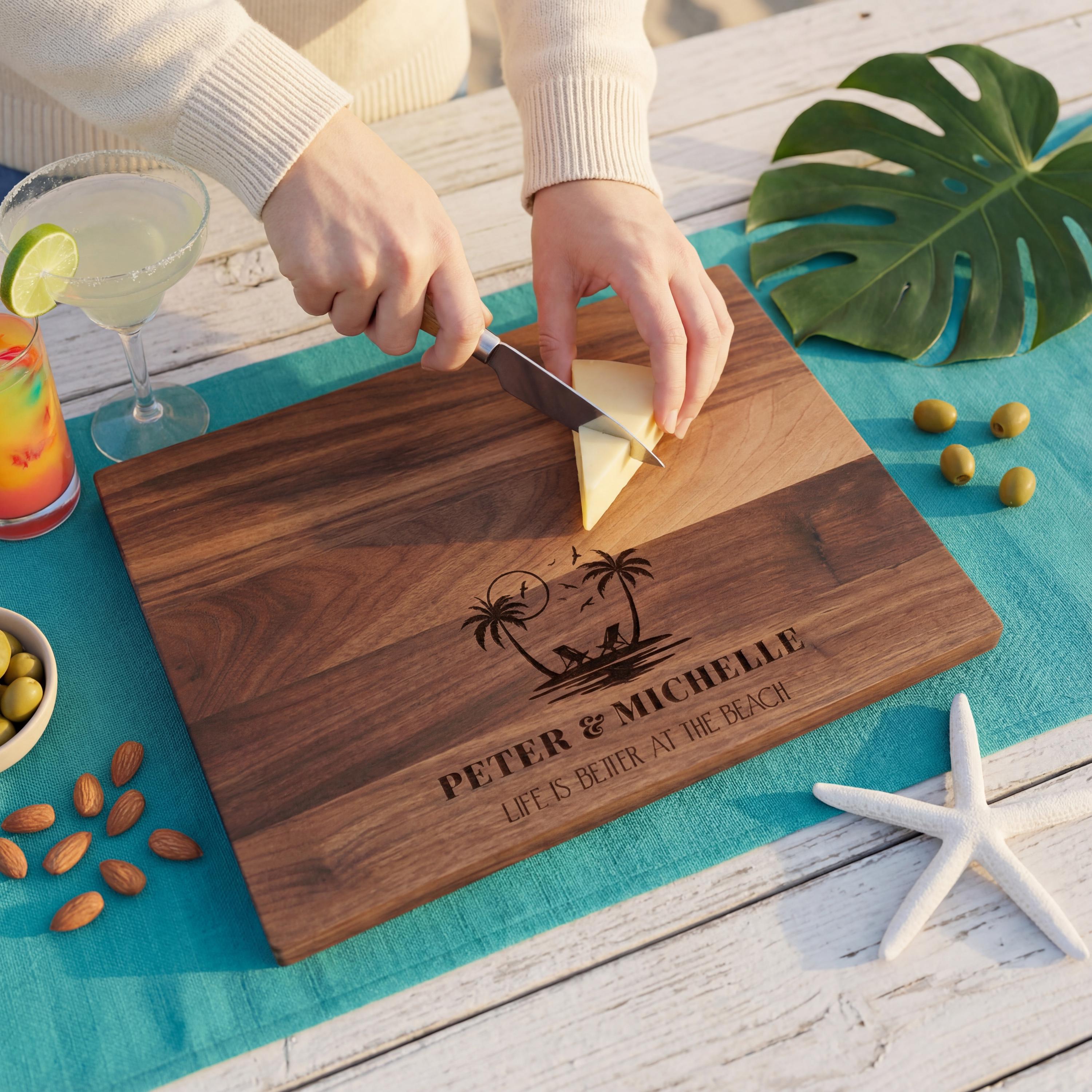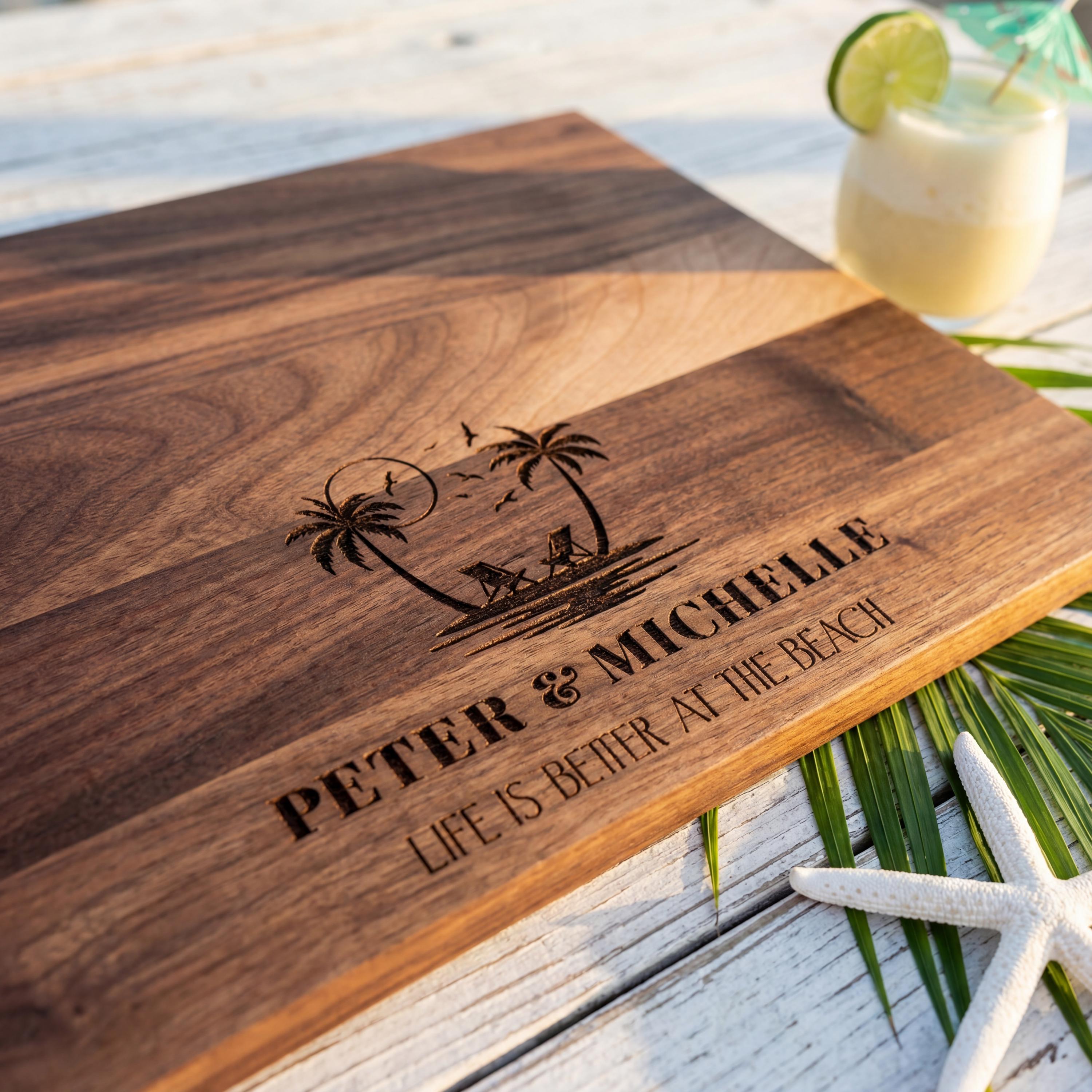 Custom Laser Engraving: Etched with the heartwarming phrase “Life Is Better at the Beach” alongside their names, this cutting board embodies their love for sand, sea, and serenity.
