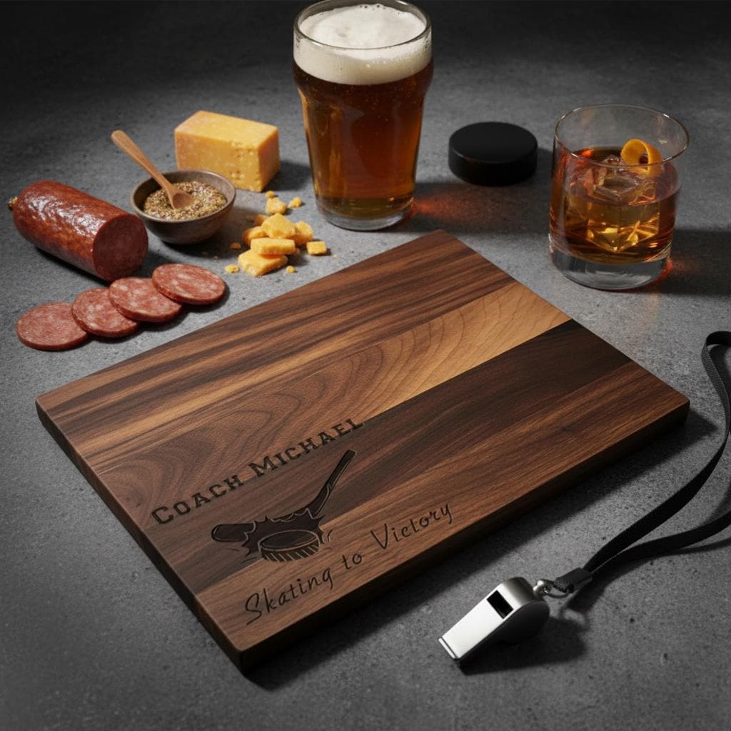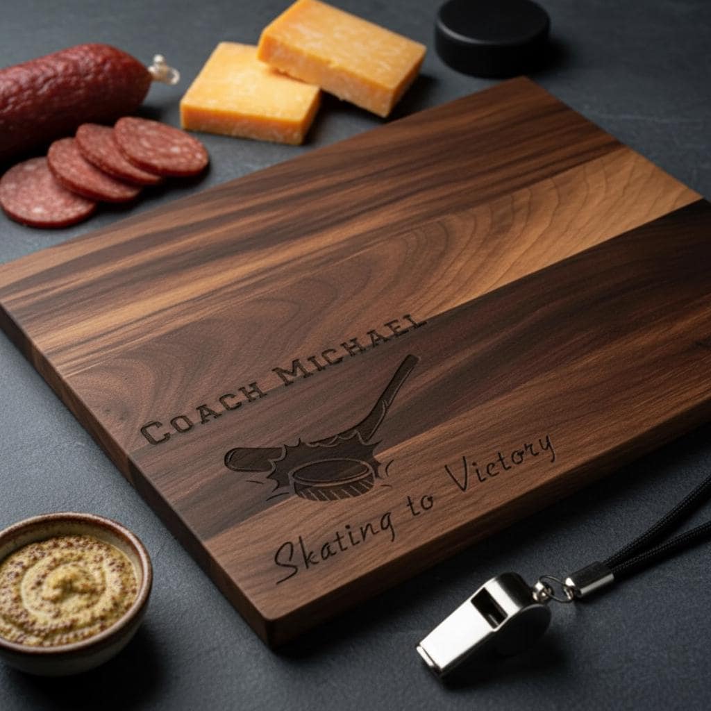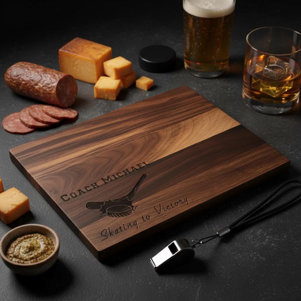 Custom Hockey-Themed Engraving: Featuring the phrase “Skating to Victory,” a detailed hockey stick and puck design, and their name, this cutting board is a one-of-a-kind tribute to your coach’s passion and effort.