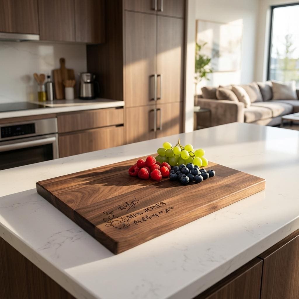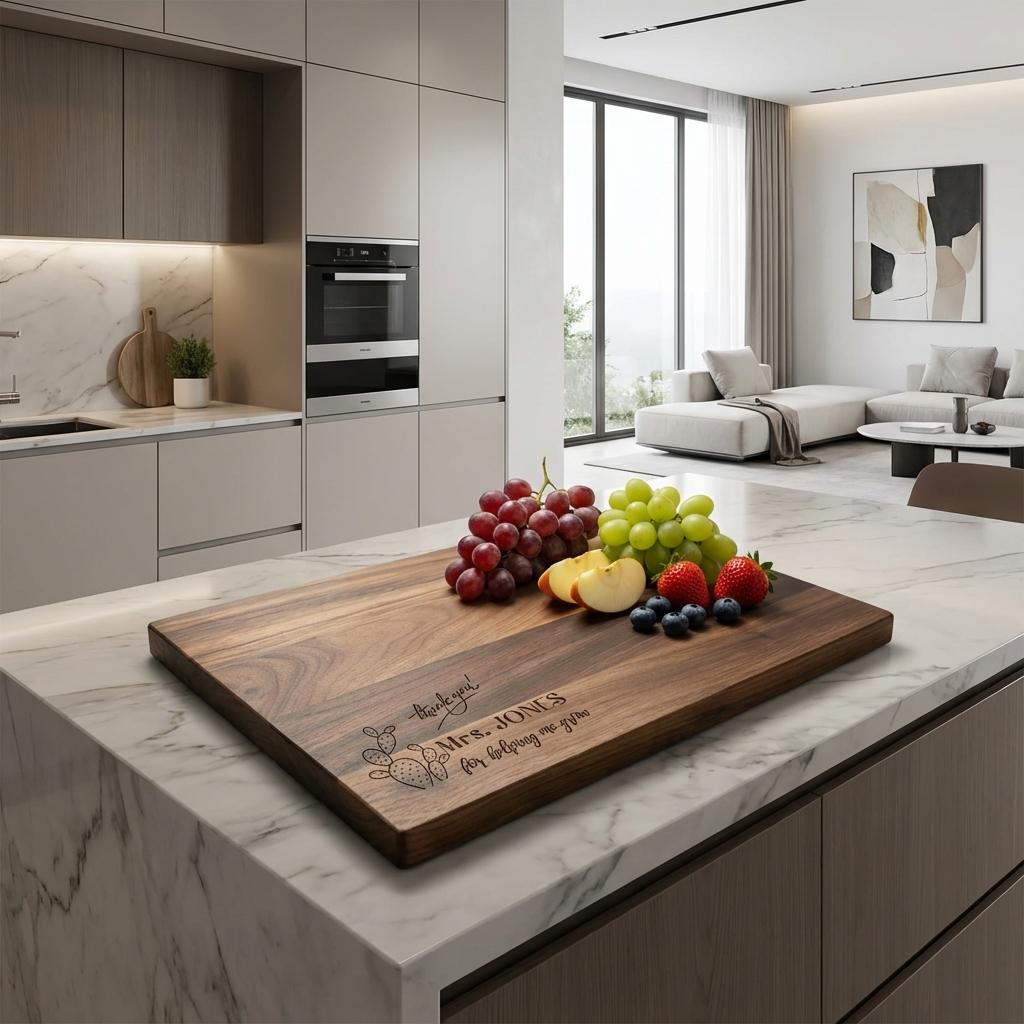 Custom Engraving for Teachers: Meticulously laser engraved with a plant design and the words "Thank You [Teacher’s Name] for Helping Me Grow," this cutting board is a heartfelt tribute to their influence and impact.