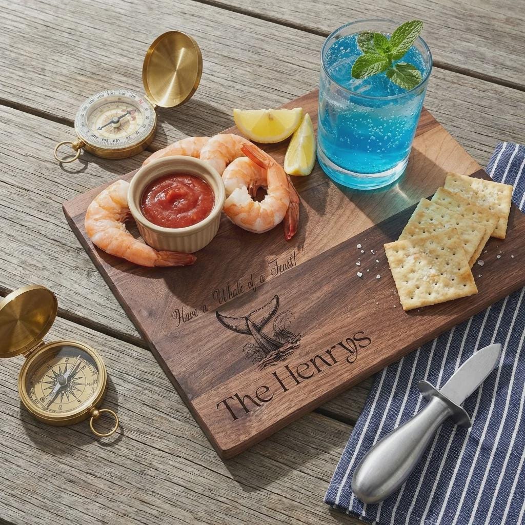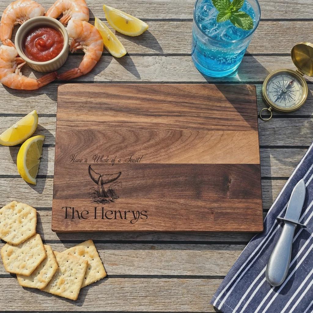 Elevate your space with our Nautical Personalized Cutting Board, boasting the playful motto "Have a Whale of a Feast!" This one-of-a-kind design features an artfully etched whale tail alongside your custom family name, turning it into both a practical kitchen tool and a cherished keepsake.